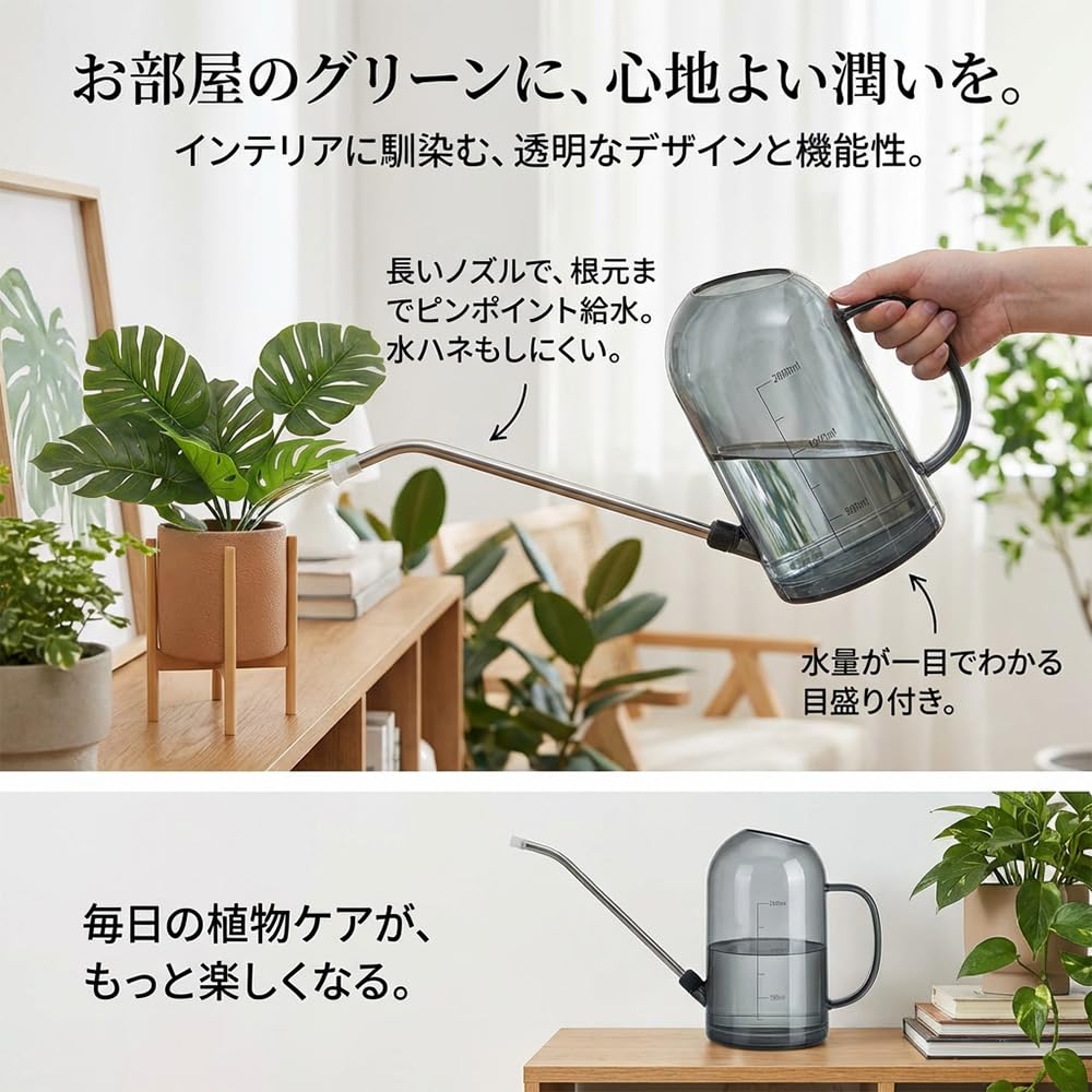 JetWave じょうろ 水差し 園芸 プラスチック製 透明ボディ 目盛り付き 1L容量 金属製23cm長い噴口 観葉植物やガーデニングに最適 園芸用品