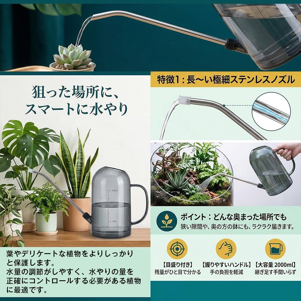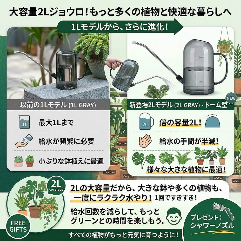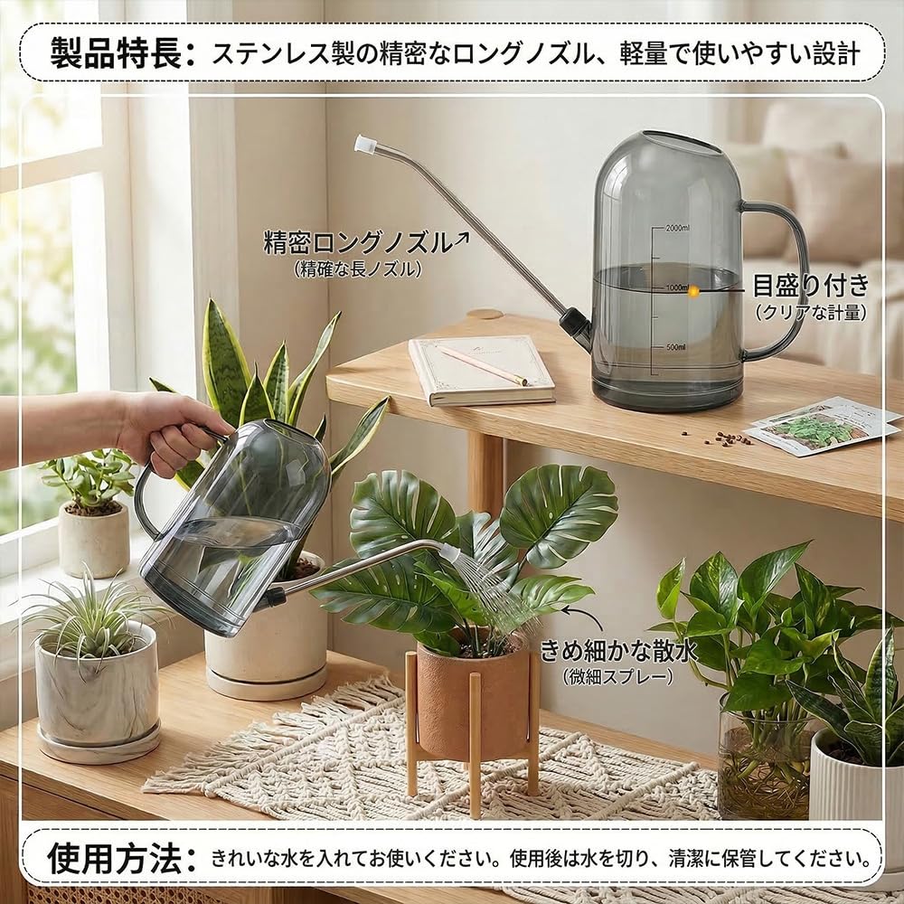 JetWave じょうろ 水差し 園芸 プラスチック製 透明ボディ 目盛り付き 1L容量 金属製23cm長い噴口 観葉植物やガーデニングに最適 園芸用品 (2L-グレー)