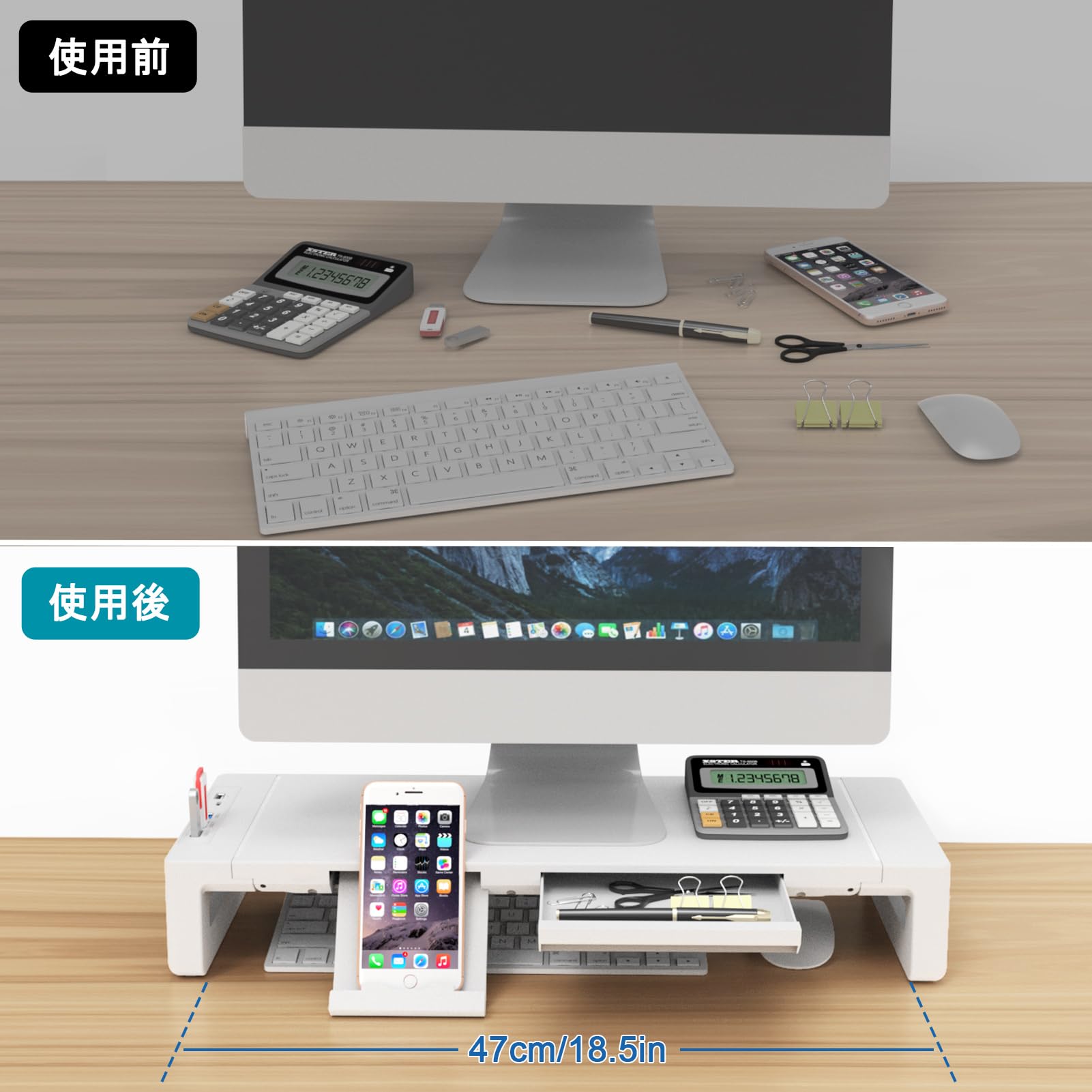 Fenge モニター台 卓上 モニタースタンド 机上台 パソコン台 机上ラック 108cm横幅 2段 木製天板 引き出し付き 高さ調整可能 モニタースタンド 机上台 pcモニター台 パソコンラック 卓上 収納 整理整頓ホワイトG04D2101A