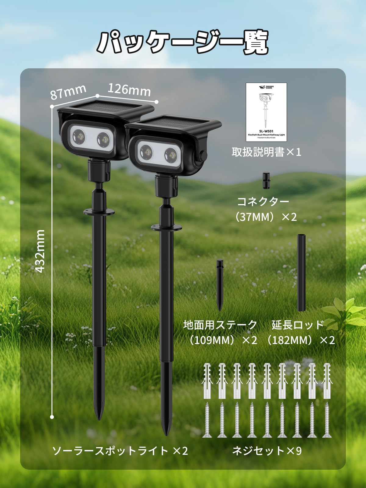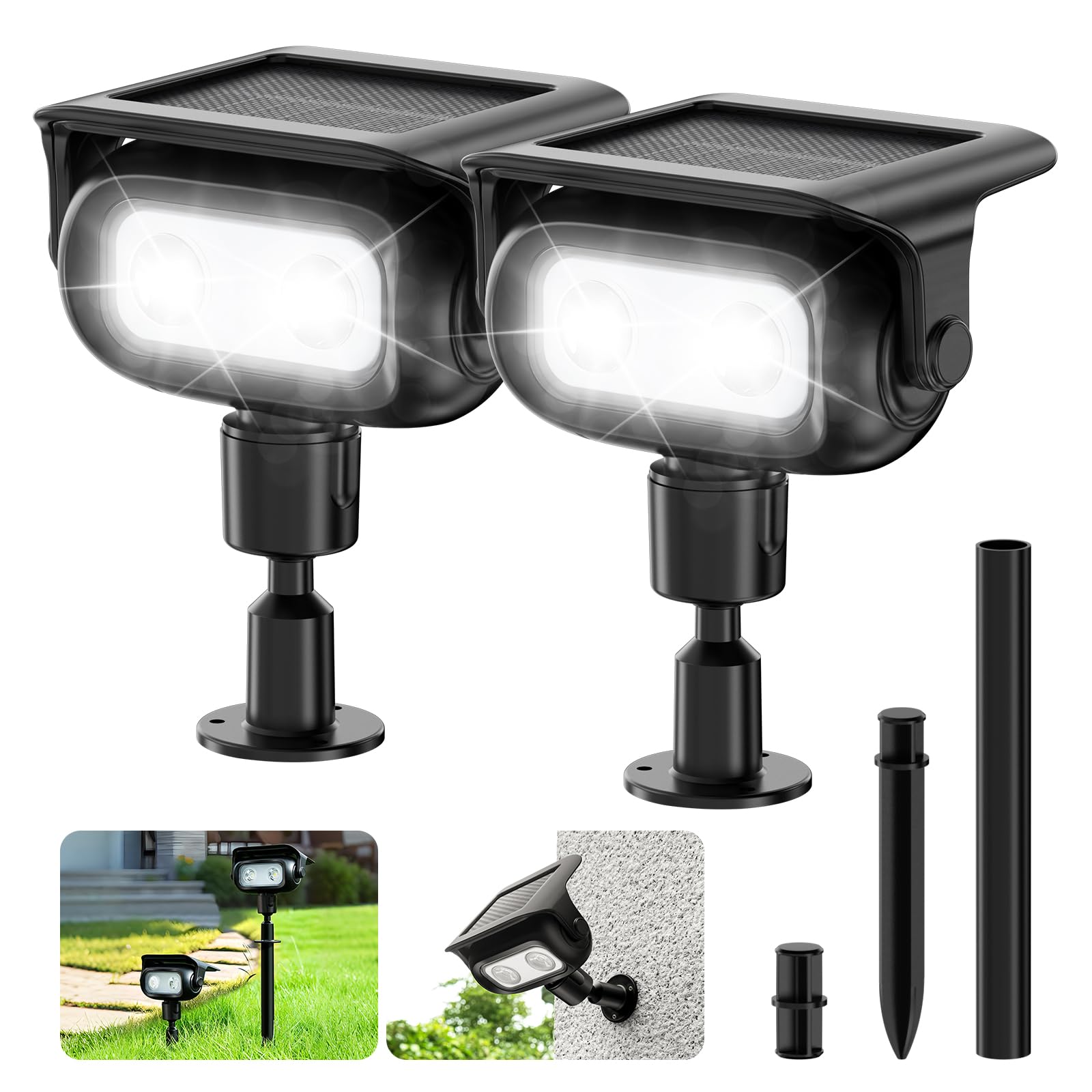 Smiling Shark ソーラースライト WS01【多角度調節可能・延長ポール付き・2WAY設置】高輝度ソーラースポットライト 高感度センサーライト 500LM 4モード切替 高耐久 HPBC高効率セル IP65防水 1200mAh 10時間連続点灯 取り付け簡単 地置き&壁掛け 屋外照明 外灯 ガーデン/駐車場/玄関/ベランダ 防犯対策 (2個入り, 白光)