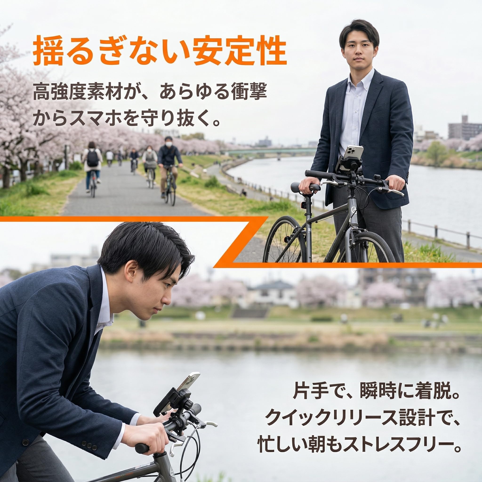 自転車用スマホホルダーは、回転式クランプアームにより工具不要で簡単に取り付けられ、強力な固定力で悪路でもガタつかずスマホを守ります。 初回設定時は右側ロックを閉じ、ダイヤルで幅を調整するだけで簡単に固定。 以降はワンタッチロックで素早くスマホの着脱が可能で、忙しい朝の通勤・通学にも最適です。 360° 無段階回転機能により、縦向き・横向きなど自由に角度調整ができ、ナビゲーションや音楽操作がしやすくなります。 クランプ内径は 75mm~95mm に対応し、4.7 インチ以上の多くのスマホ機種に対応。 カメラ部分を遮らない設計なので、撮影の邪魔になりません。 コンパクトなサイズ(14×10×9.5cm)で使い勝手が良く、自転車通勤者、通学者、サイクリング愛好家、配達業務の方など、幅広い層におすすめです。 安定性・利便性・機能性を兼ね備えた、自転車アクセサリーの必需品です。