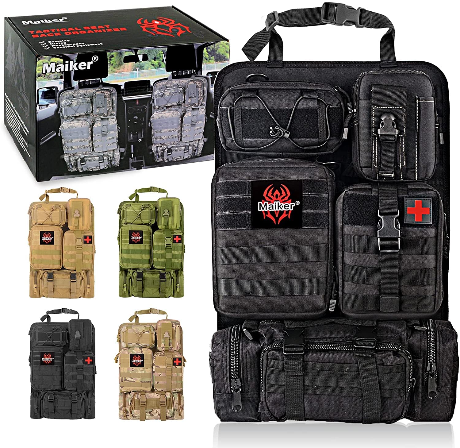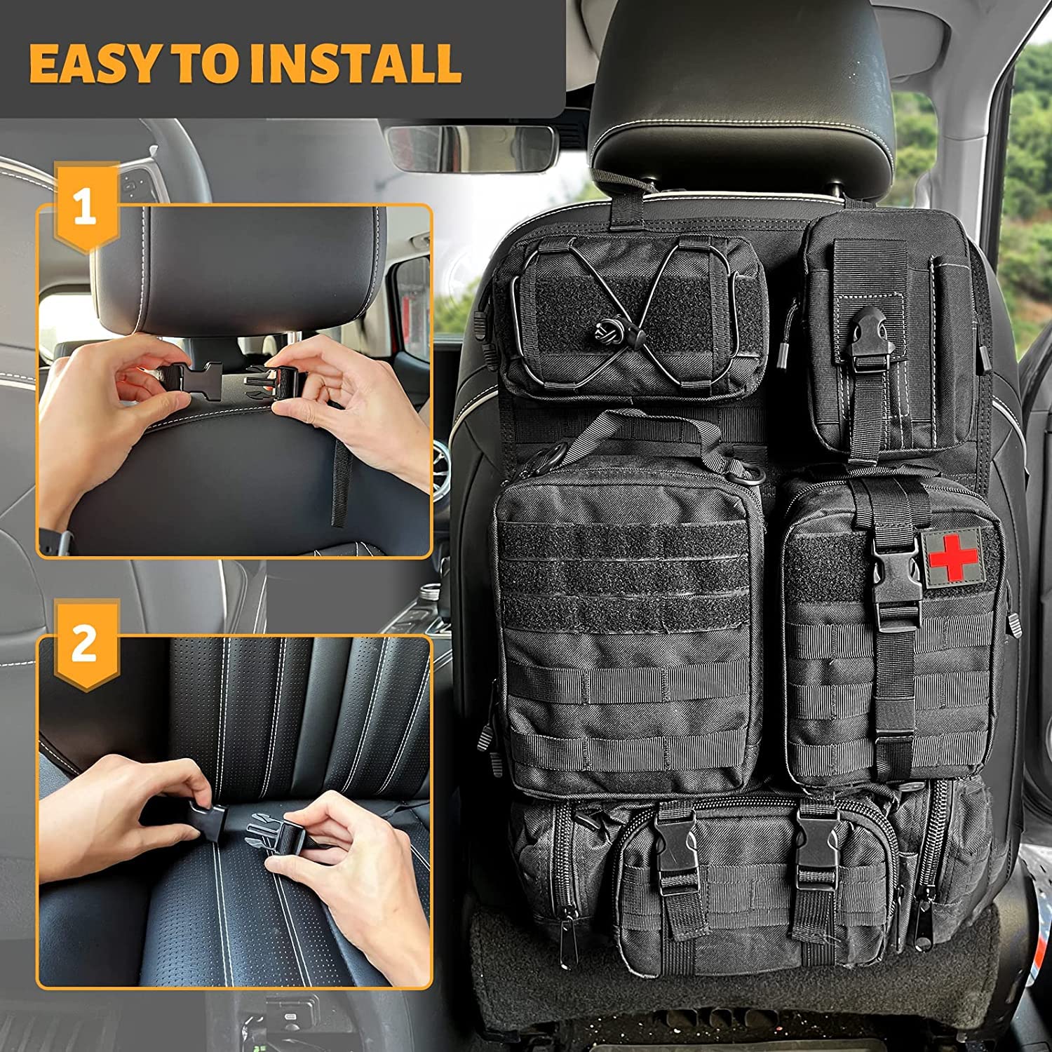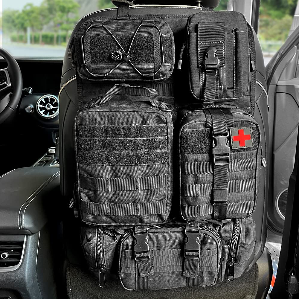 FUNY タクティカルカーシートバックオーガナイザー アップグレードタクティカルビークルパネルオーガナイザー 取り外し可能なモールポーチ5個付き ほとんどの車両にユニバーサルフィット (ブラック)