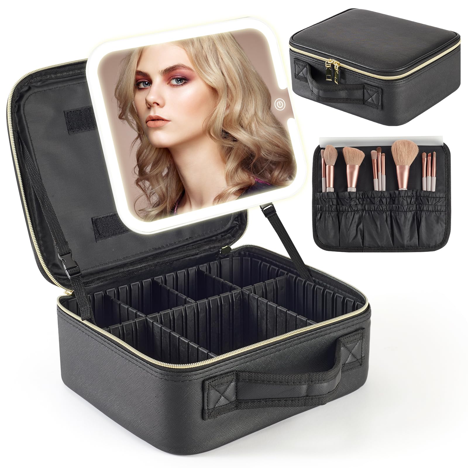 鏡付きメイクボックス 化粧品収納ボックス コスメボックス 化粧ケース 調節可能な仕切り付き 取り外し可能なライト付きミラー 3色調節可能なLEDライト メイクブラシケース付き 自立式 ハンドル付き 通勤・出張・旅行用 (ブラック, 横26.5cm x 縦26.5cm)