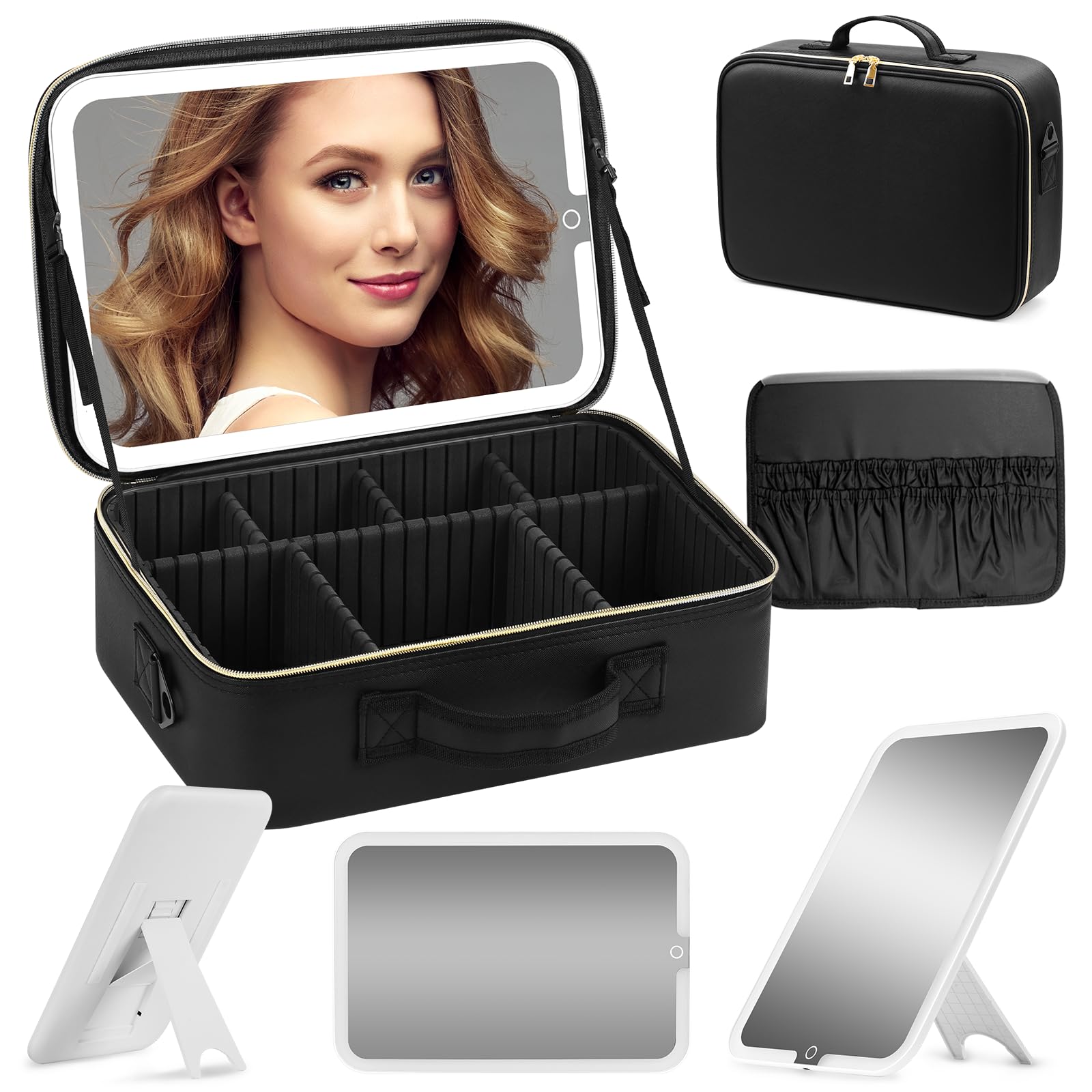 鏡付きメイクボックス 化粧品収納ボックス コスメボックス 化粧ケース 調節可能な仕切り付き 取り外し可能なライト付きミラー 3色調節可能なLEDライト メイクブラシケース付き 自立式 ハンドル付き 通勤・出張・旅行用 (ブラック, 横38cm×縦28cm)