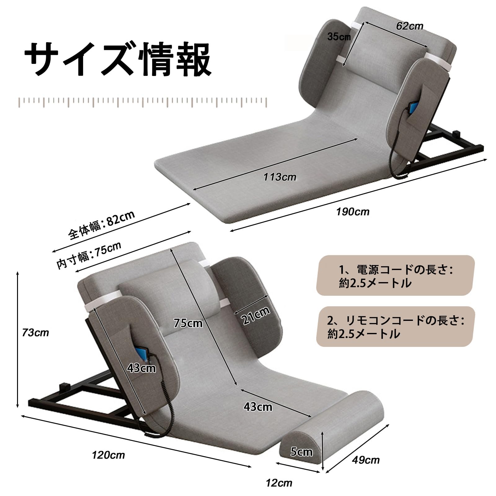 Monliguet 電動 背もたれ 電動リクライニング ベッド 起き上がり補助 介護ベッド用 電動座椅子 後付けタイプ 角度調整 2~80° 折りたたみ可能 リモコン付き 静音モーター 高齢者 家庭用 介護用 背もたれ 背起こし補助 日本語取説付き (ロング, ガードなし)