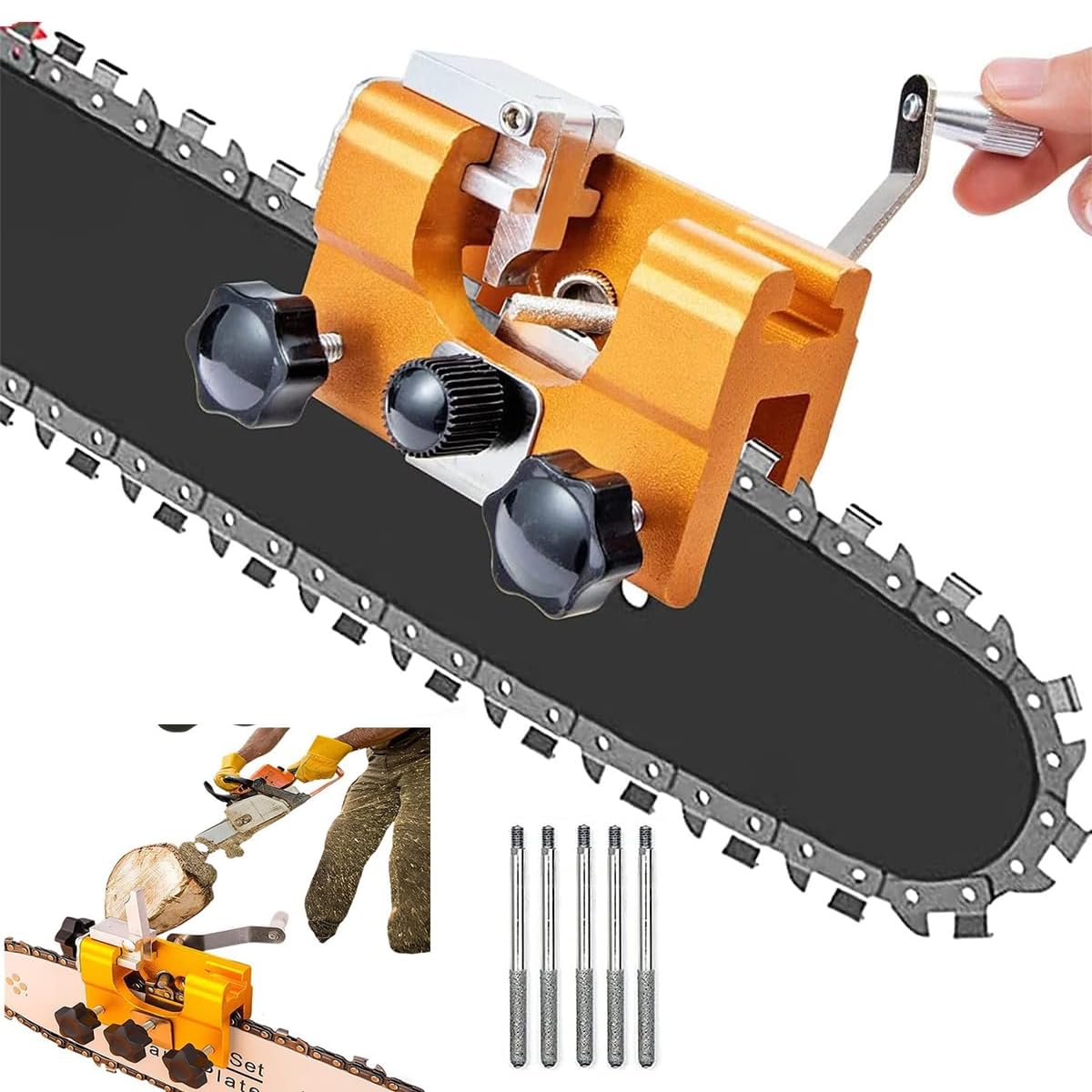 チェーンソー 目立て機 ポータブル手動式刃研ぎツールセット 携帯用チェーンソー研磨機 5つの研削ヘッドの30°鋭利なフロントアングル 防護 軽量で持ち運びが簡単 電気/ガソリン鋸式対応 木工用 家庭 園芸 ガーデン 林業・DIY 用 チェーンの長寿命化