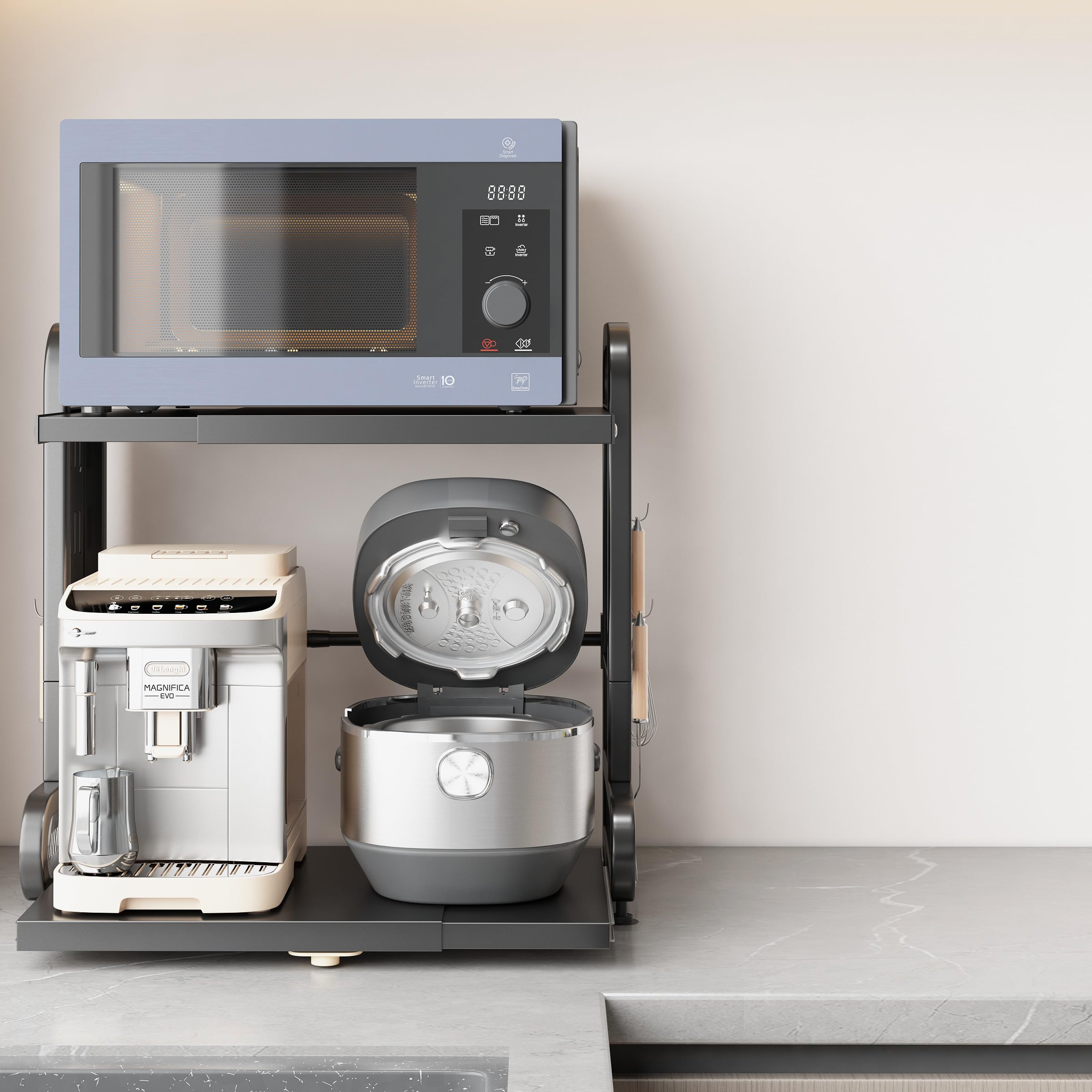 レンジ上ラック 伸縮式 幅38~62cm調節 トースターラック 電子レンジ 台収納 キッチン収納 高耐荷設計 フック6つ付き 組み立て簡単 底部の引き出し可能 2段(ブラック)
