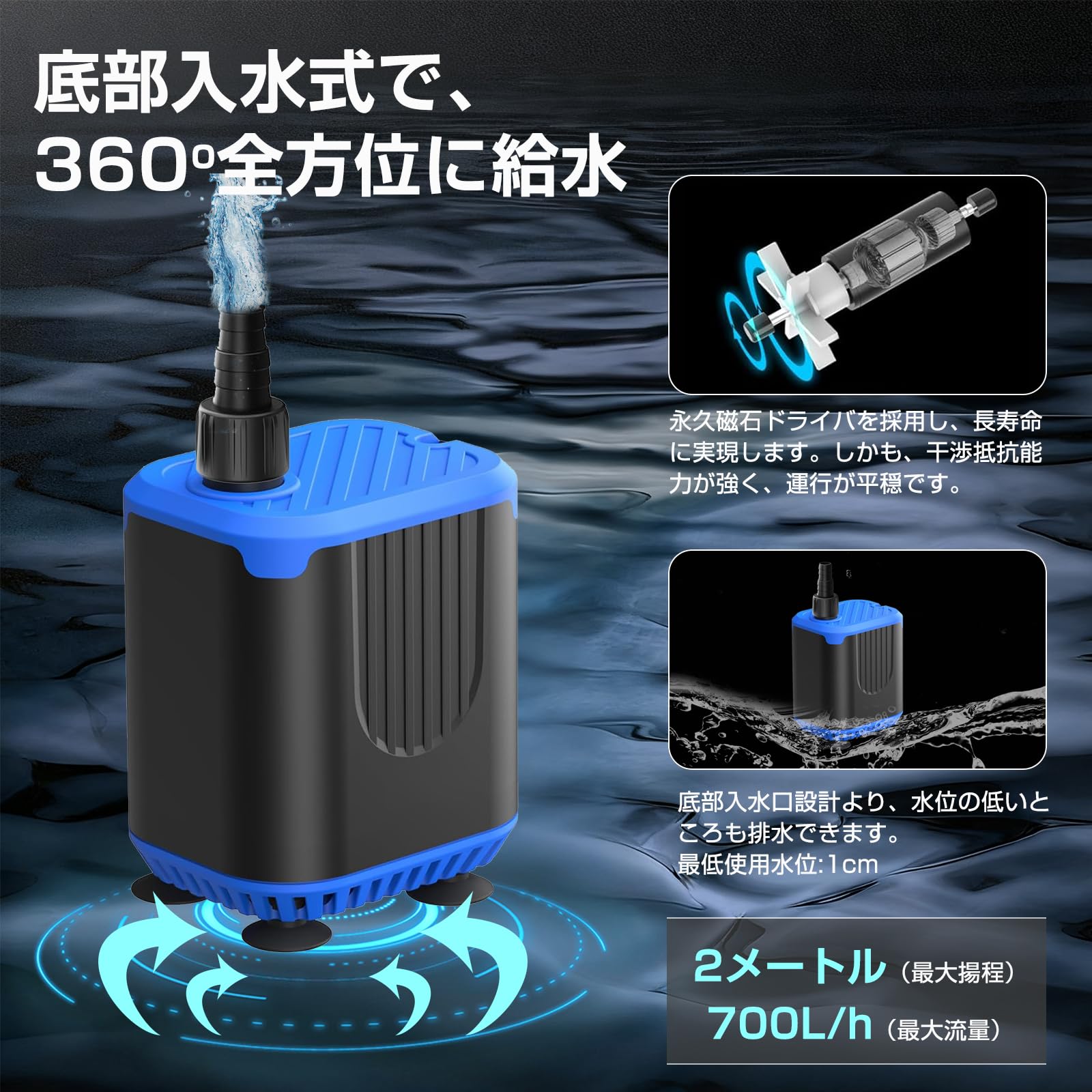 水中ポンプ 小型 4段階流量調整 THYESCOM 循環ポンプ 底部入水式 コントローラー付き給水・排水ポンプ 給餌モード搭載ウォーターポンプ 最大吐出量700L/H 最大揚程2M 静音 2種類ノズル付き 水槽・池・噴水・水耕栽培・淡水/海水対応 1.5mホース付き (10W)