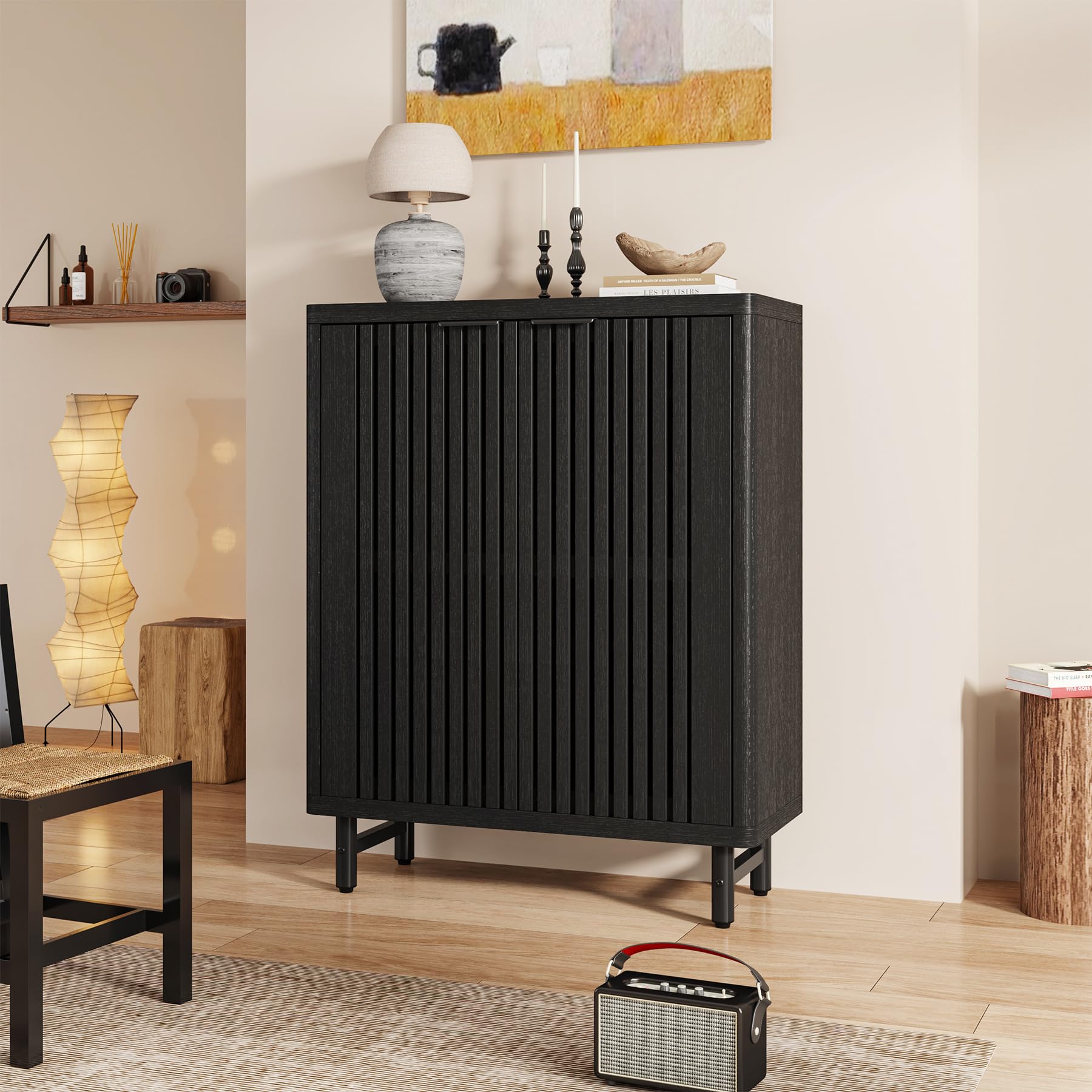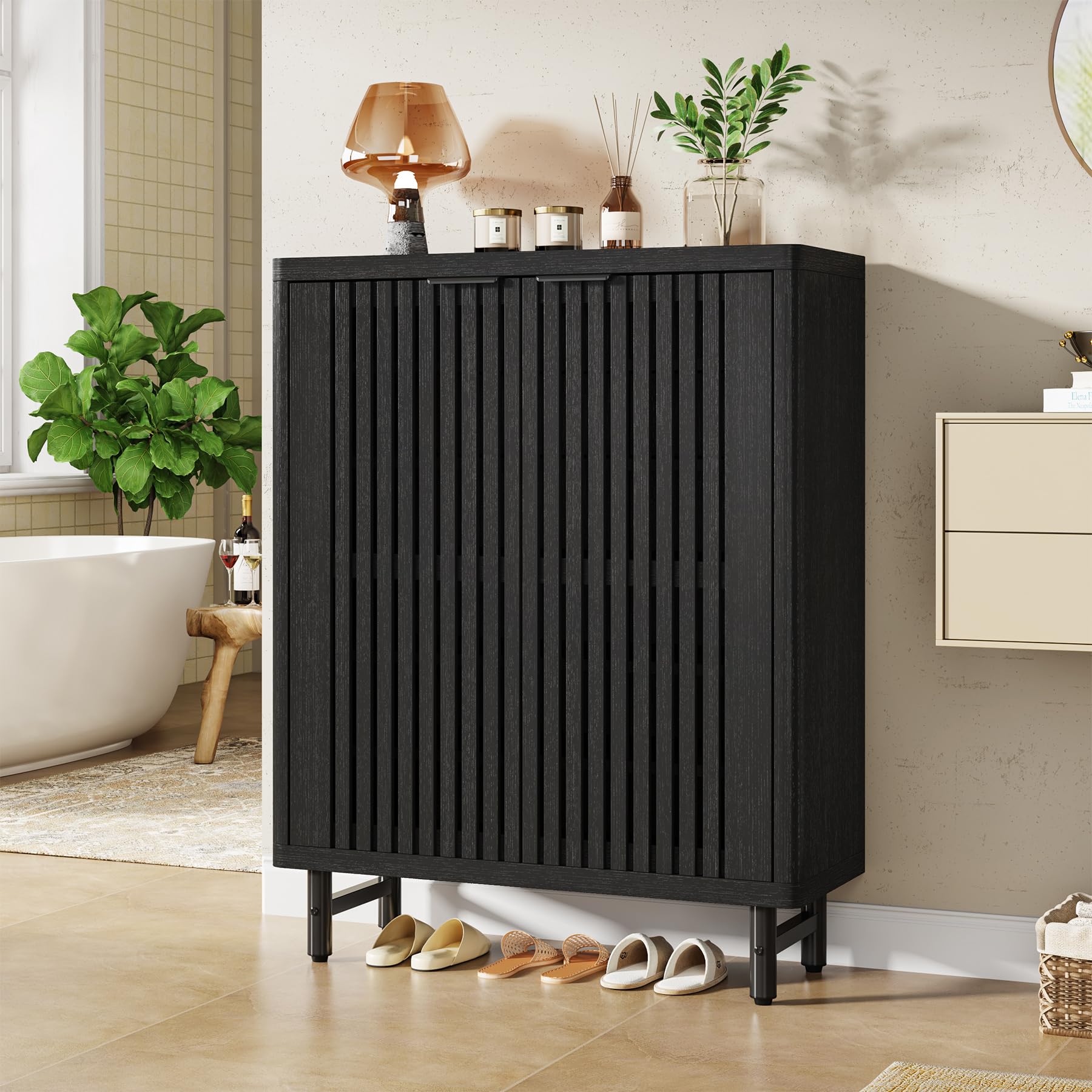 Tribesigns 6段 バスルームフロアキャビネット シャッタードア2つ付き 調節可能な棚付き木製バスルーム収納キャビネット バスルーム/キッチン/リビングルーム用の大きなサイドボード収納庫 (ブラック)