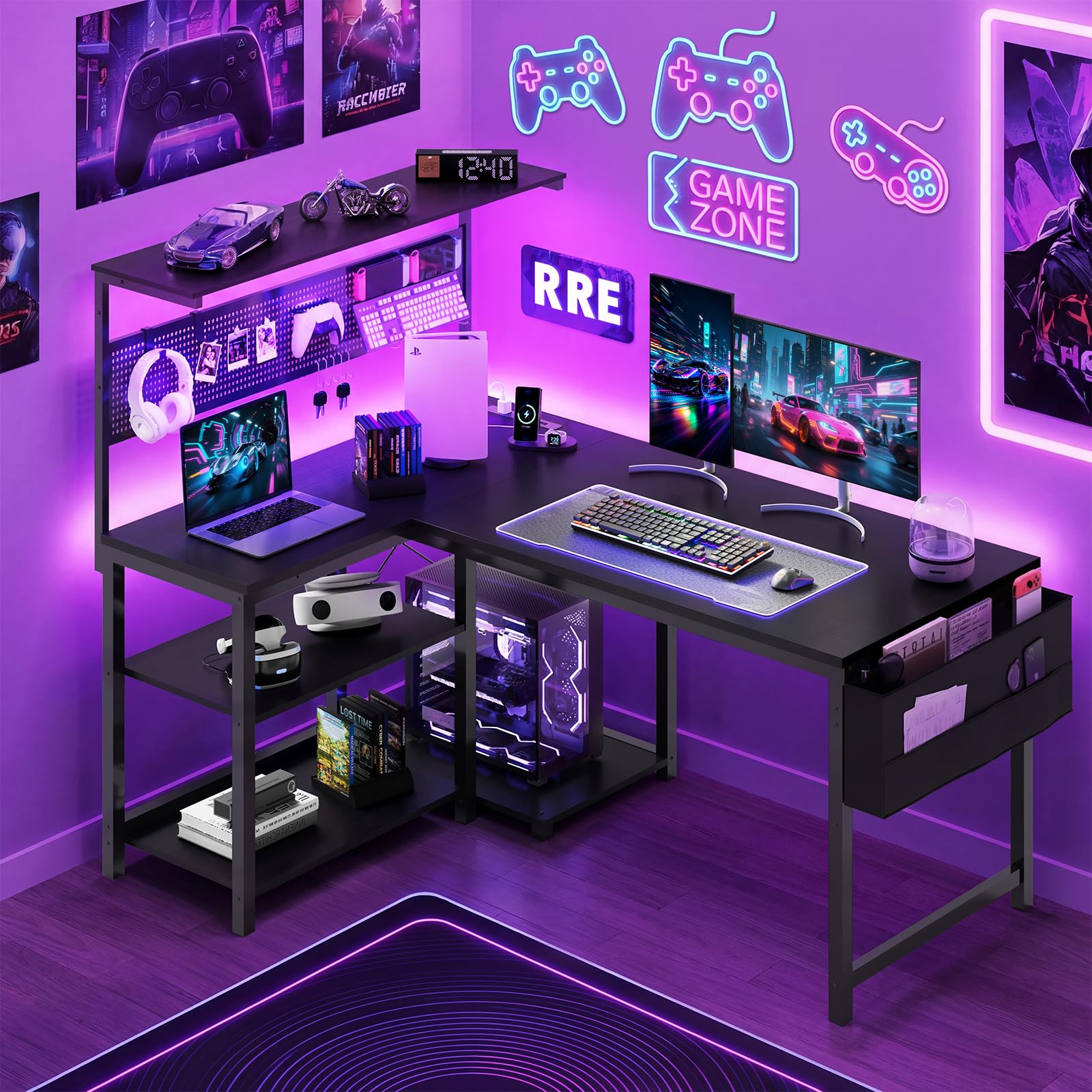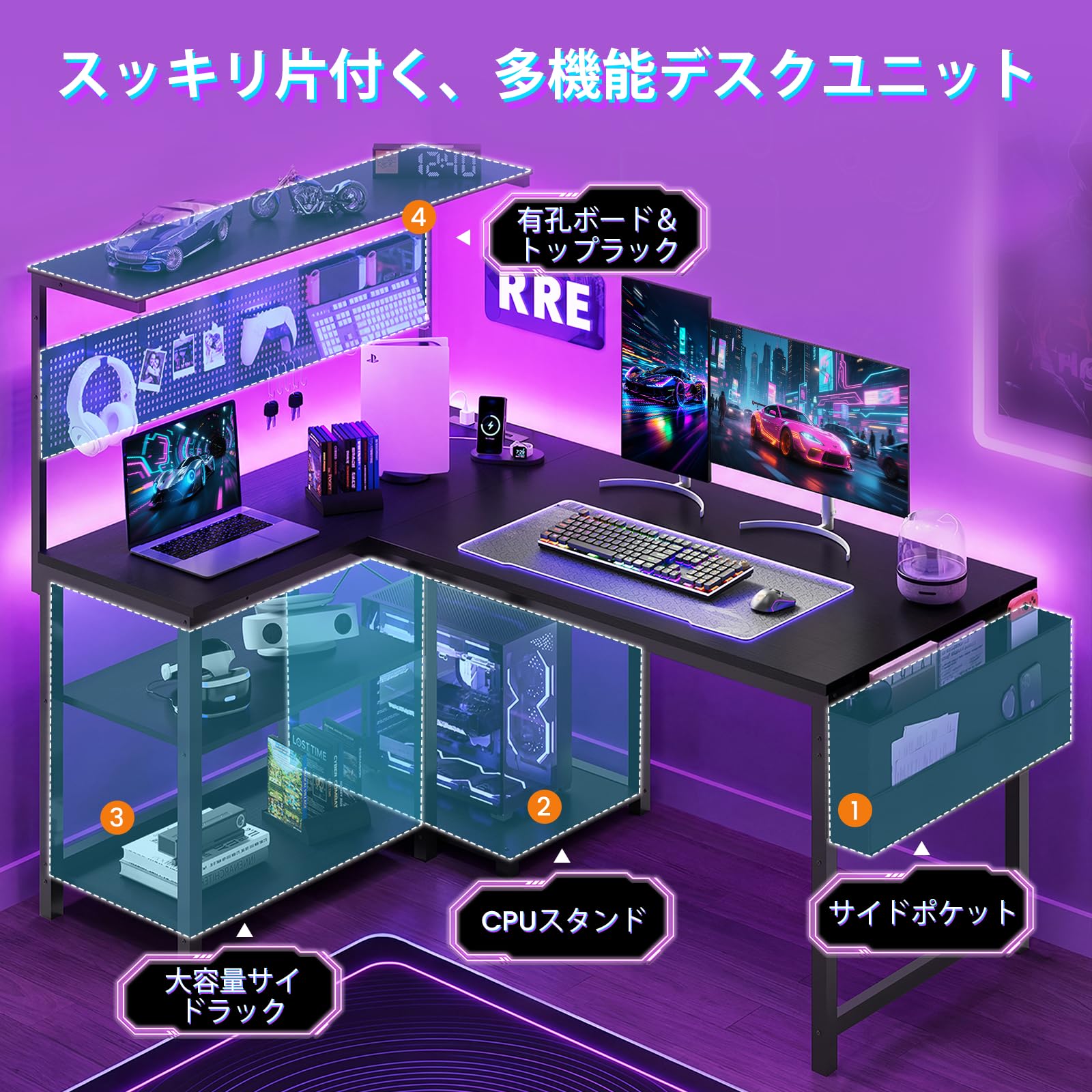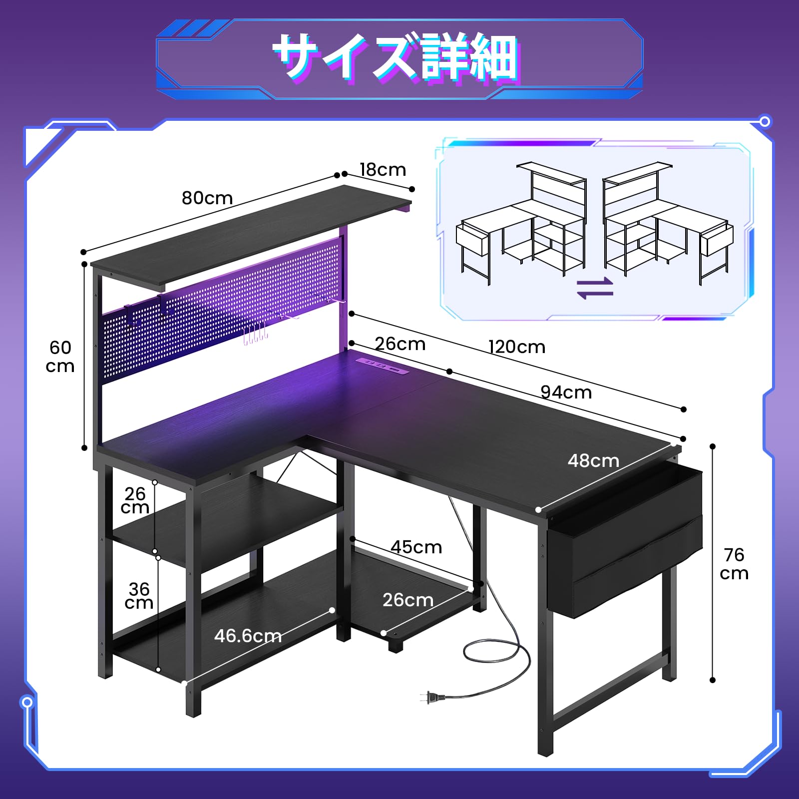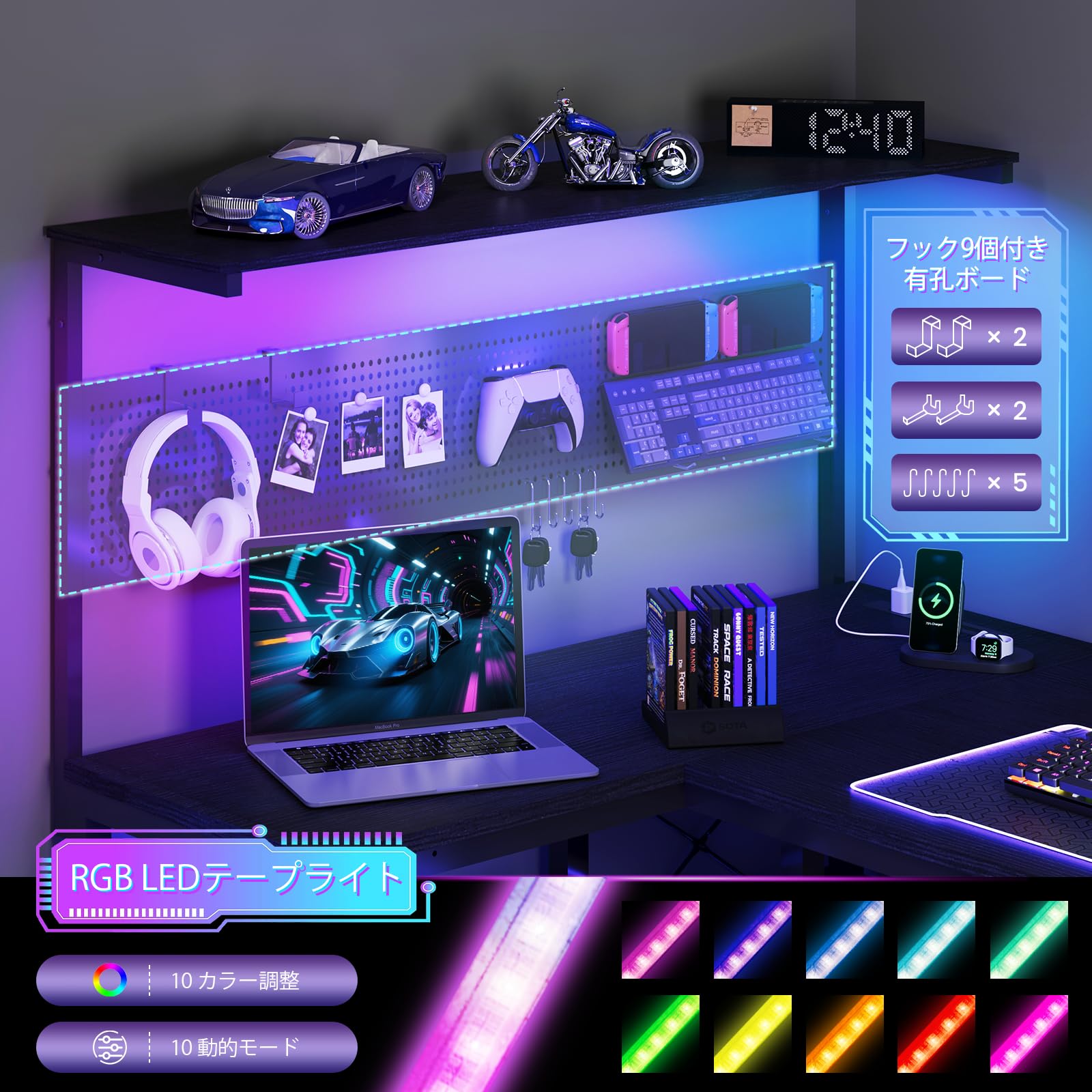 YOUDENOVA ゲーミングデスク L字デスク パソコンデスク 幅120cm ペグボード付き LEDライト 電源コンセント/USBポート付き 左右入れ替え可能 収納ラック/サイドポケット付き PCデスク オフィスデスク ワークデスク 勉強机 在宅勤務 省スペース 組立簡単 ブラック