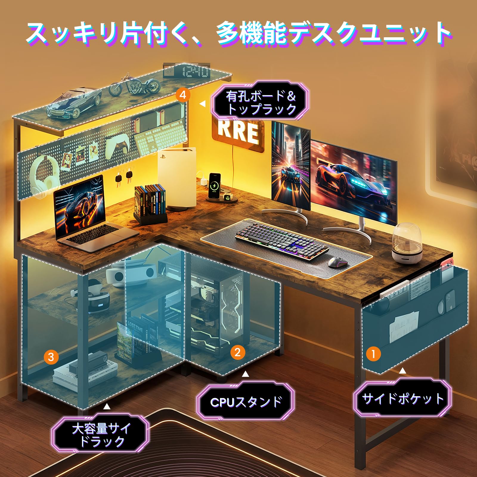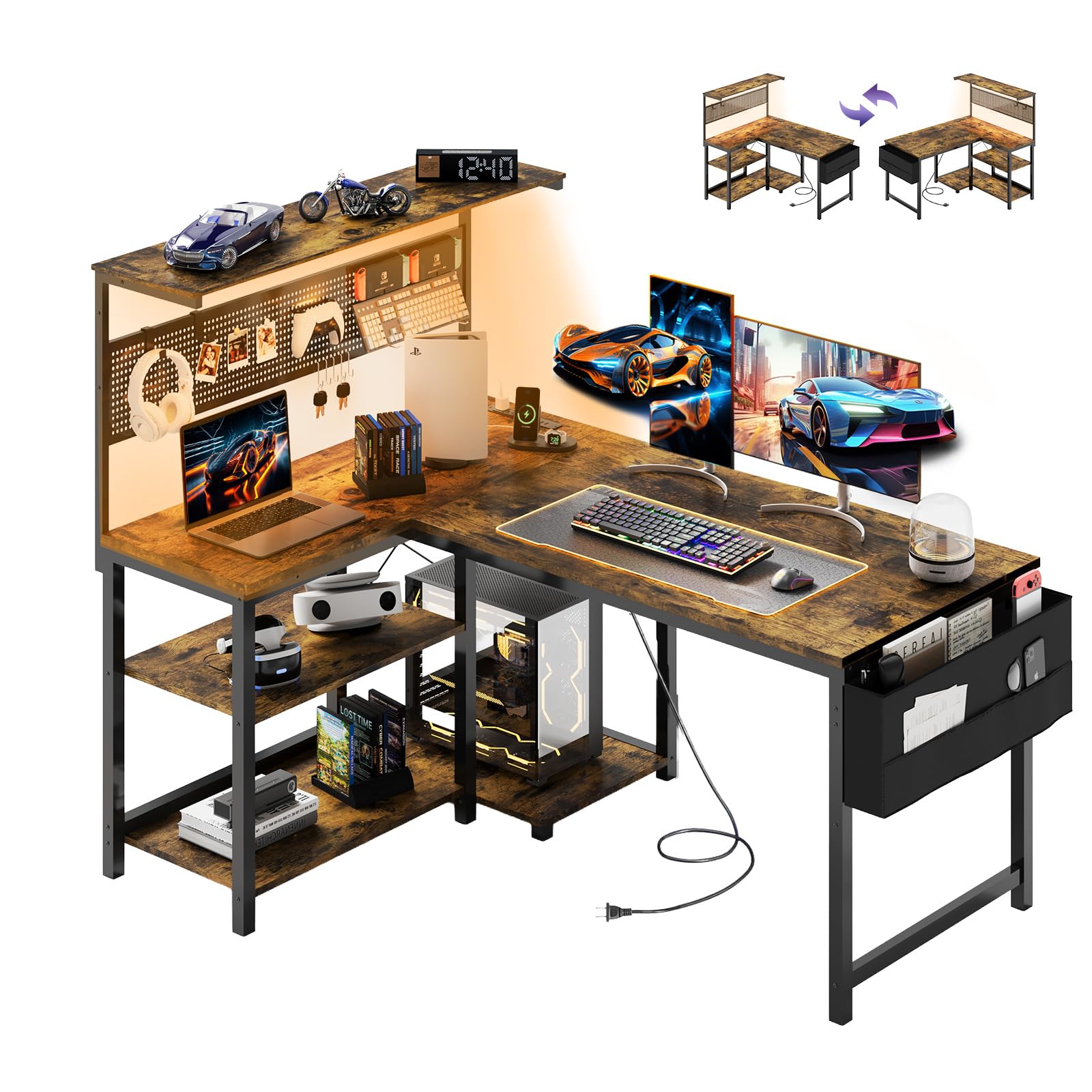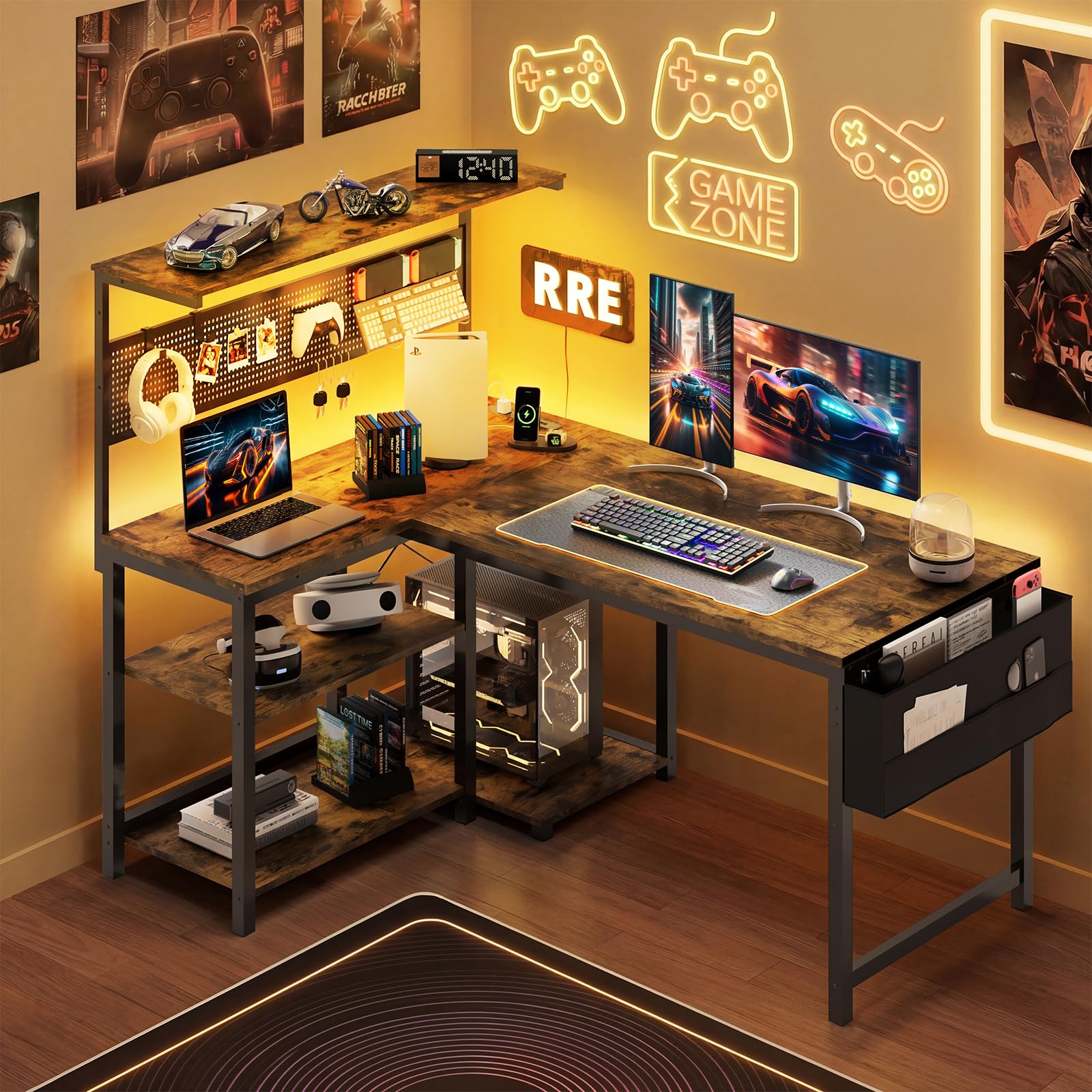YOUDENOVA ゲーミングデスク L字デスク パソコンデスク 幅120cm ペグボード付き LEDライト 電源コンセント/USBポート付き 左右入れ替え可能 収納ラック/サイドポケット付き PCデスク オフィスデスク ワークデスク 勉強机 在宅勤務 省スペース 組立簡単 ビンテージ