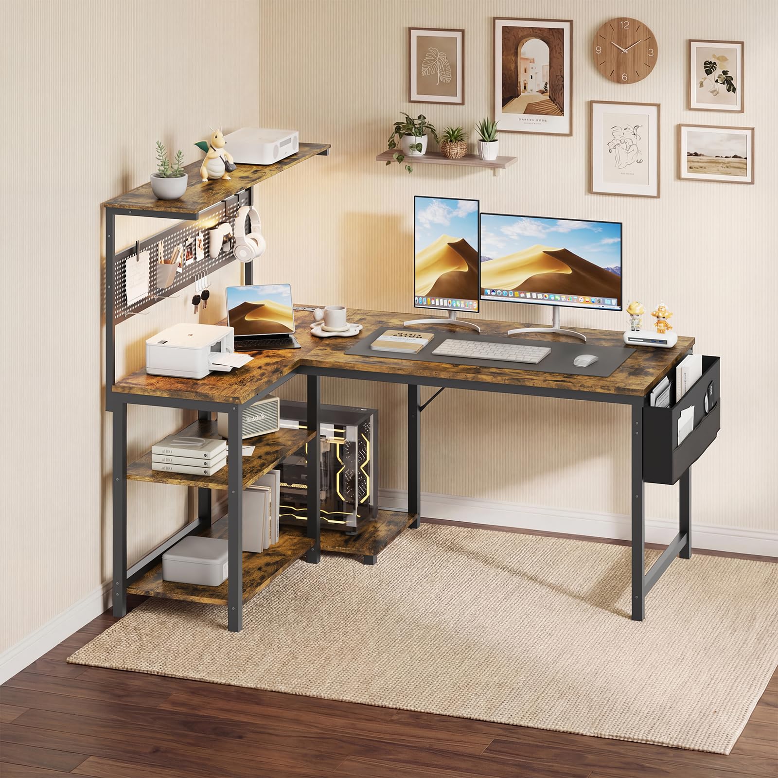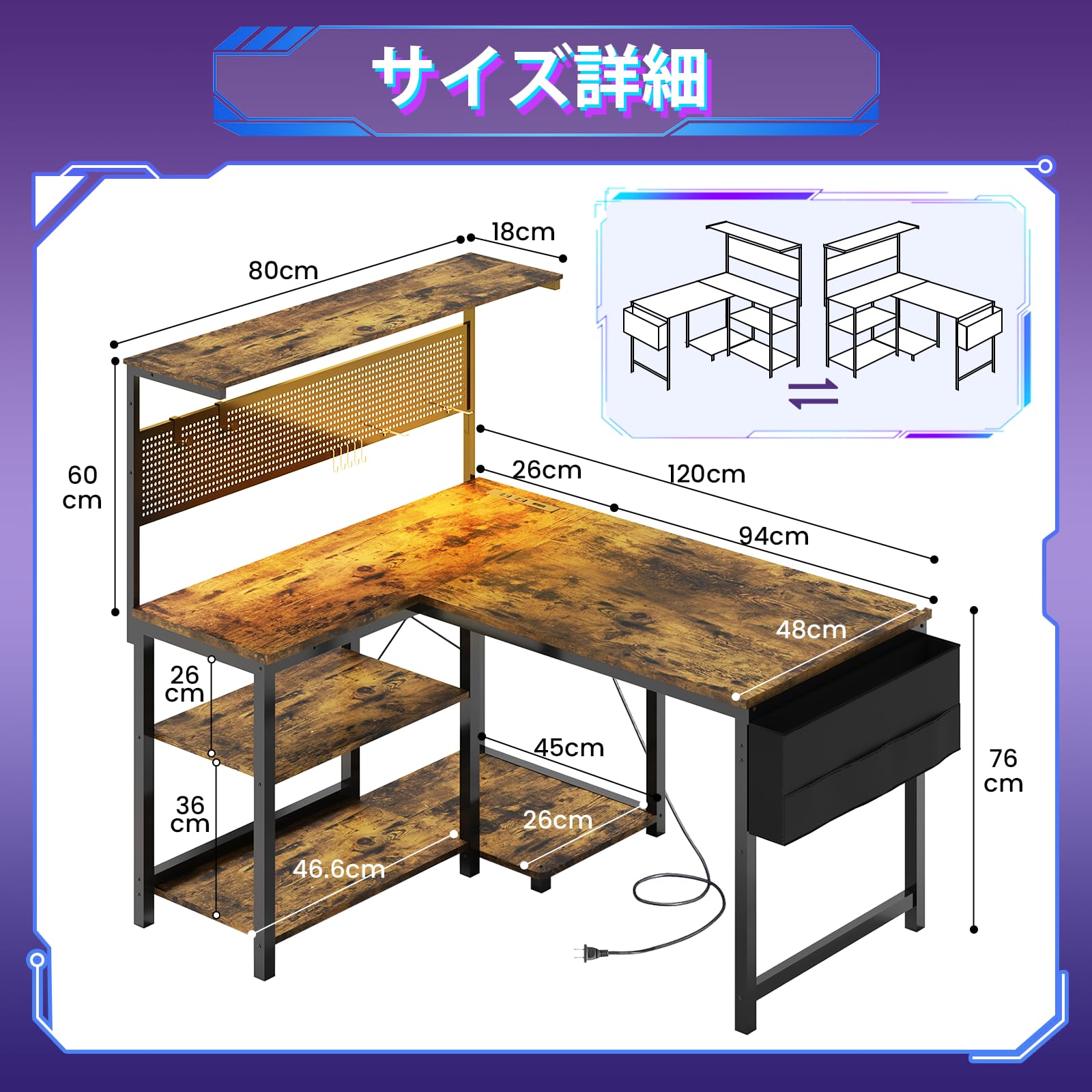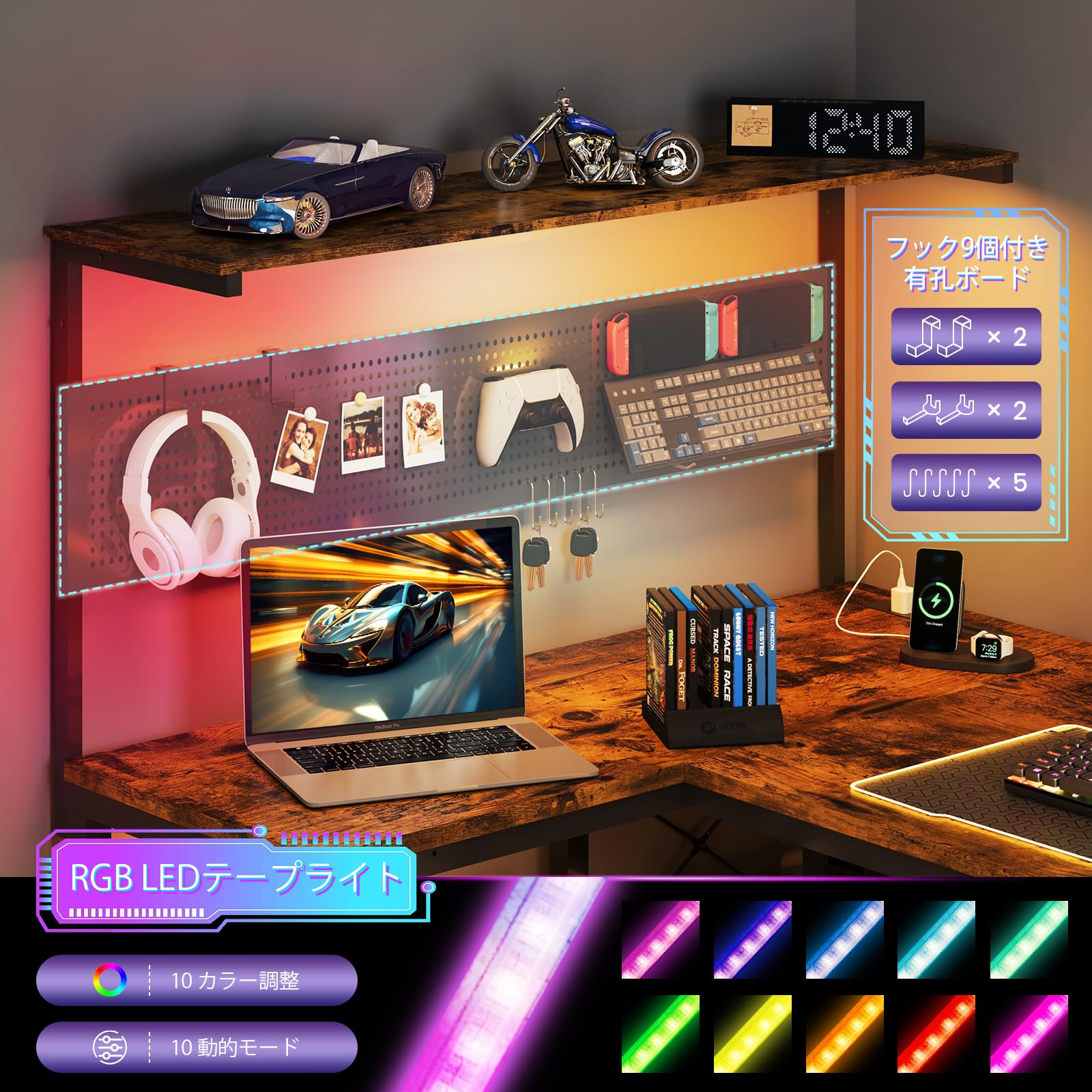 YOUDENOVA ゲーミングデスク L字デスク パソコンデスク 幅120cm ペグボード付き LEDライト 電源コンセント/USBポート付き 左右入れ替え可能 収納ラック/サイドポケット付き PCデスク オフィスデスク ワークデスク 勉強机 在宅勤務 省スペース 組立簡単 ビンテージ