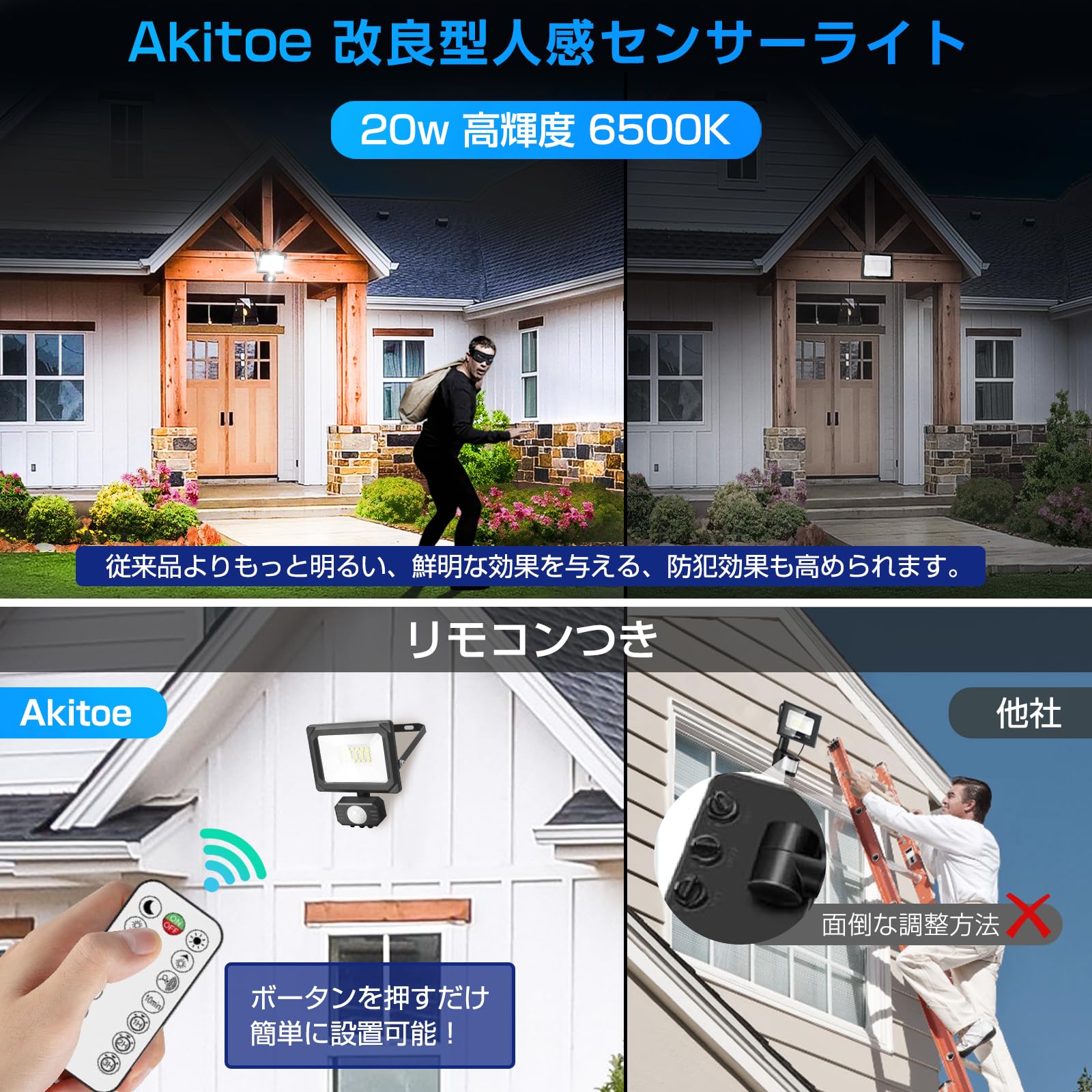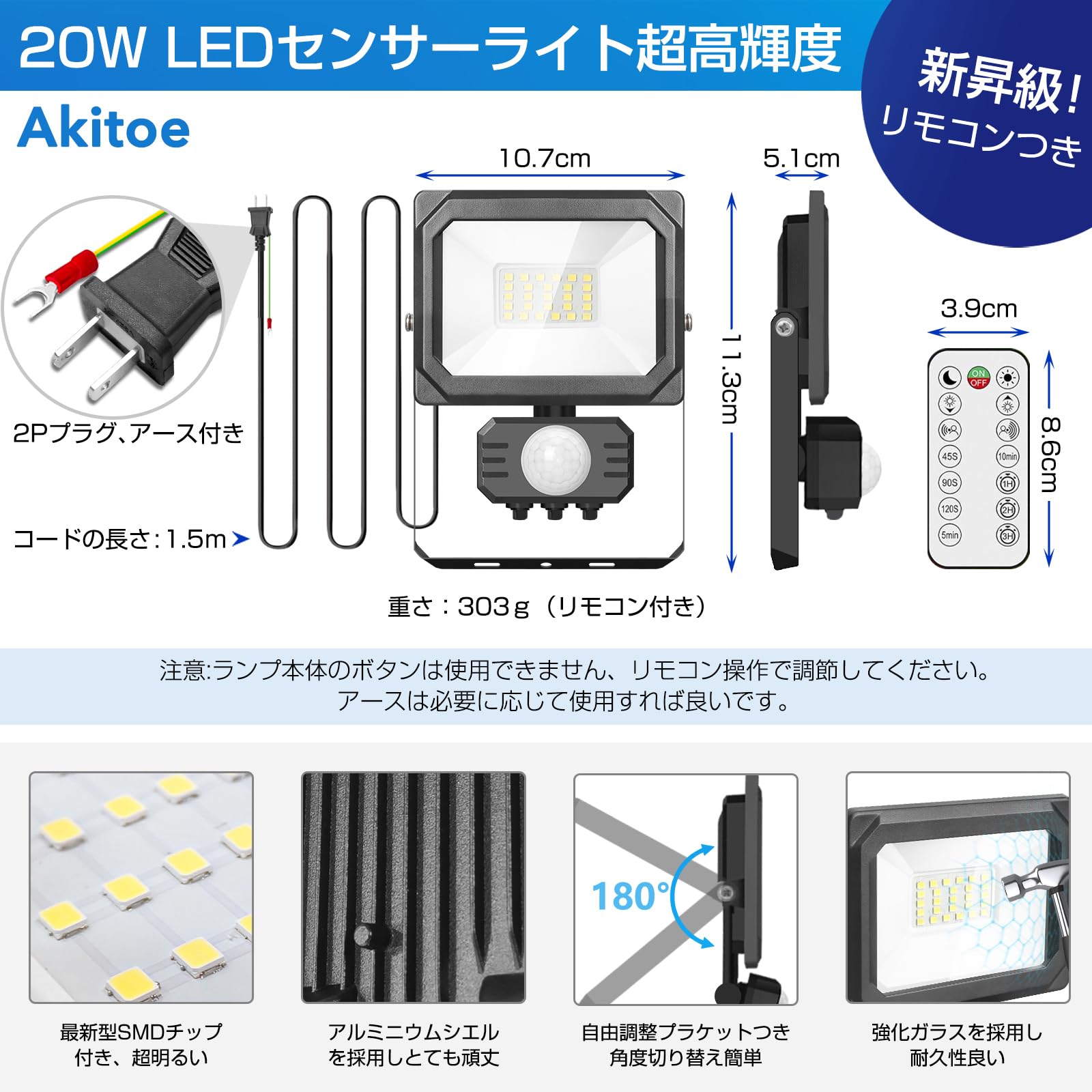 Akitoe LEDセンサーライト 屋内/屋外使用可 人感センサー LED投光器 20W 昼白色 6500K 2Pプラグ フラッドライト 100V リモコン操作 自動点灯/消灯 超高輝度 IP65防水仕様 爆光 防犯ライト ガレージ 庭 玄関 倉庫 駐車場 1.5Mコード コンセント付き
