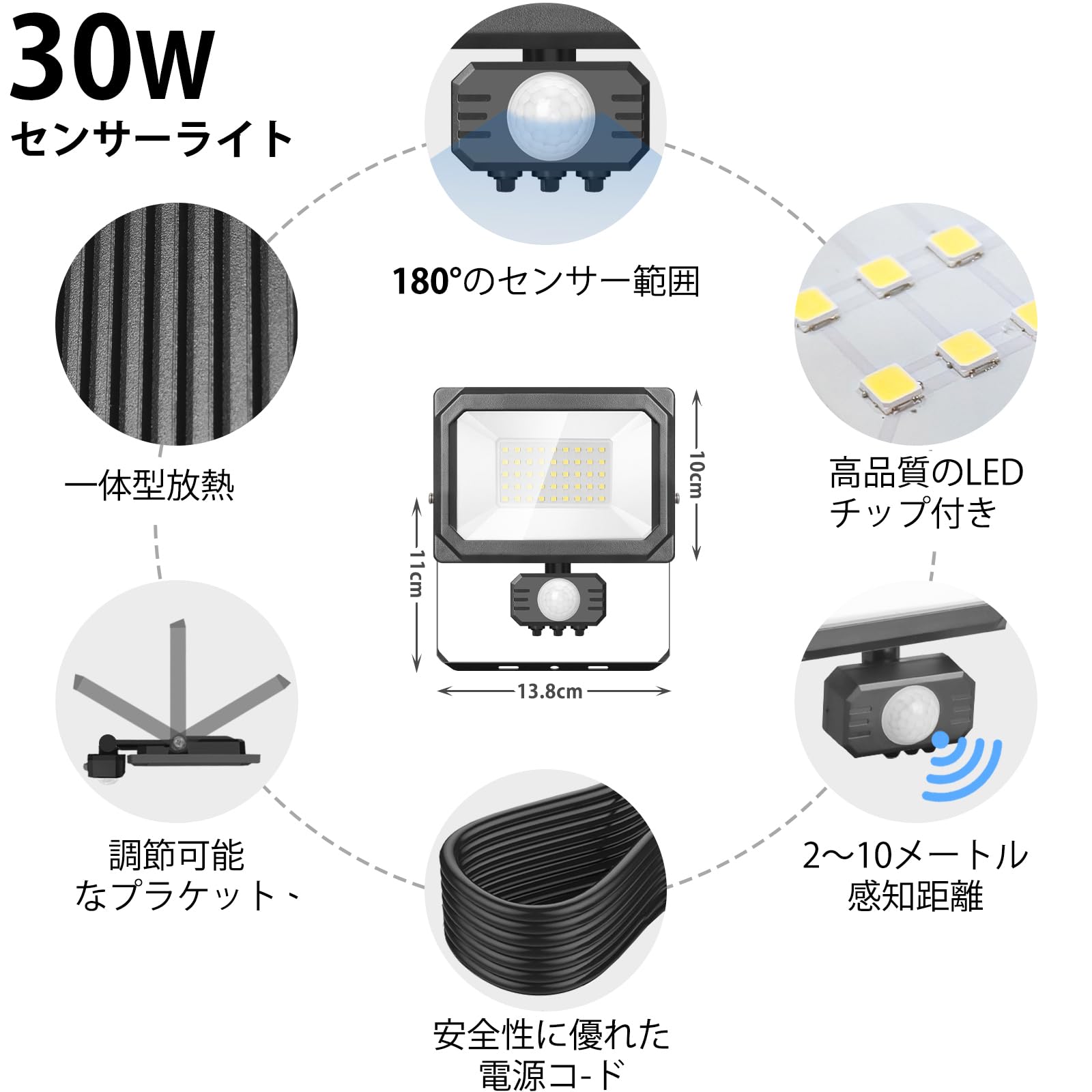 Akitoe LED投光器 センサーライト 人感ライト 30W 節電 2Pプラグ付き コンセント式 AC100V 3Mコード 屋内/屋外用 IP65 120度照射角度 防雨 高輝度 省エネ 庭 駐車場 玄関灯 廊下 町内の防犯 PSE認証済