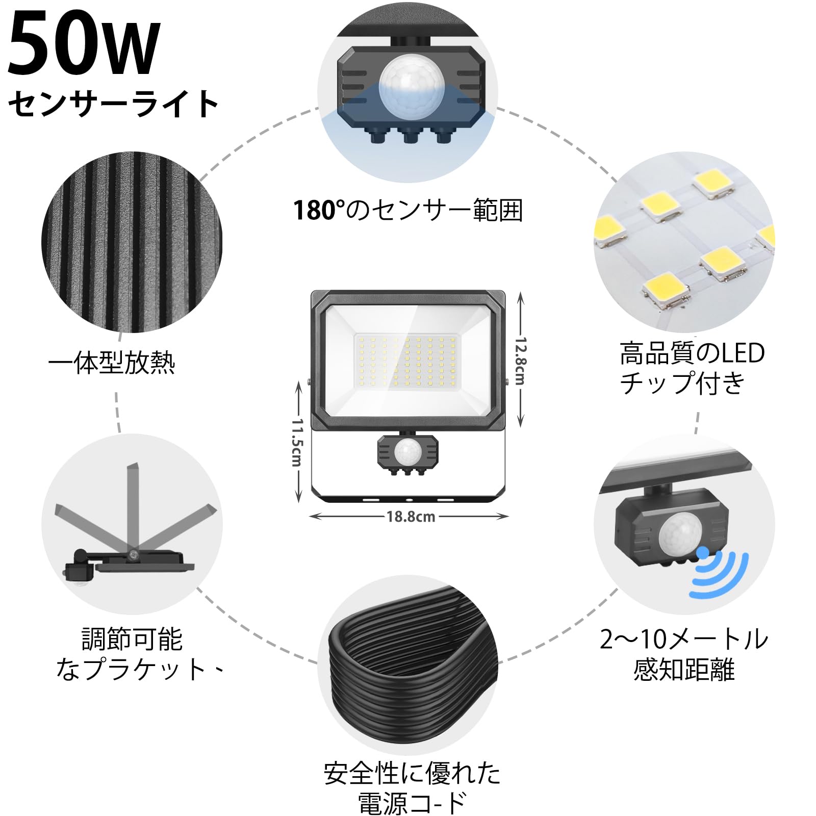 Akitoe LED投光器 センサーライト 人感ライト 50W 節電 2Pプラグ付き コンセント式 AC100V 3Mコード 屋内/屋外用 IP65 120度照射角度 防雨 高輝度 省エネ 庭 駐車場 玄関灯 廊下 町内の防犯 PSE認証済