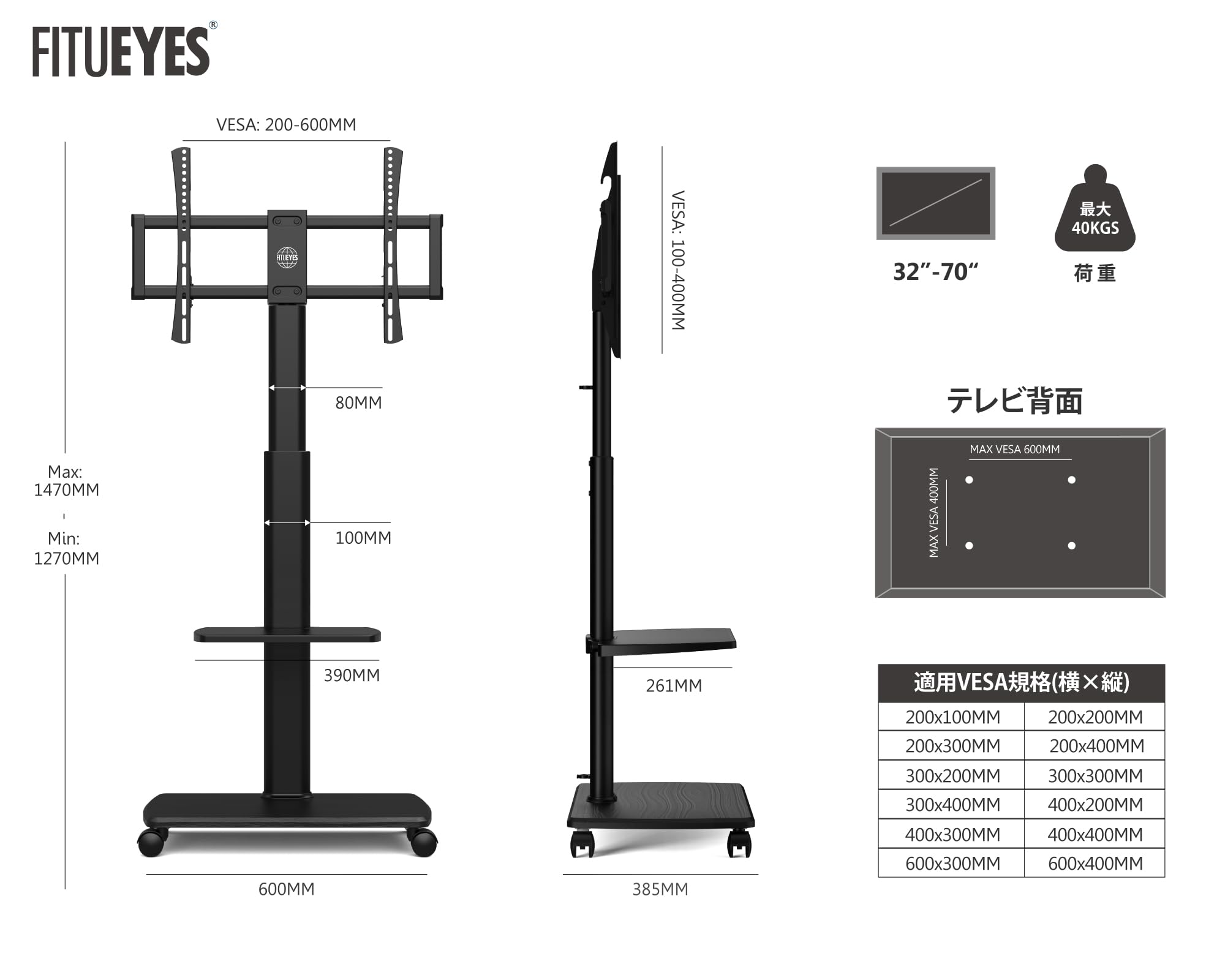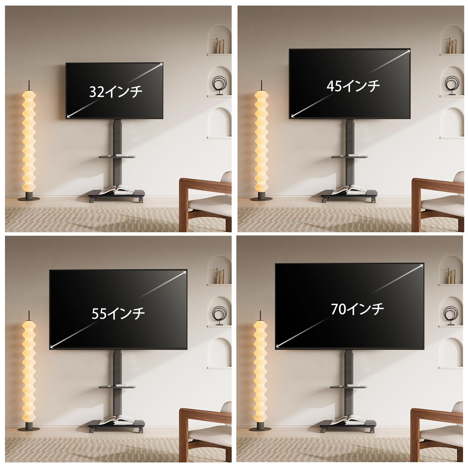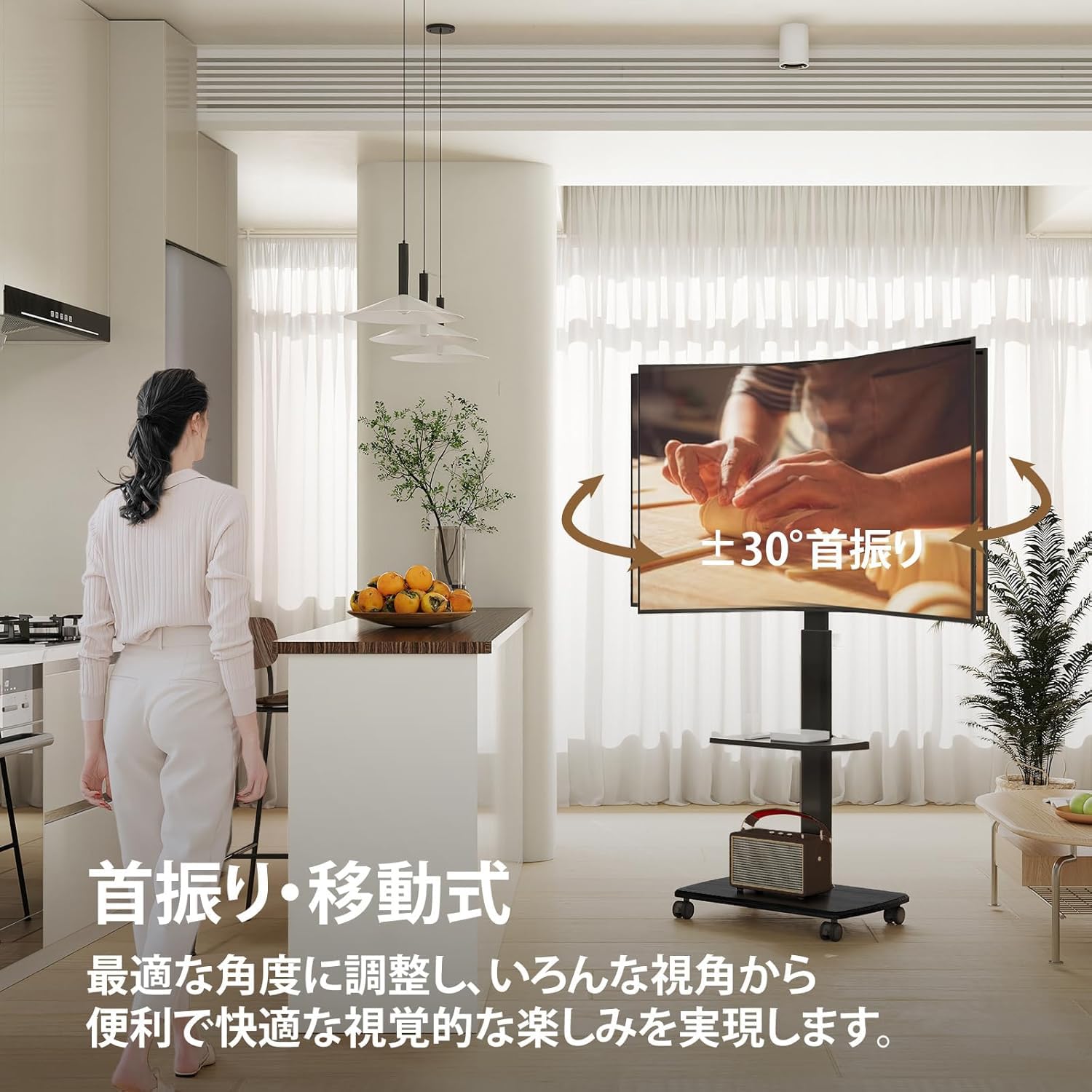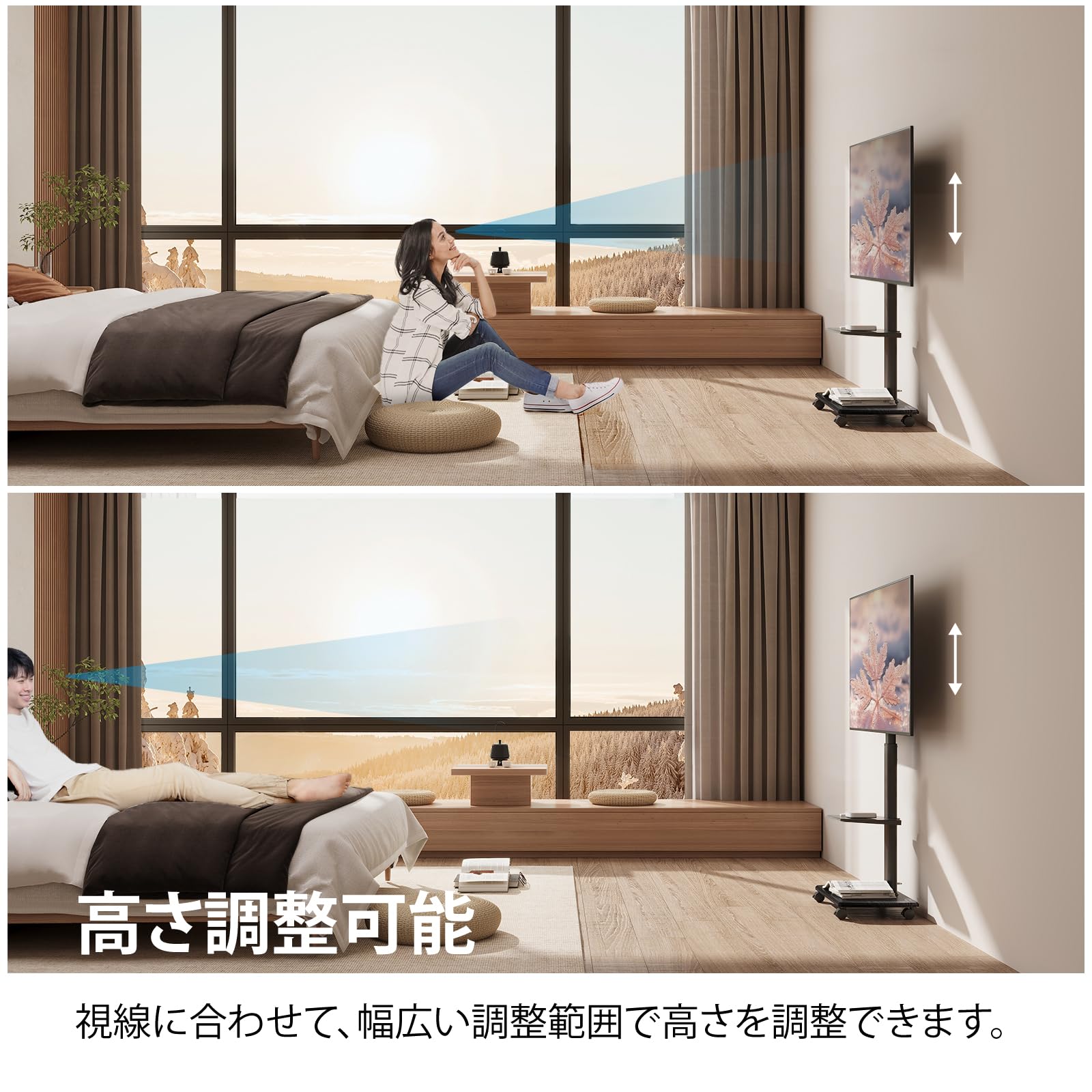 FITUEYES テレビスタンド 32~70インチに対応 キャスター付き テレビ台 壁寄せ ハイタイプ tvスタンド 移動式 自立式 tv stand 幅60cmの木製台座 耐荷重40kg VESA600x400mmまで 高さ調整可能 左右首振り可能 棚板付き 木目調 ブラック