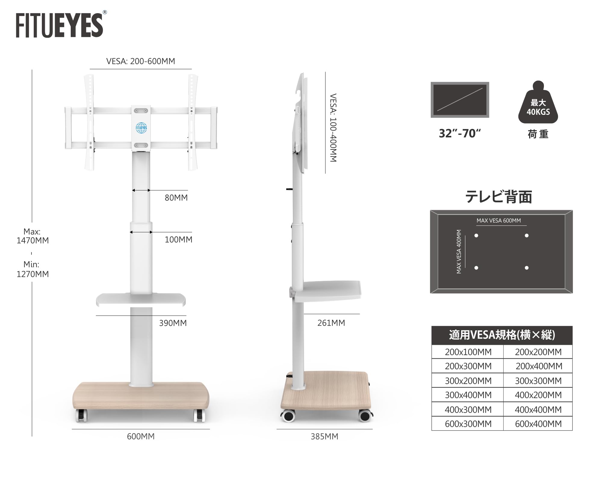 FITUEYES テレビスタンド 32~70インチに対応 キャスター付き テレビ台 壁寄せ ハイタイプ tvスタンド 移動式 自立式 tv stand 幅60cmの木製台座 耐荷重40kg VESA600x400mmまで 高さ調整可能 左右首振り可能 棚板付き 木目調 ホワイト