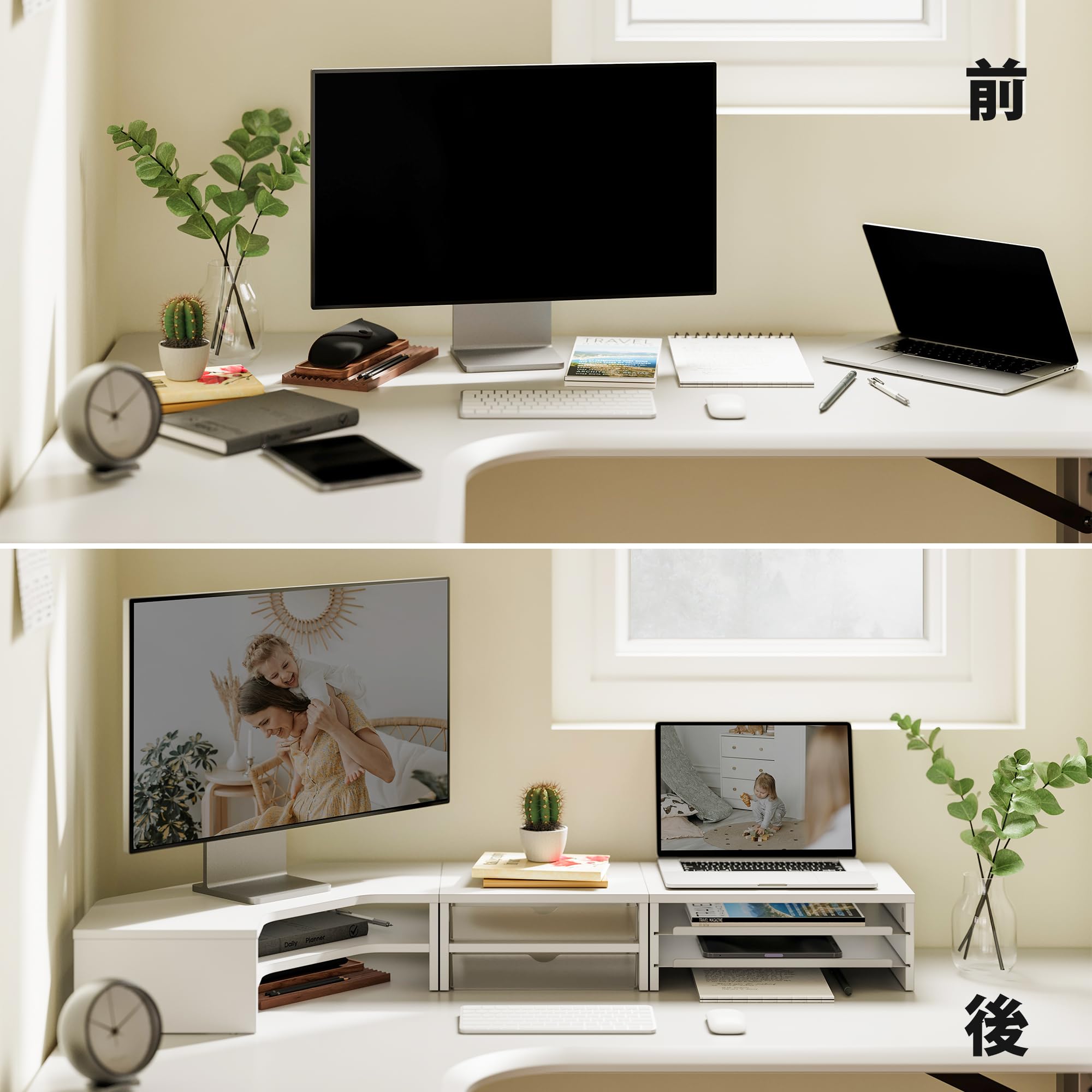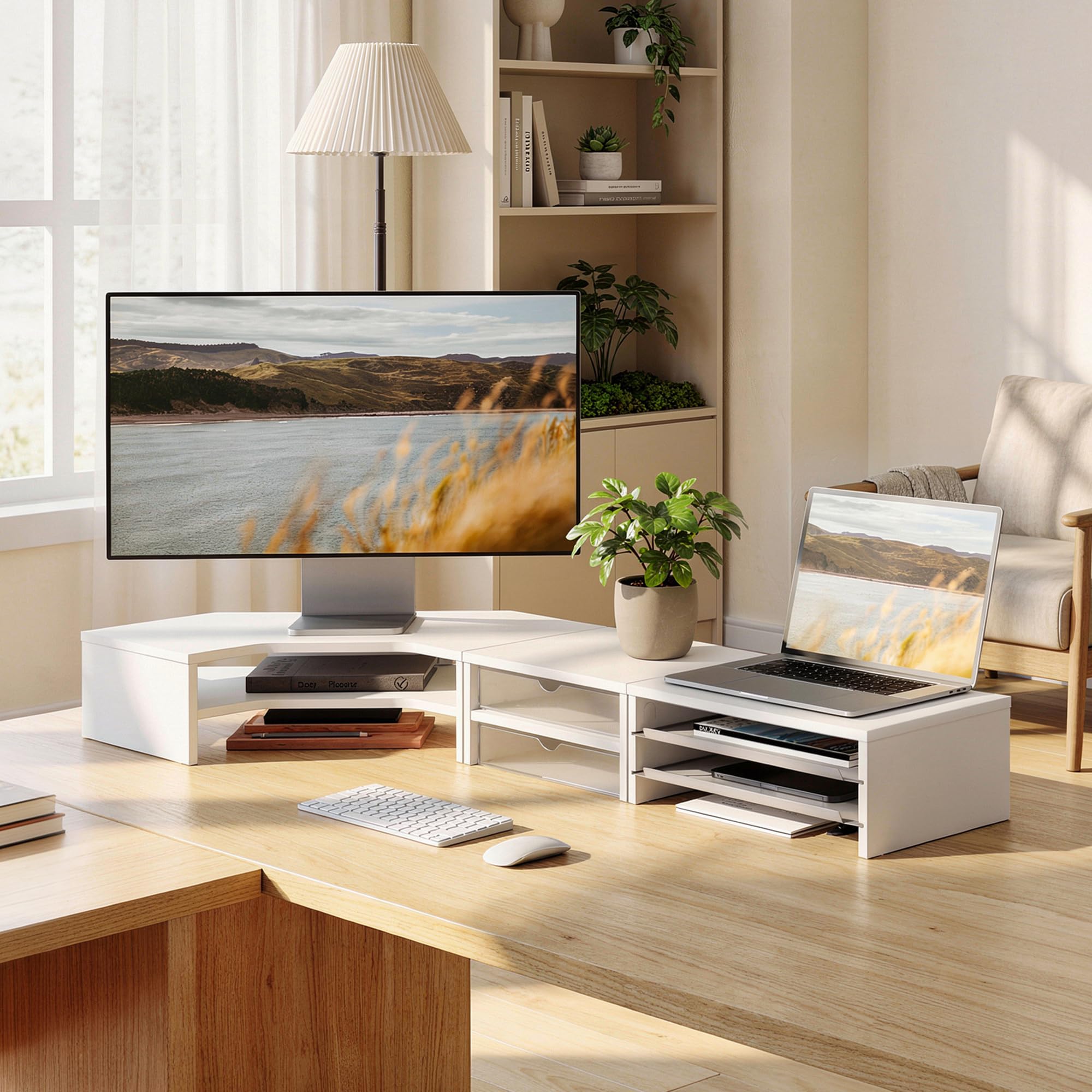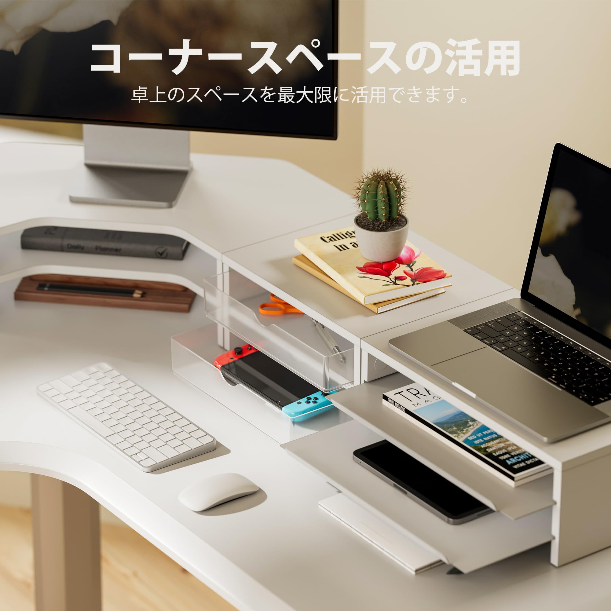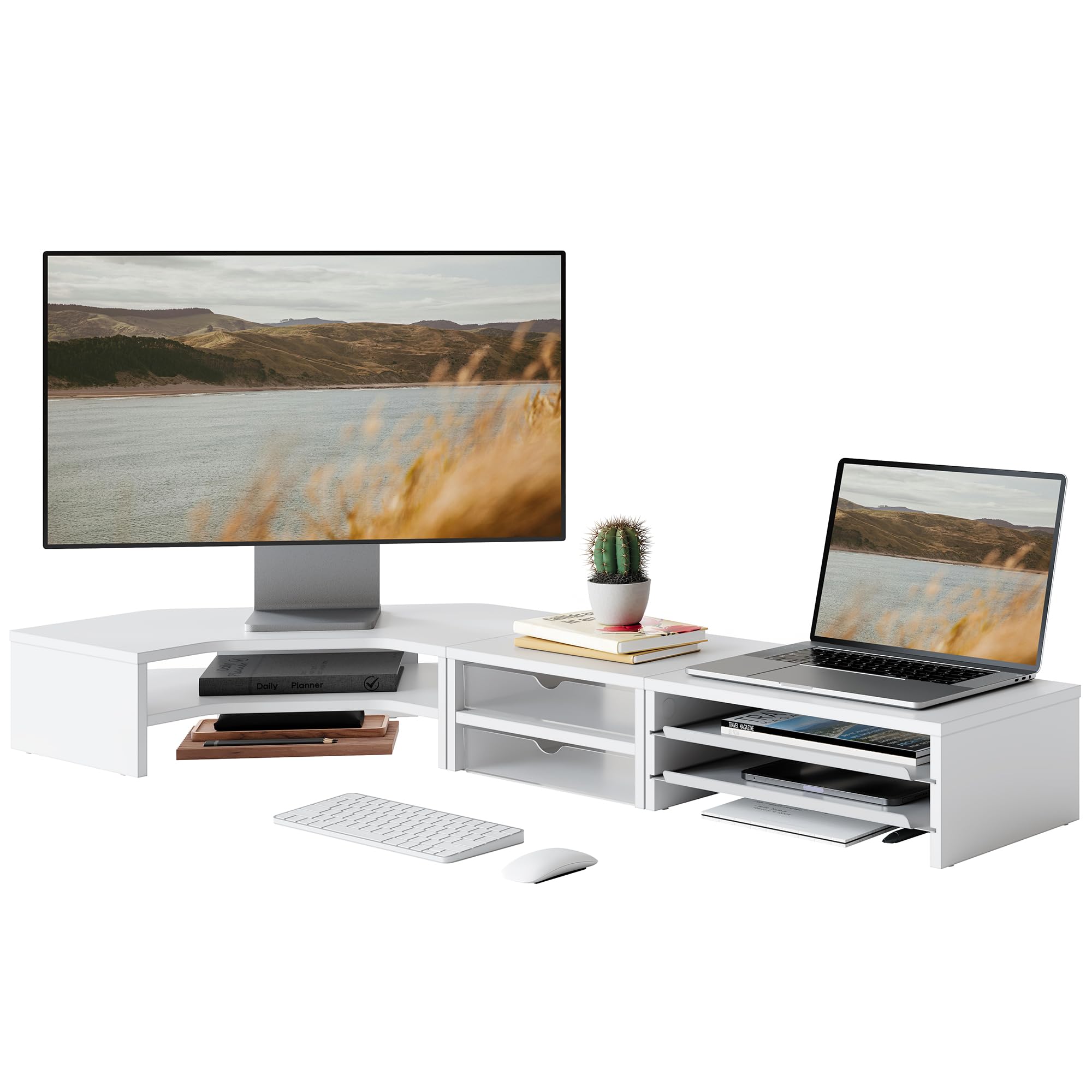 Fenge モニター台 卓上 パソコン台 机上台 デスクシェルフ 組み合わせ自由 2段 木製天板 幅111cm pc台 モニタースタンド ディスプレイ 台 デスク周り収納 整理整頓 多機能 (ホワイト)