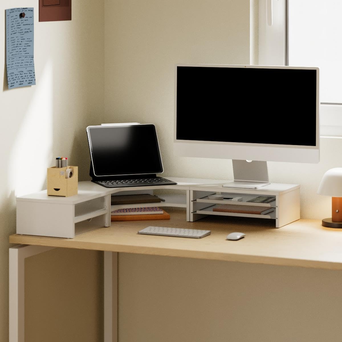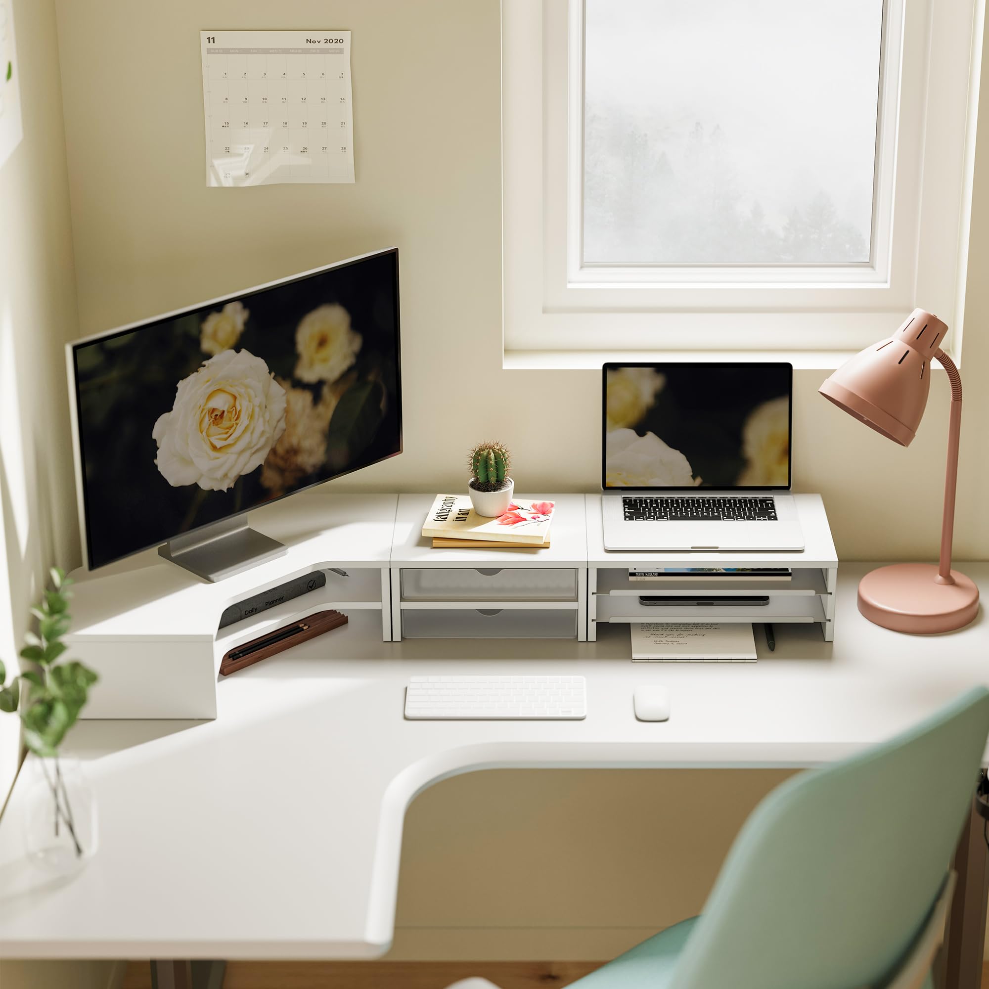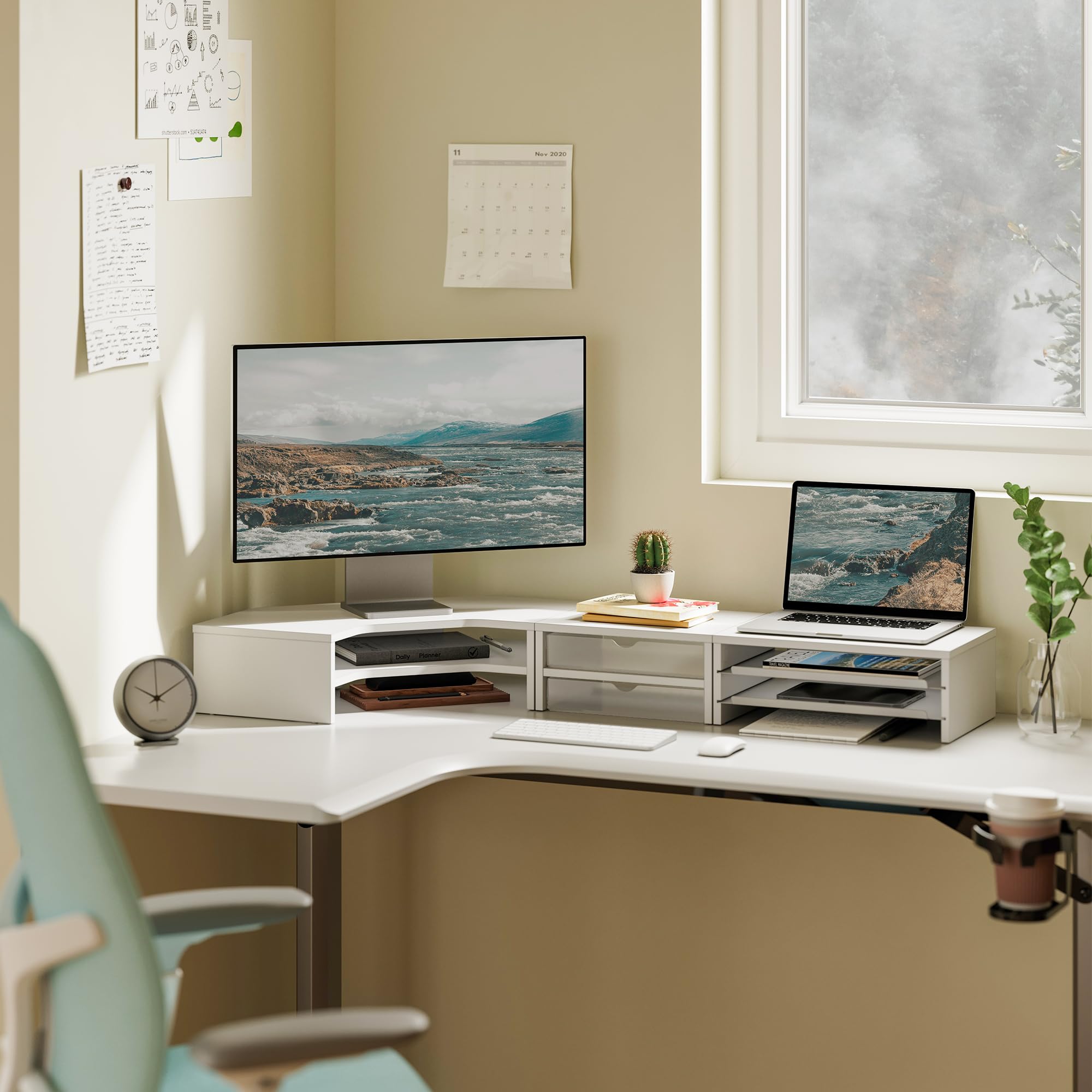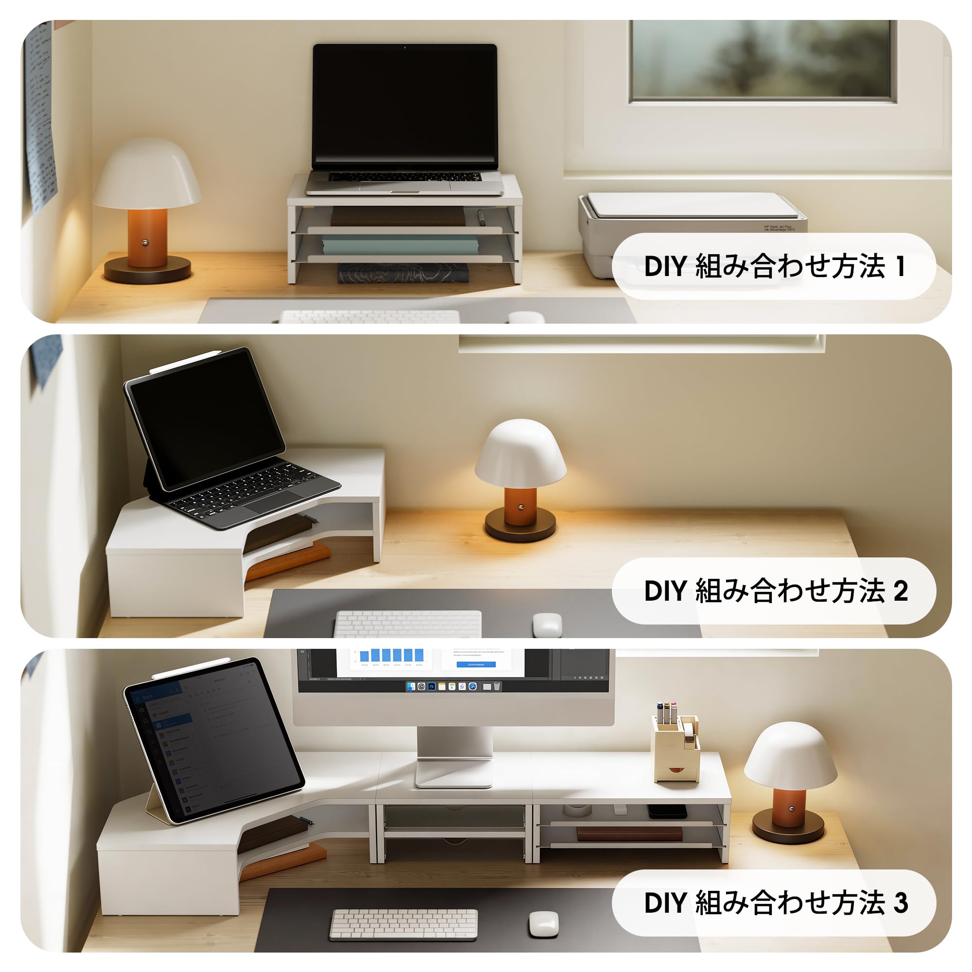 Fenge モニター台 卓上 パソコン台 机上台 デスクシェルフ 組み合わせ自由 2段 木製天板 幅111cm pc台 モニタースタンド ディスプレイ 台 デスク周り収納 整理整頓 多機能 (ホワイト)
