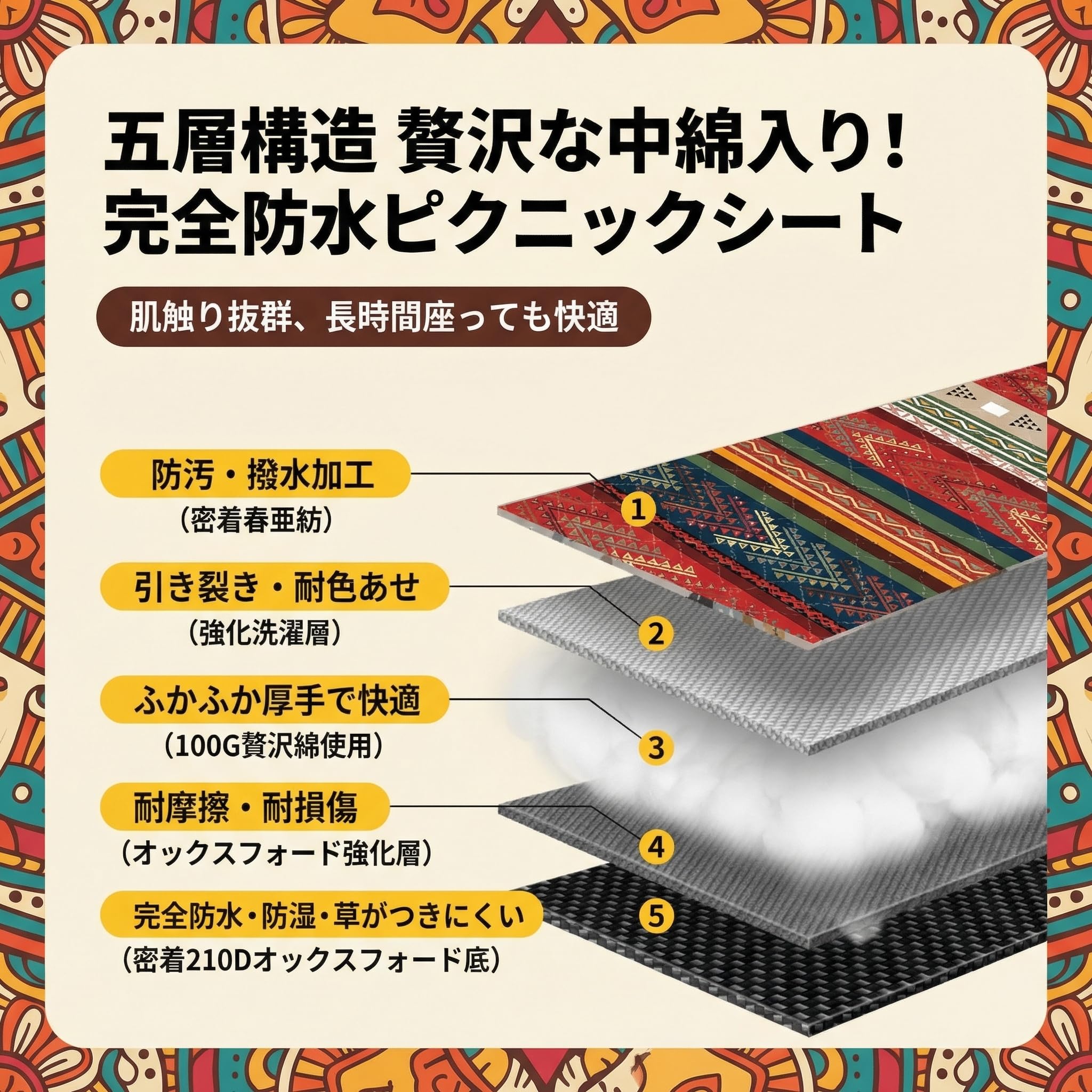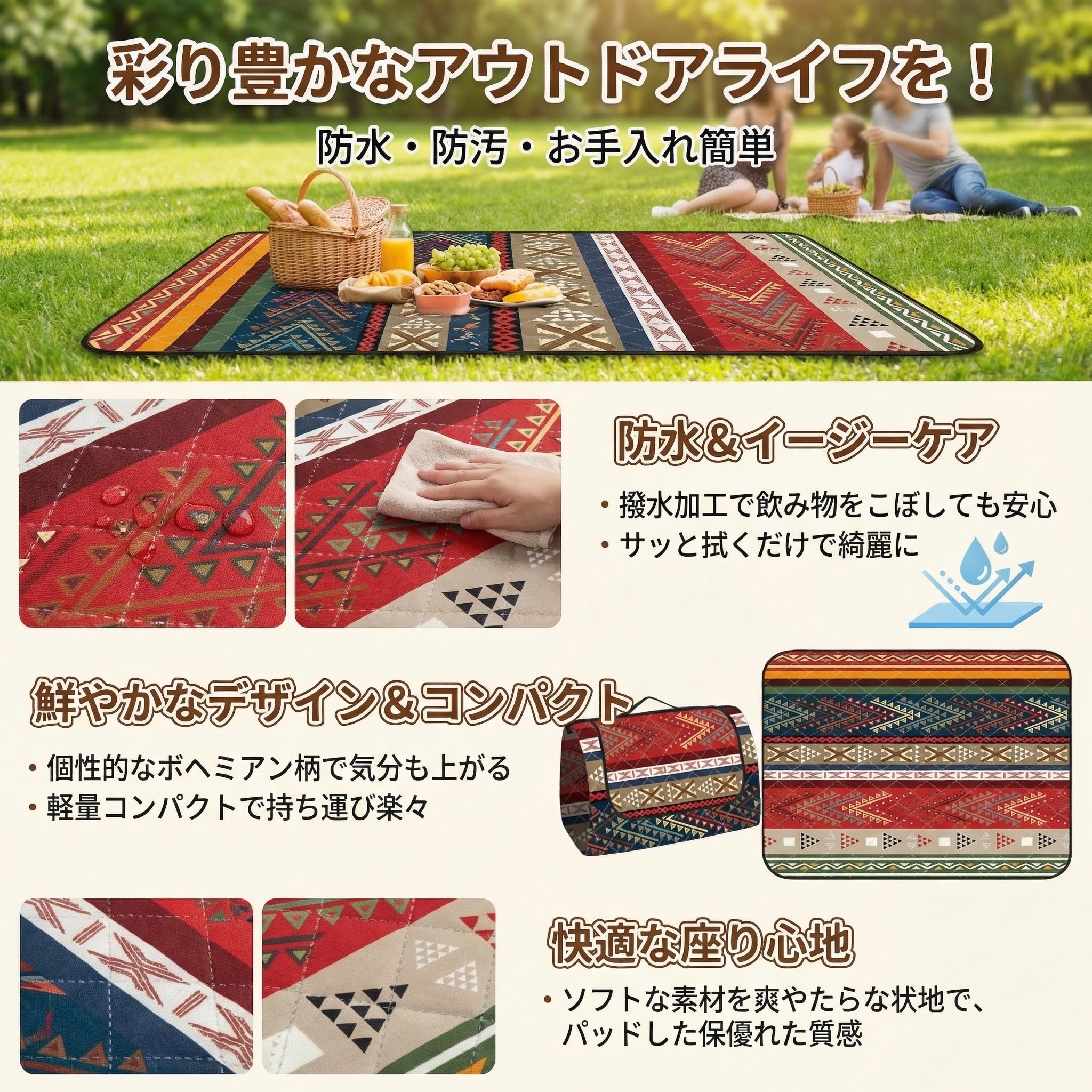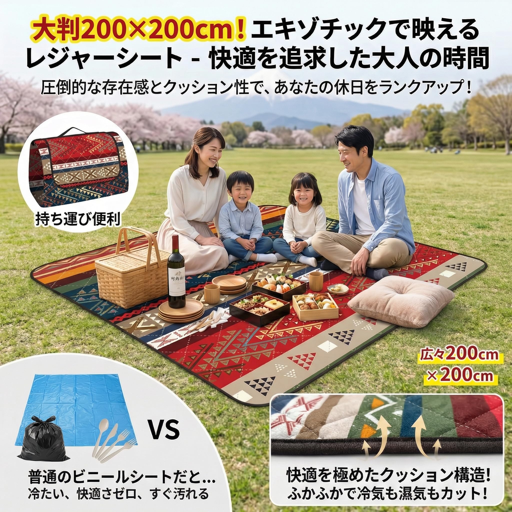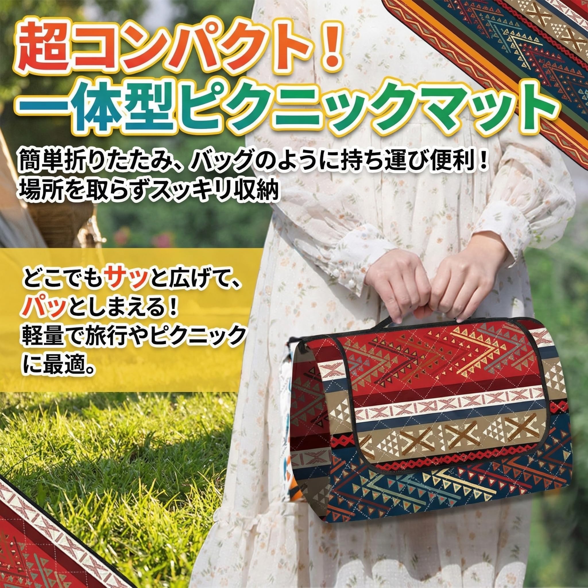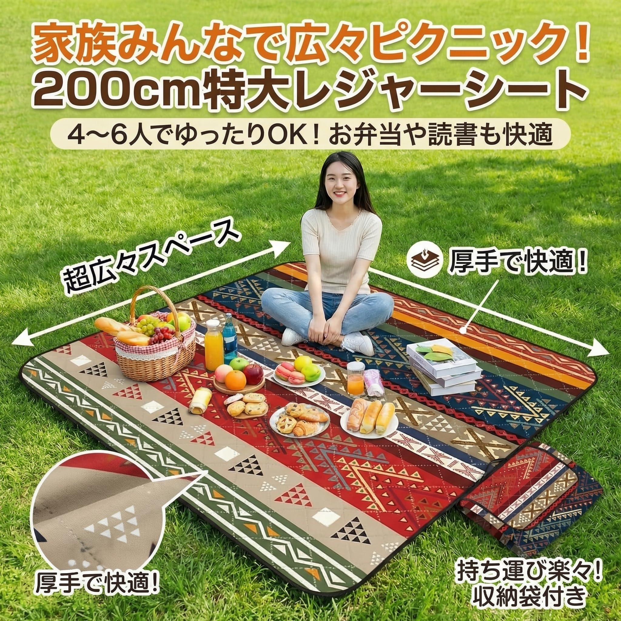 LIKENNY レジャーシート 厚手 ふかふか 200×200cm 大判 3層構造 キルティング 民族柄 撥水 洗濯可 軽量 コンパクト 収納袋付き アウトドア キャンプ ピクニック マット