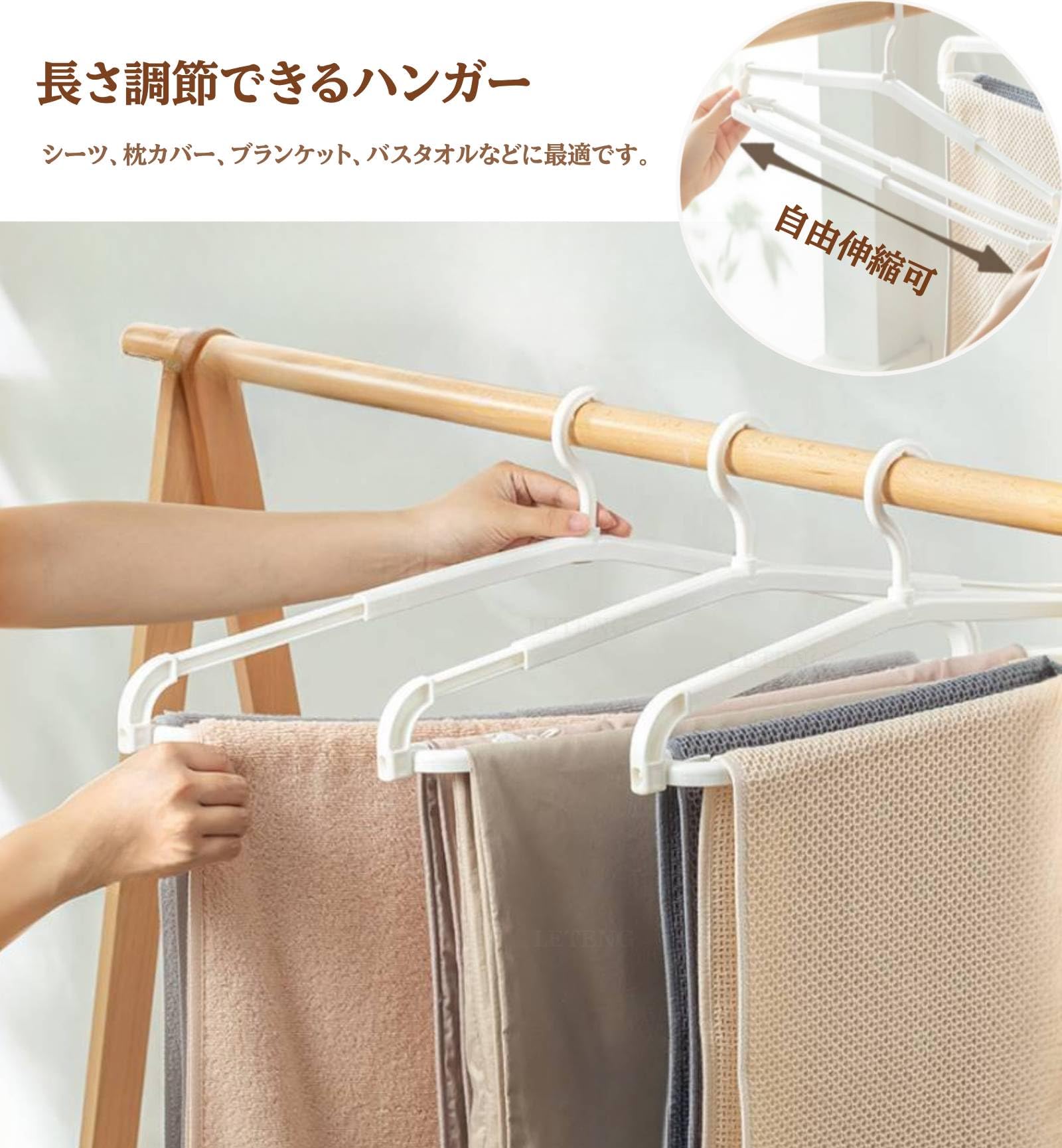 バスタオル ハンガー 伸縮式 洗濯ハンガー タオルハンガー 衣類ハンガー 伸びる 長さ自由調節 乾きやすい 跡がつかないハンガー 衣類変形にくい 物干し 360度回転フック 折りたたみ式 防滑クリップ付き ずれ防止 通気性 タオル/シーツ/バスタオル/着物/スカーフ対応 2本セット