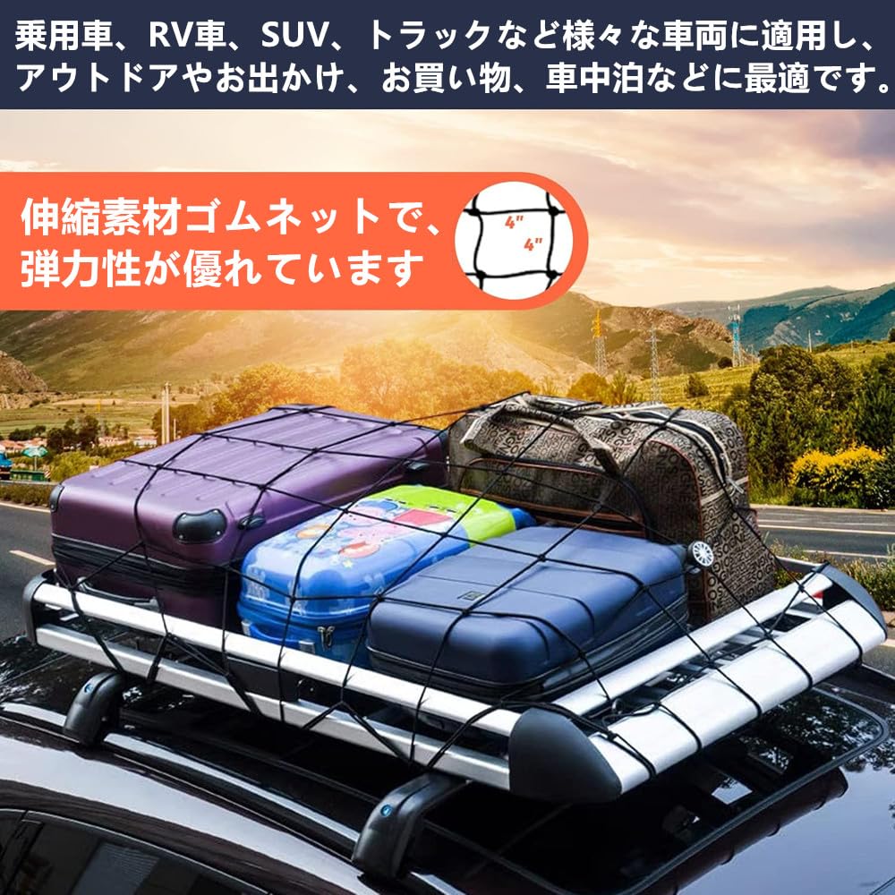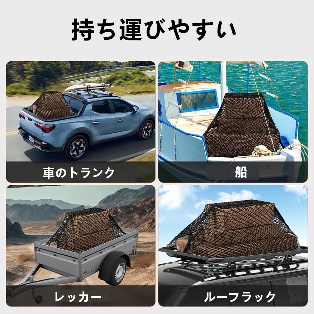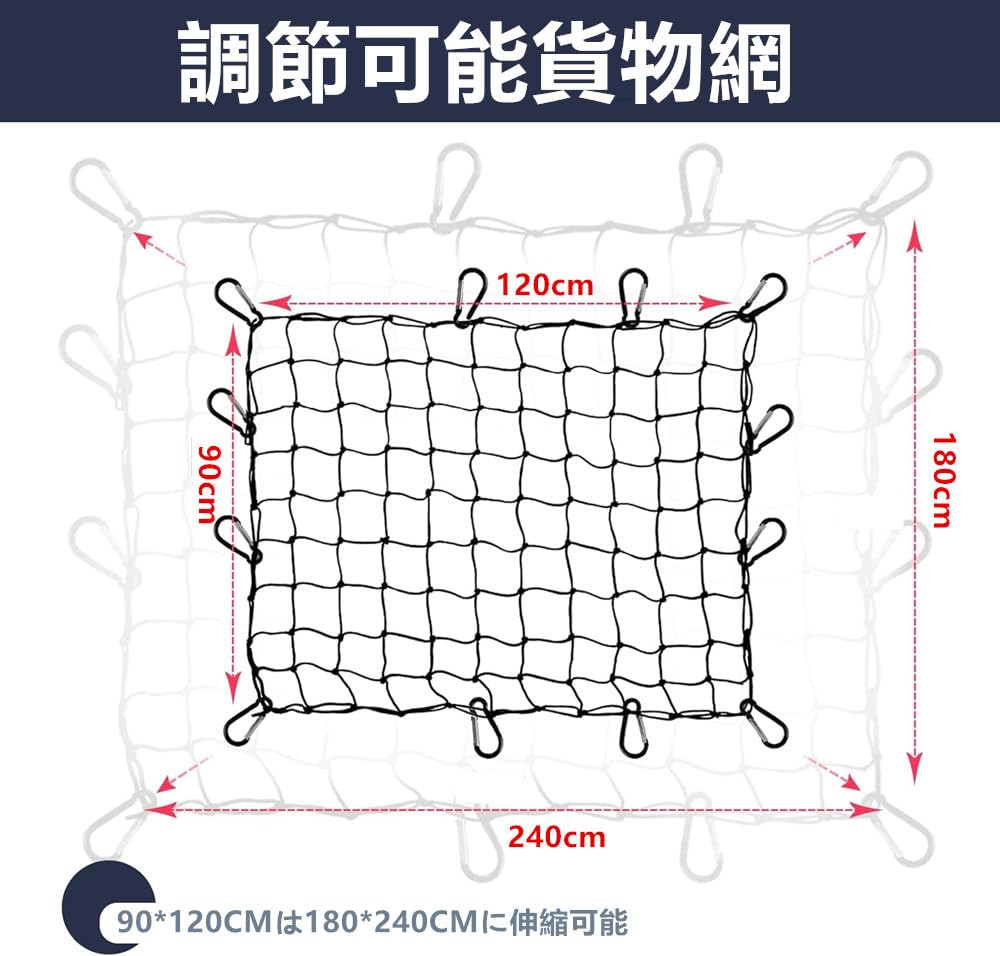 FQIPEI 車用カーゴネット 120×120cm 素敵な伸縮性 ラゲッジネット 荷台 ルーフキャリア トラック用 軽トラック用 220×220cmまで伸びる可能 6枚カラビナ付 収納ポーチ付属 2層
