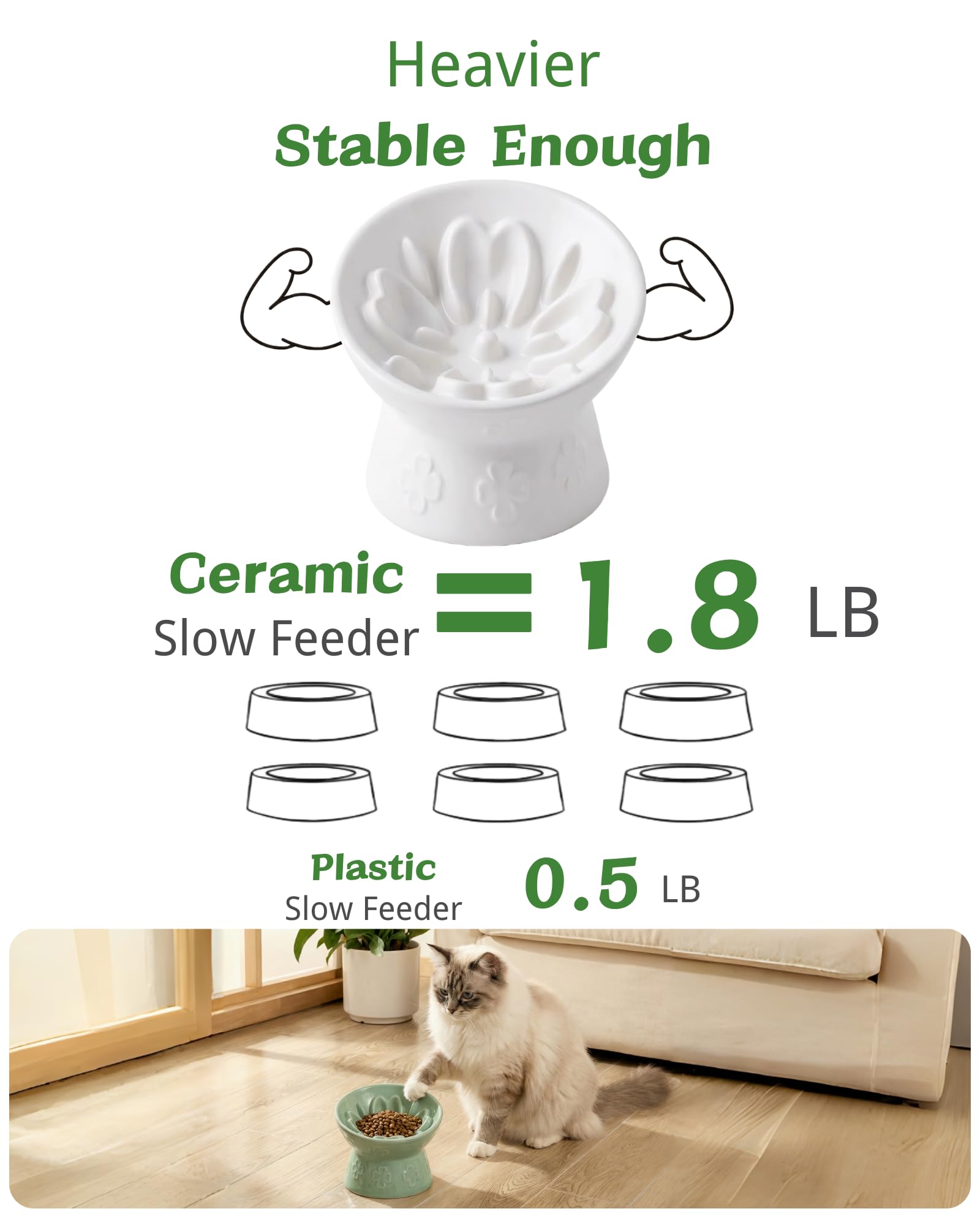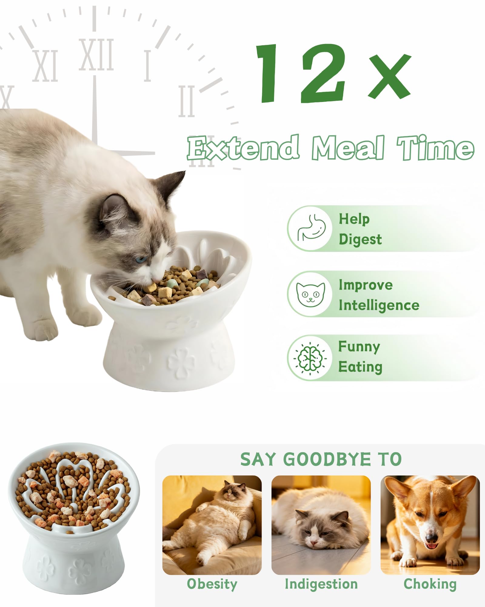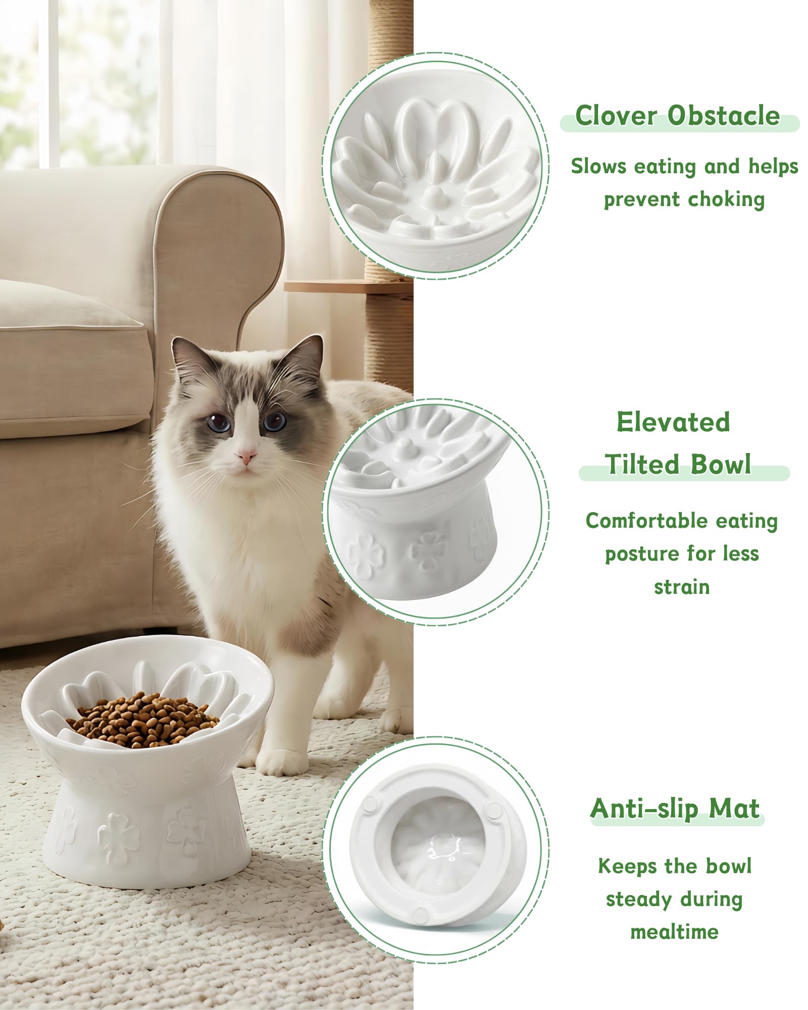 TRUVIC セラミック製スローフィーダー猫用ボウル、首を保護する15°傾斜高台猫用スローイーティングボウル、嘔吐防止犬用スローフィーダー、猫と小型犬用、ひげに優しくあごが黒くならない、ホワイト