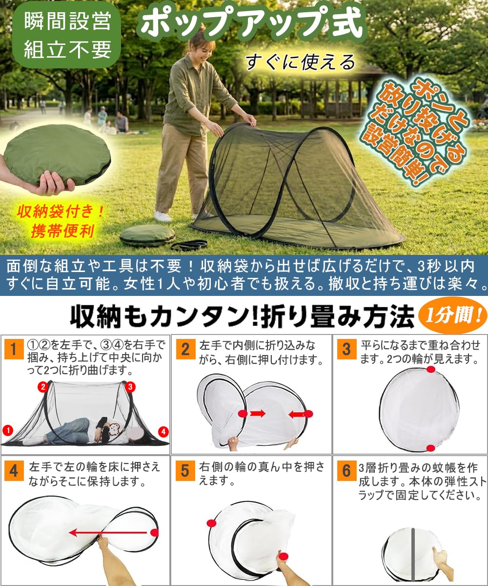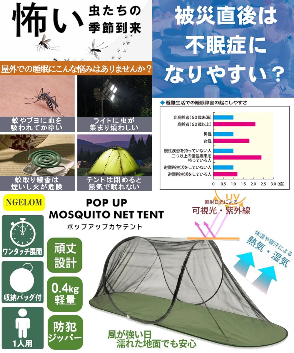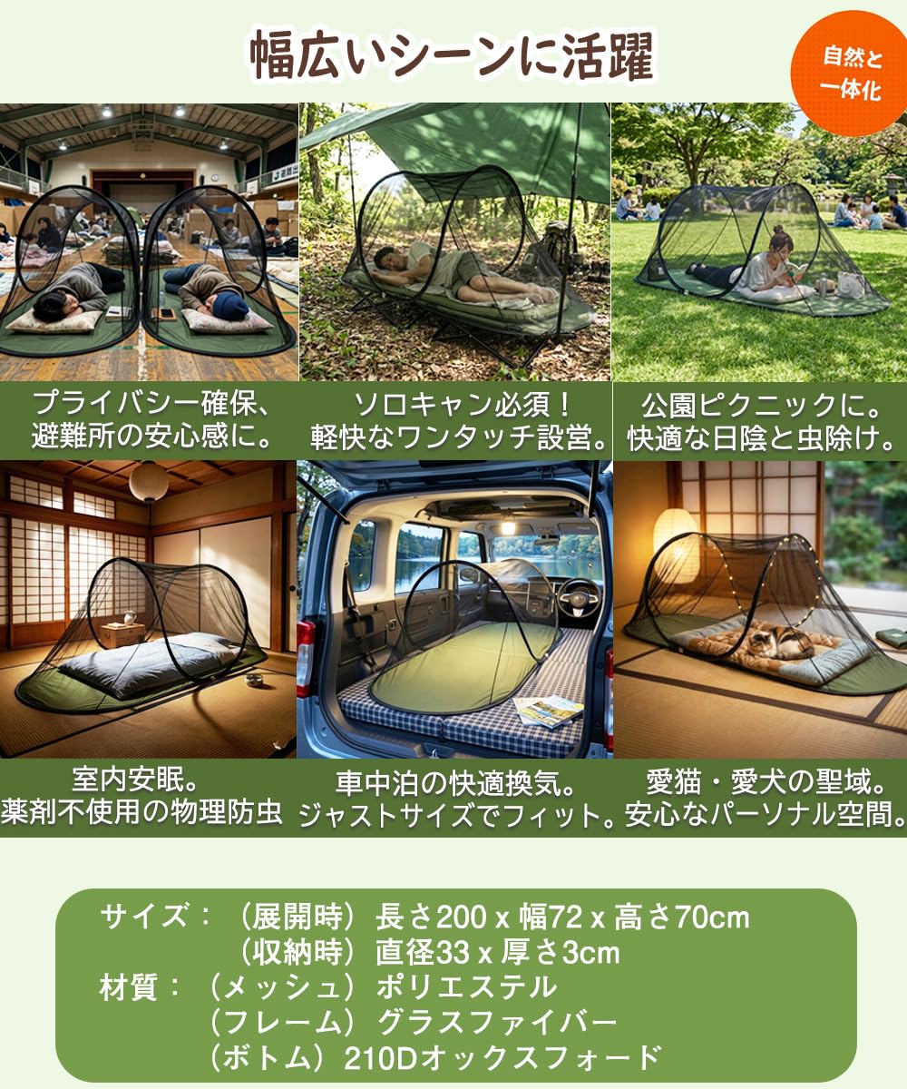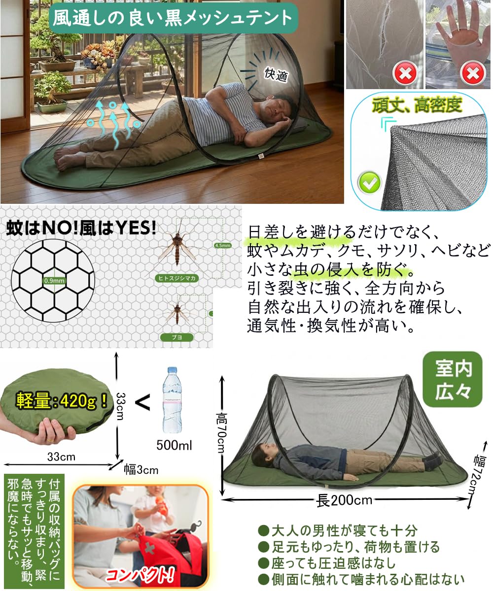 メッシュテント ポップアップ 1人用 遮光 防虫 通風 軽量 コンパクト 防災用 長期停電・避難所対策 アウトドア キャンプ 車中泊 多用途 プライバシー確保 蚊帳 テント 収納袋付き NGELOM
