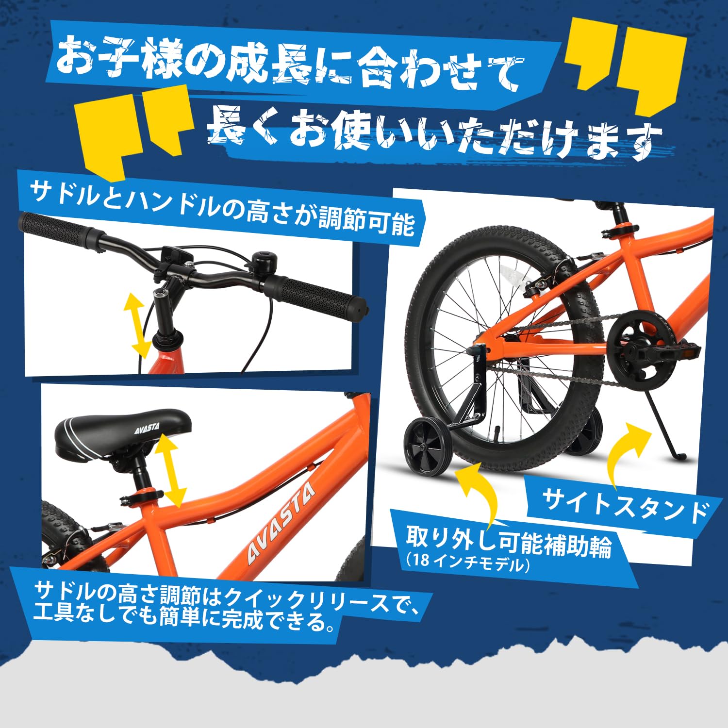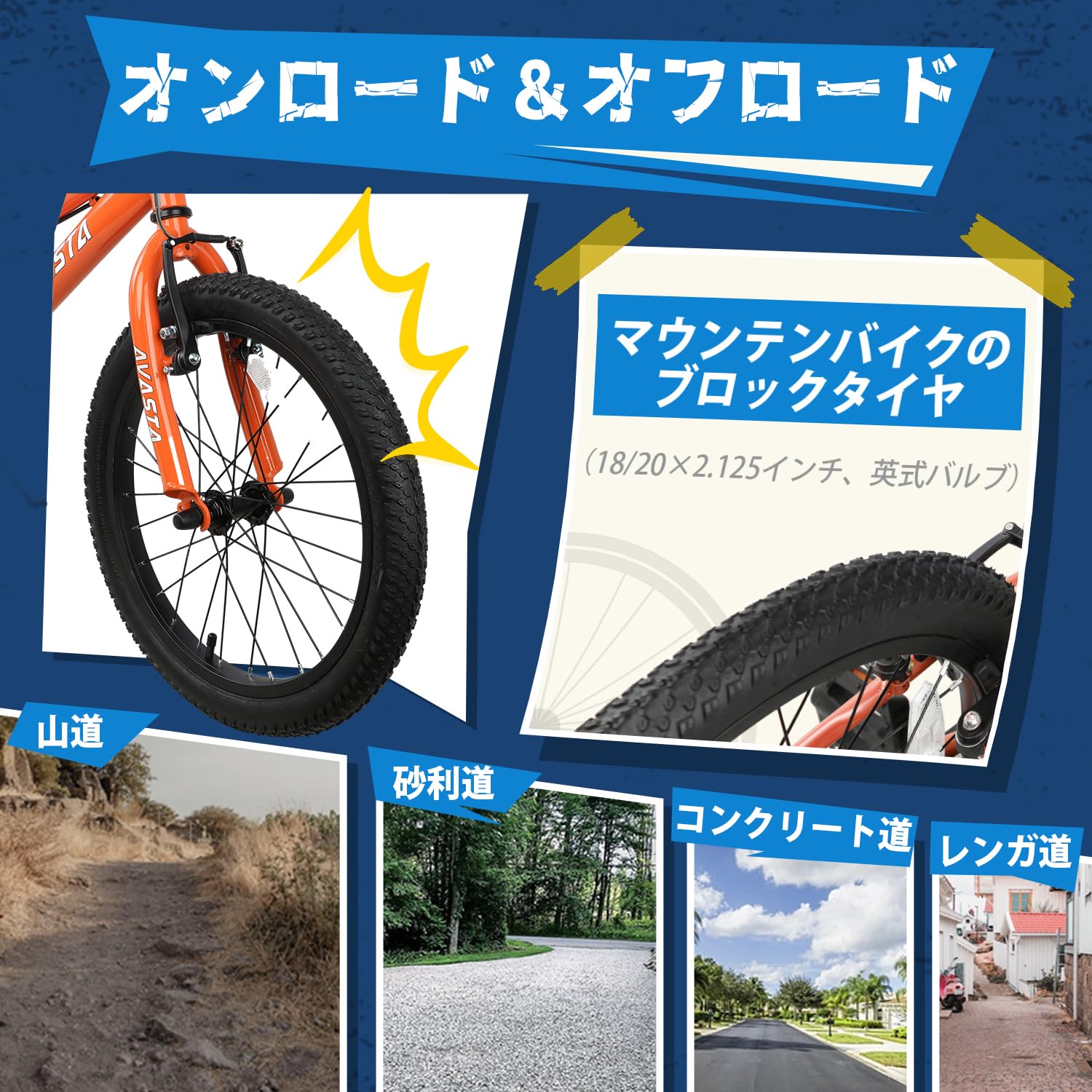 AVASTA(アバスタ)Bilbo子供自転車18インチ20インチMTBマウンテンバイク ファットブロックタイヤ 男の子女の子 こども小学生低学年高学年 街乗り通学 柔らかいサドル サイドスタンドキックスタンド付き 高さ調整可能