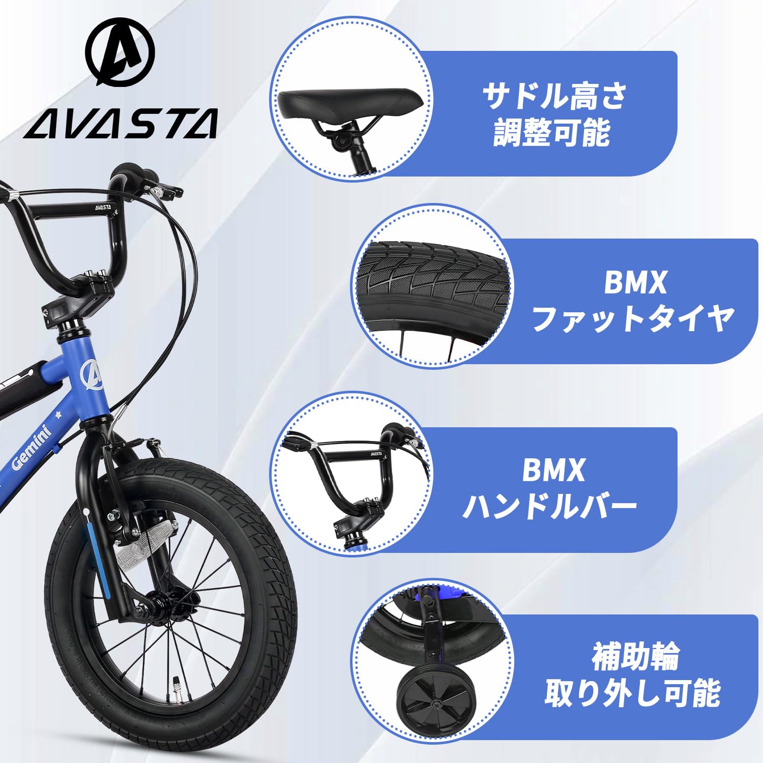 AVASTA(アバスタ)Gemini子供用BMX自転車14・16・18インチ(幅:2.4インチ)かっこいい街乗りキッズバイク 3歳~10歳 幼児小児小学生低学年 男の子女の子 こども乗り練習 キックスタンド 取り外し可能補助輪 高さ調節可能柔らかいサドル 前後輪ブレーキ付き 多色展開