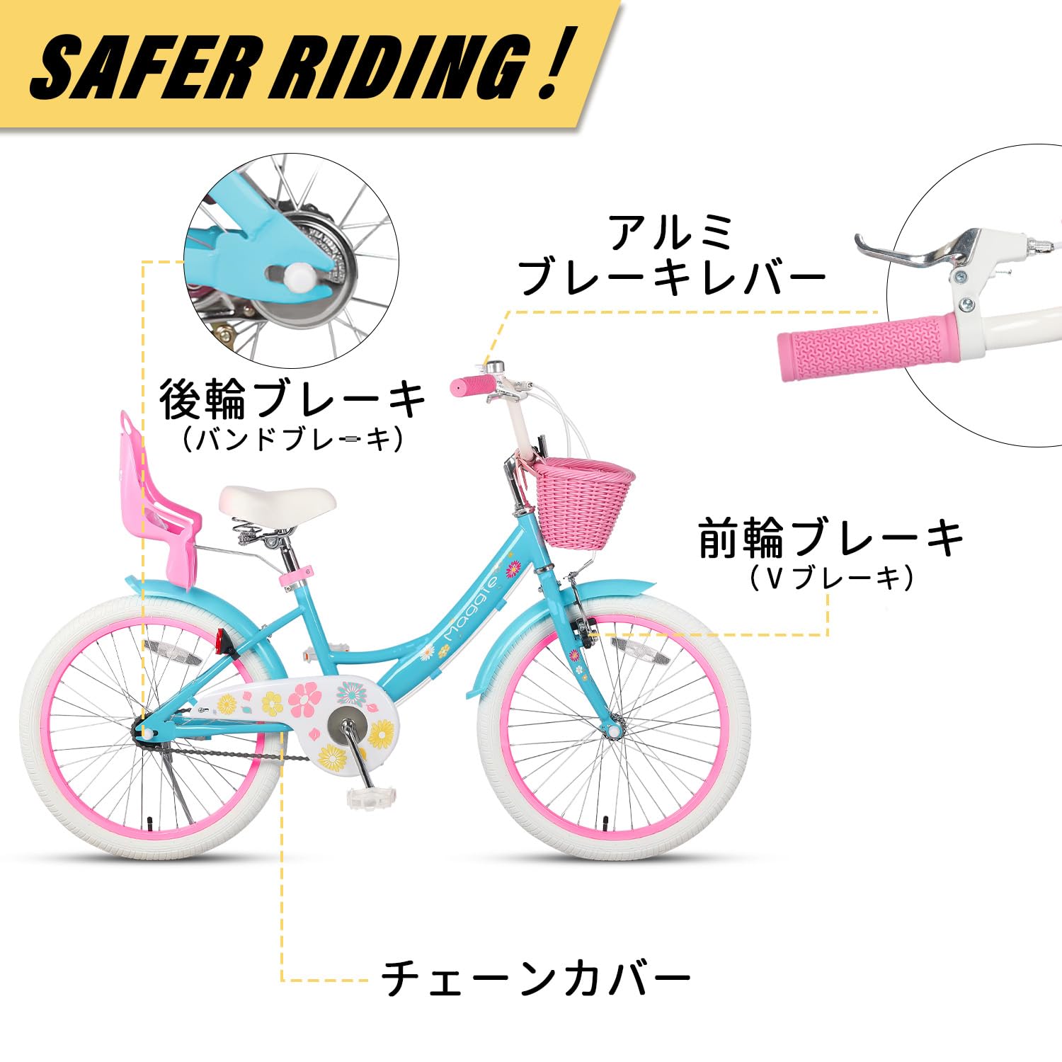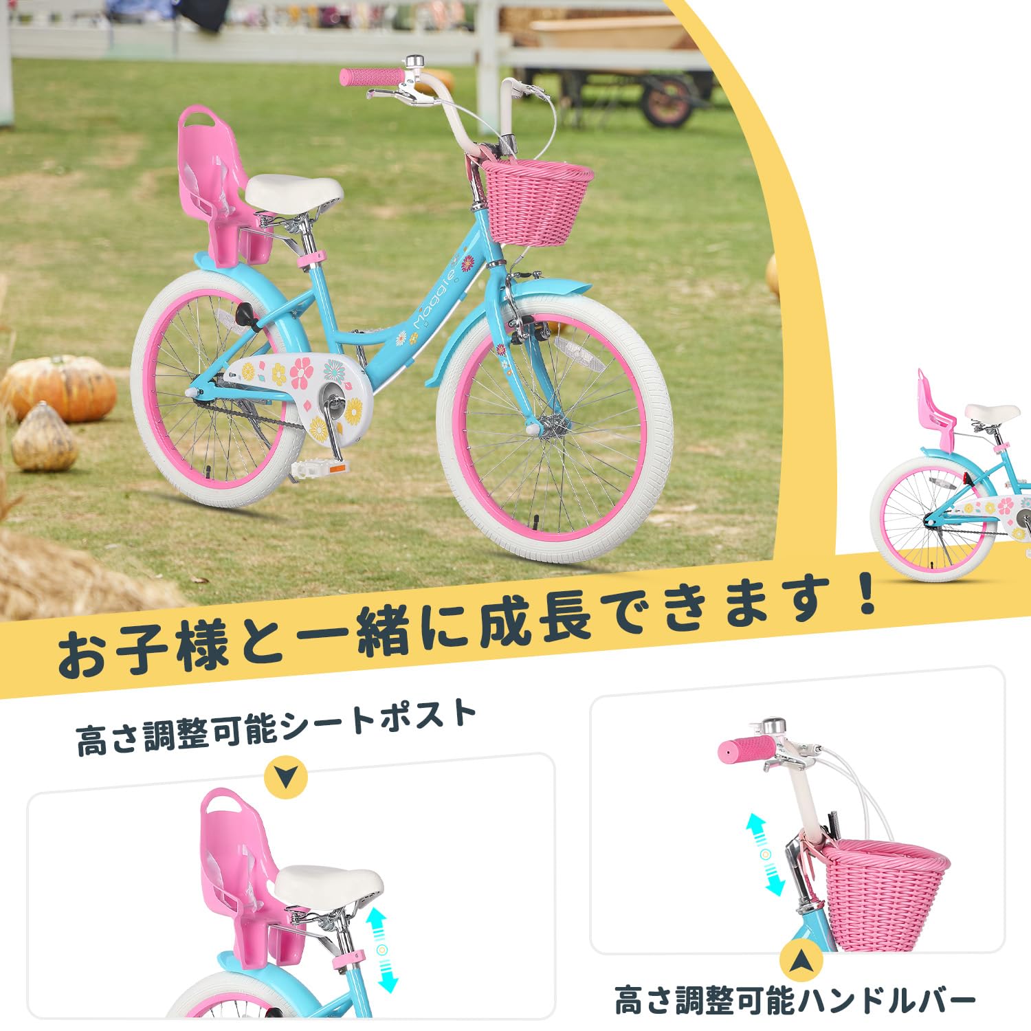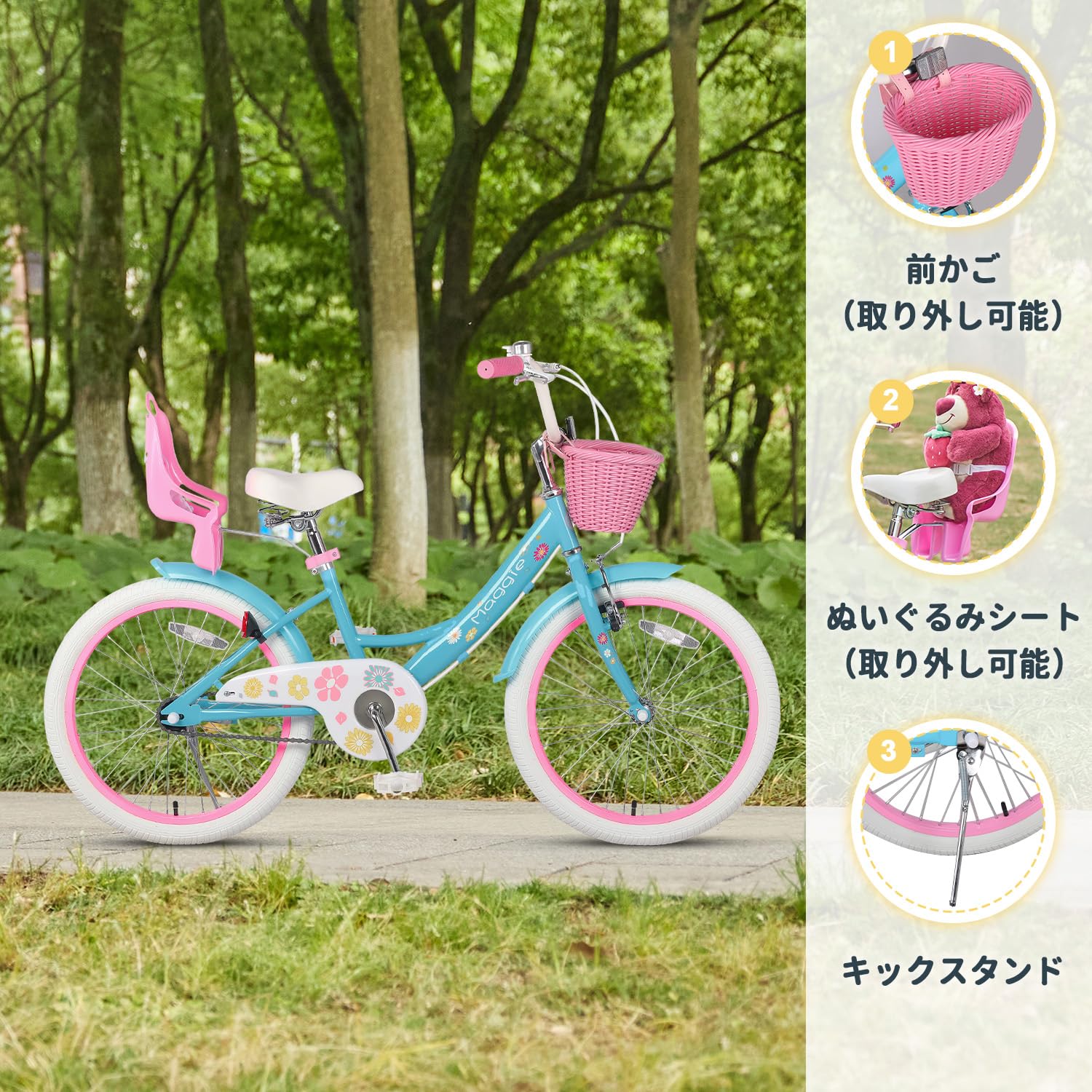 Glerc Maggie 子供用自転車 女の子用 キッズバイク 幼児小学低学年乗り練習 花柄 かご付き ぬいぐるみ座席付き vブレーキ 14/16/20インチ多色展開