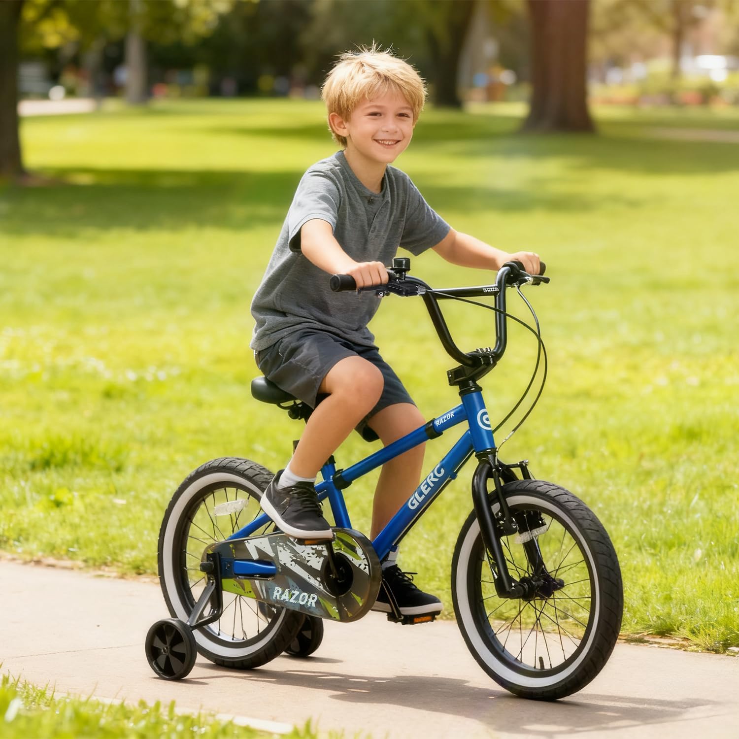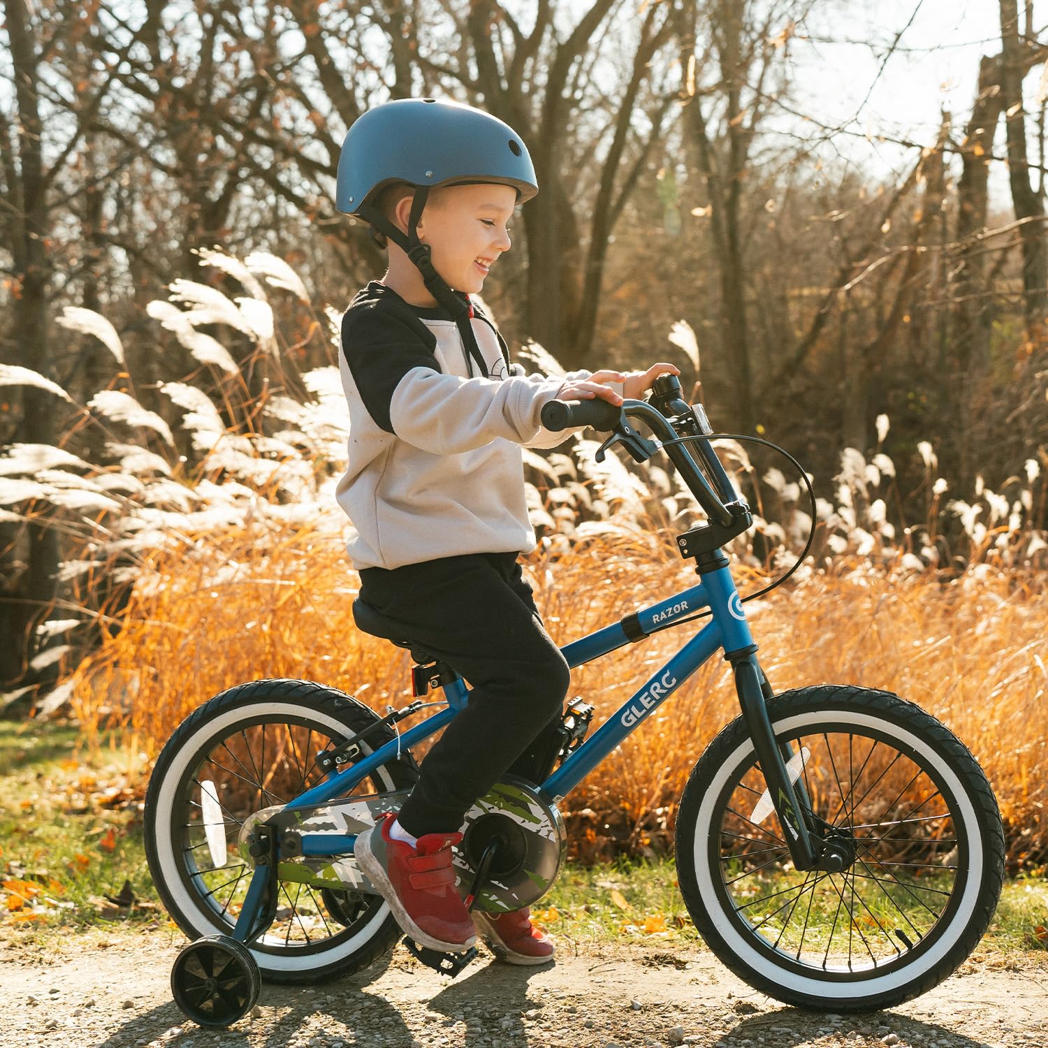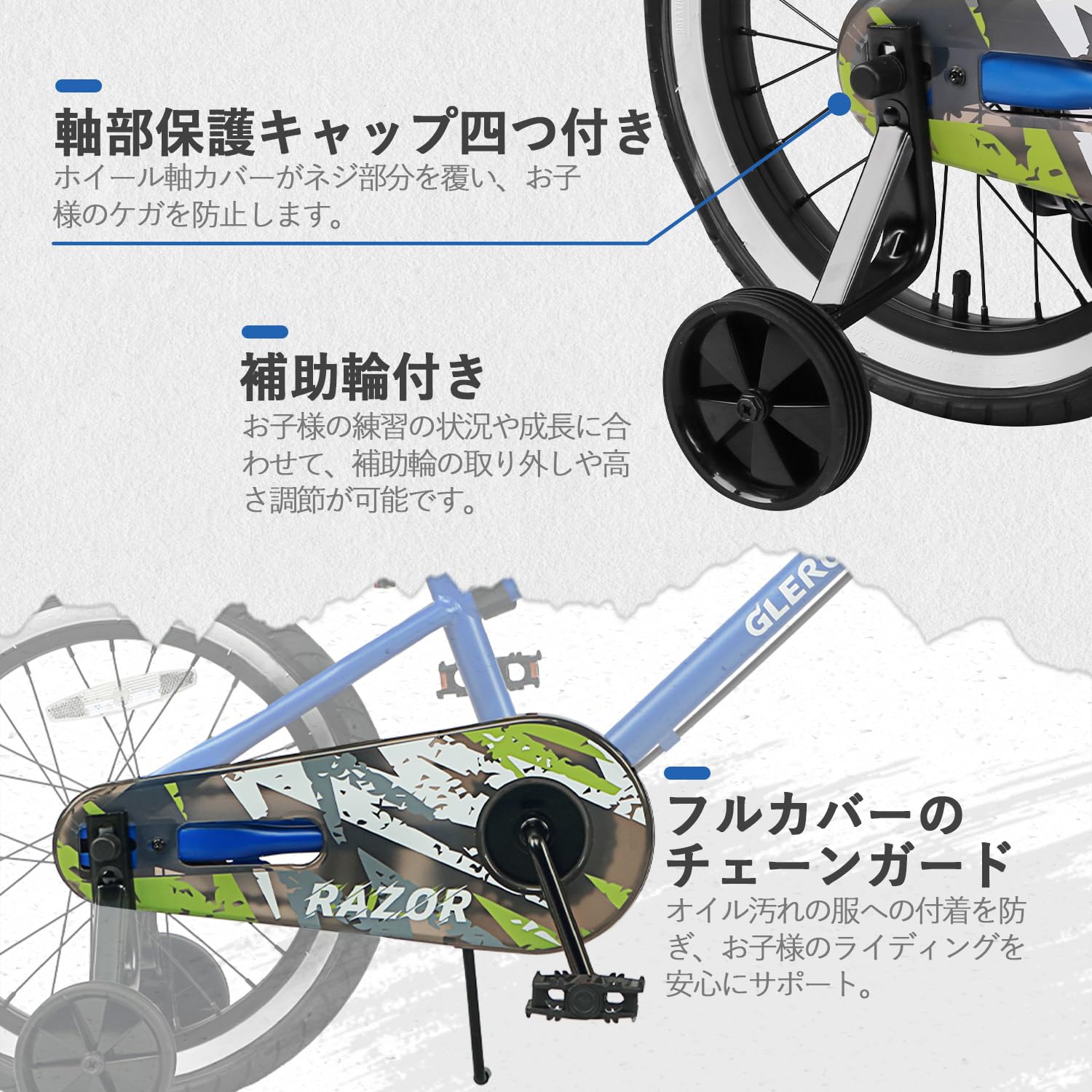 Glerc(グレーク)RAZOR子供用自転車14・16インチ かっこいいBMXスタイルハンドル 幼児小学生低学年男の子女の子 取り外しできる補助輪付き チェーンガード サイドスタンド お尻が痛くない柔らかい高さ調整可能サドル カラーリング付きファットタイヤ多色展開