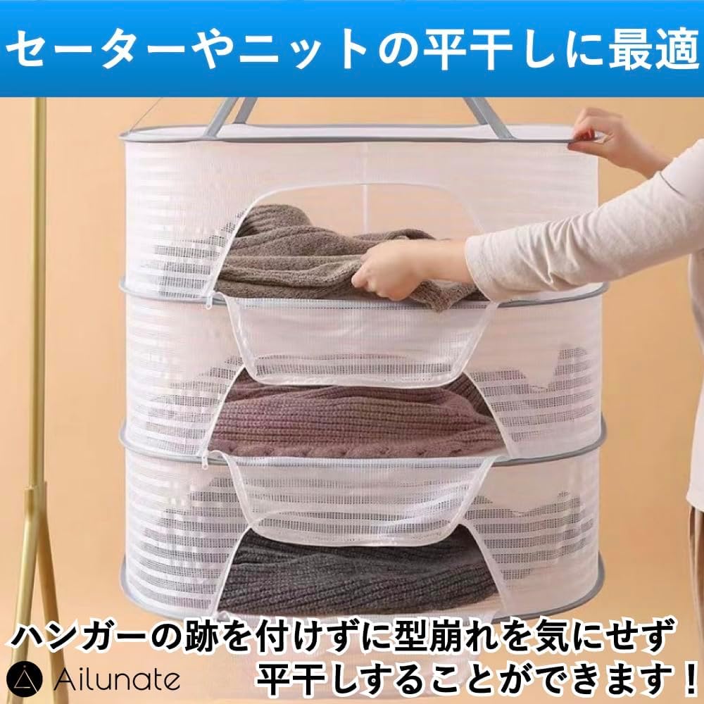 物干しネット 3段 型崩れ防止 平干しネット 折りたたみ収納 平置きネット コンパクト 防風 通気性 ニット干し 円形 干し網 落下防止 衣類変形防止 吊り下げ式フック 室内 屋外 乾燥 密閉タイプ 耐荷重高い 干しネット セーター 洗濯物 干し網 コンパクト ニット ぬいぐるみ 枕 干しネット 大容量 家庭用 (70*50cm)