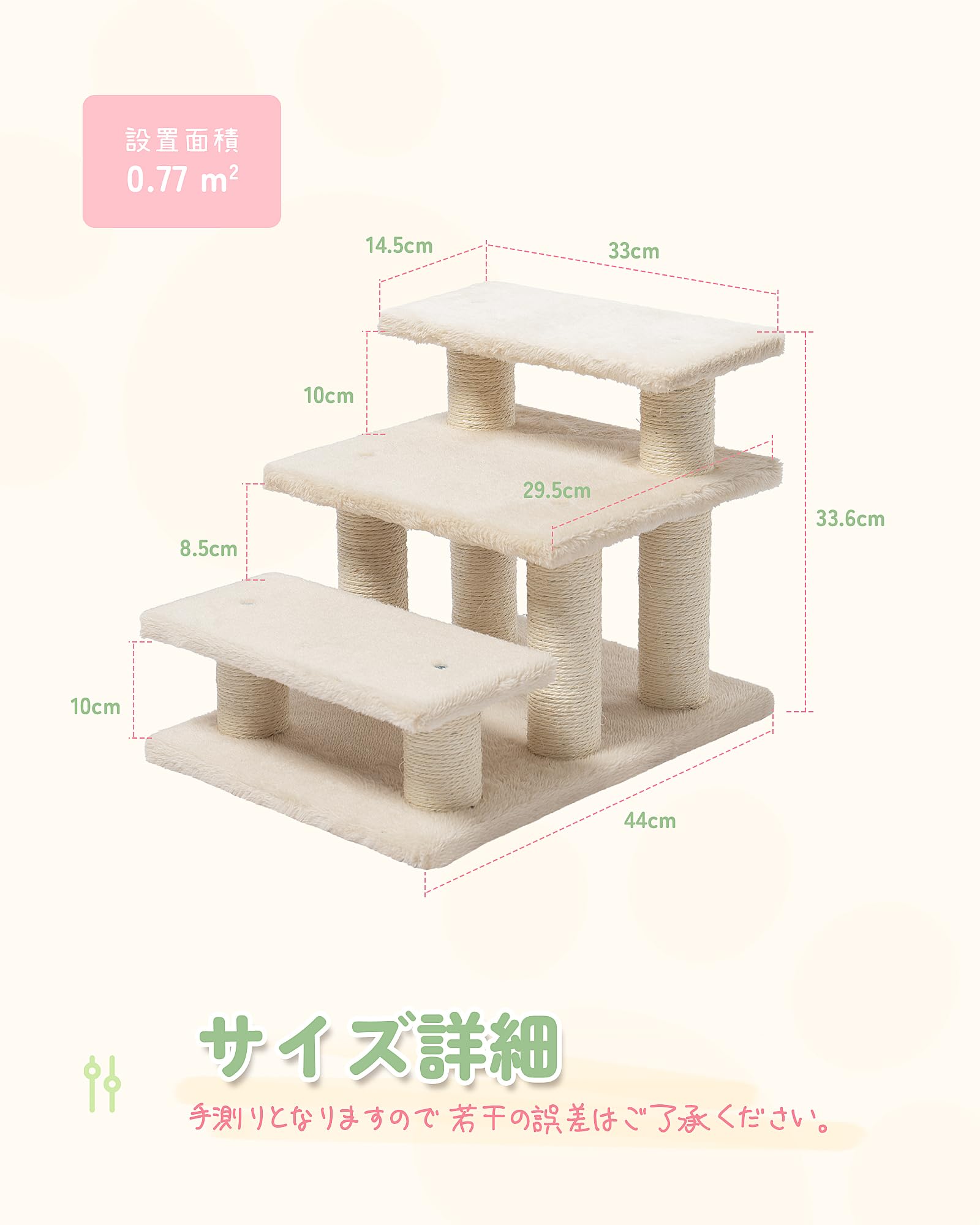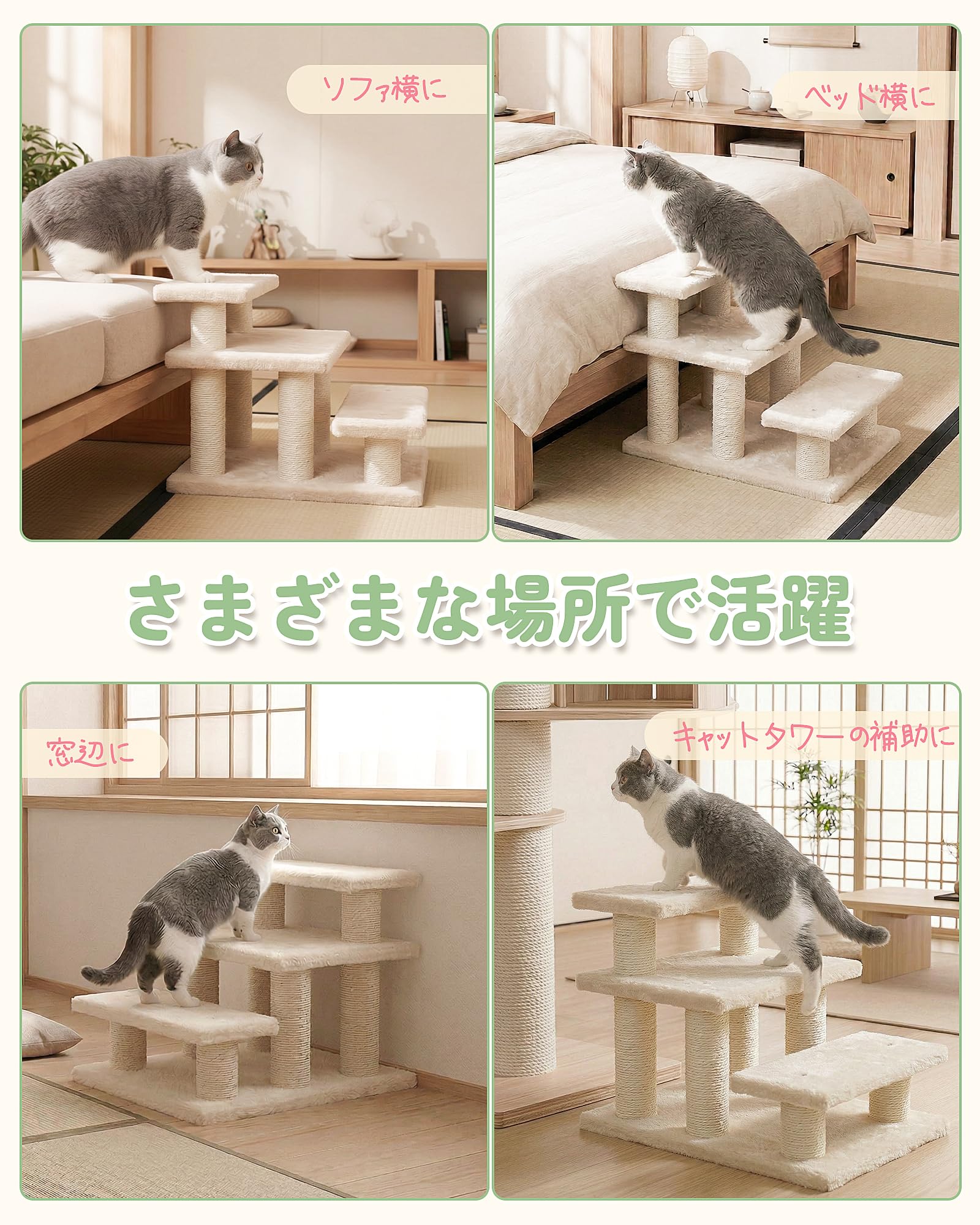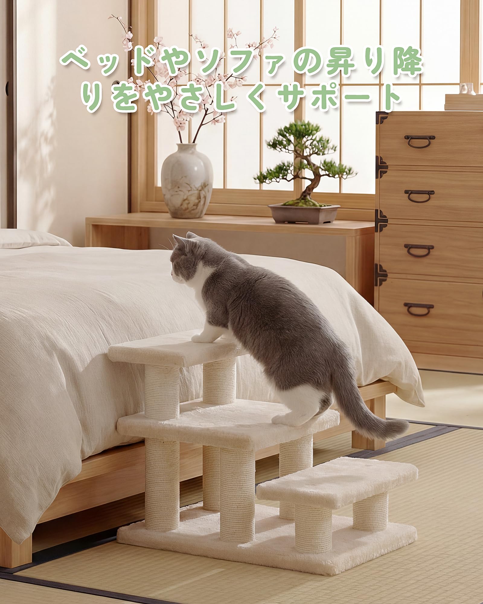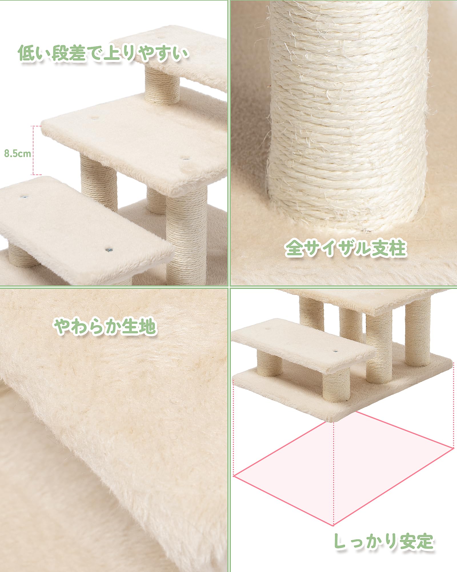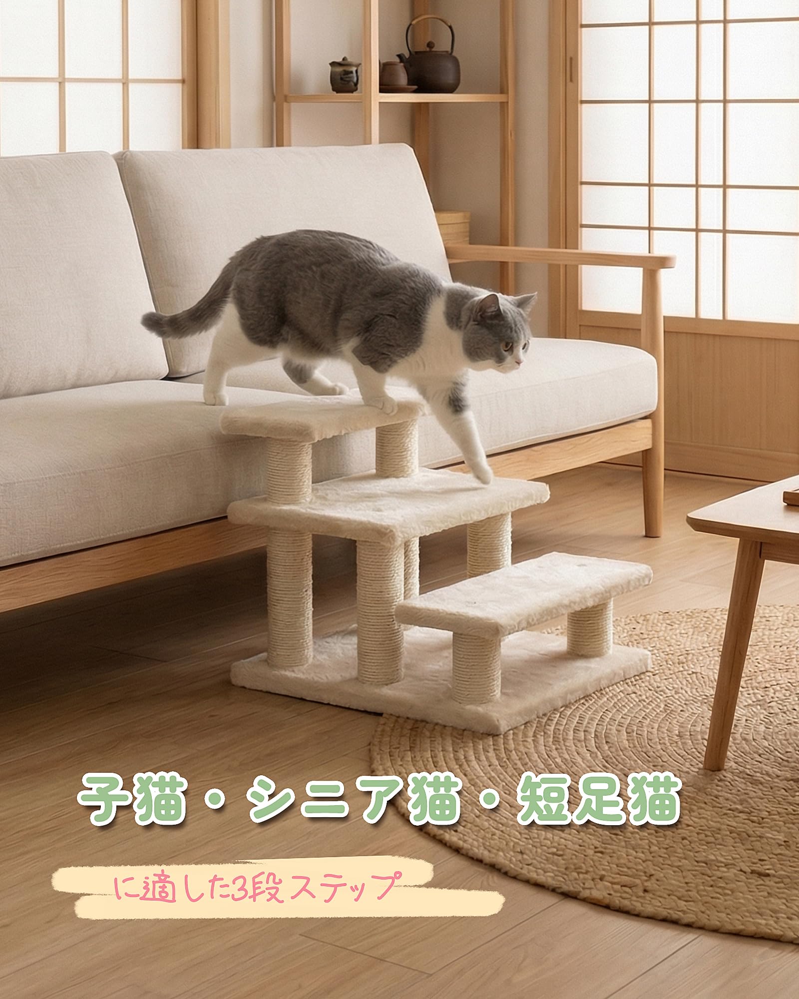 キャットタワー ミニ 低め 3段 キャットステップ 猫階段 コンパクト 老猫用 シニア対応 腰足負担軽減 小型犬ステップ ソファー階段 多用途 ベージュ