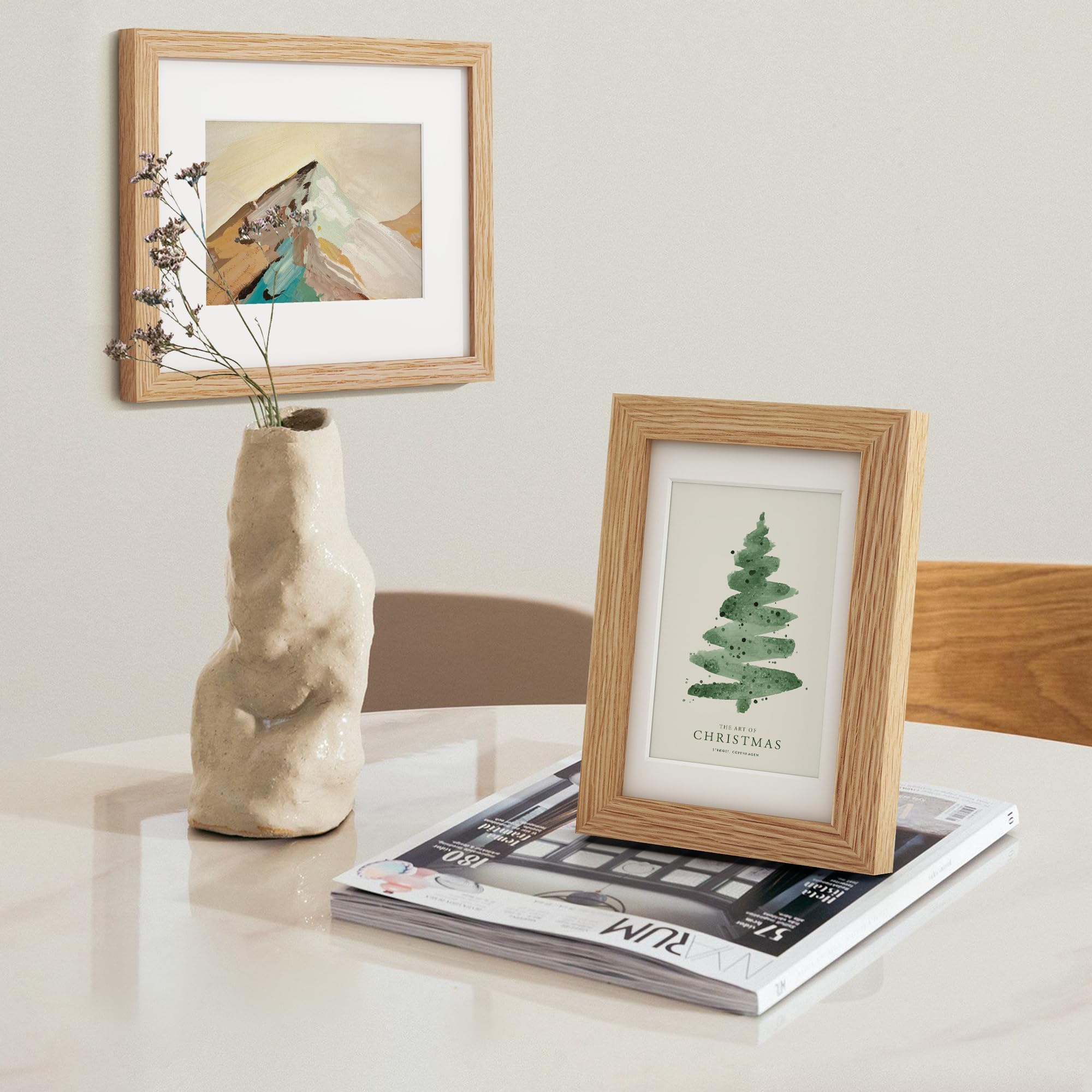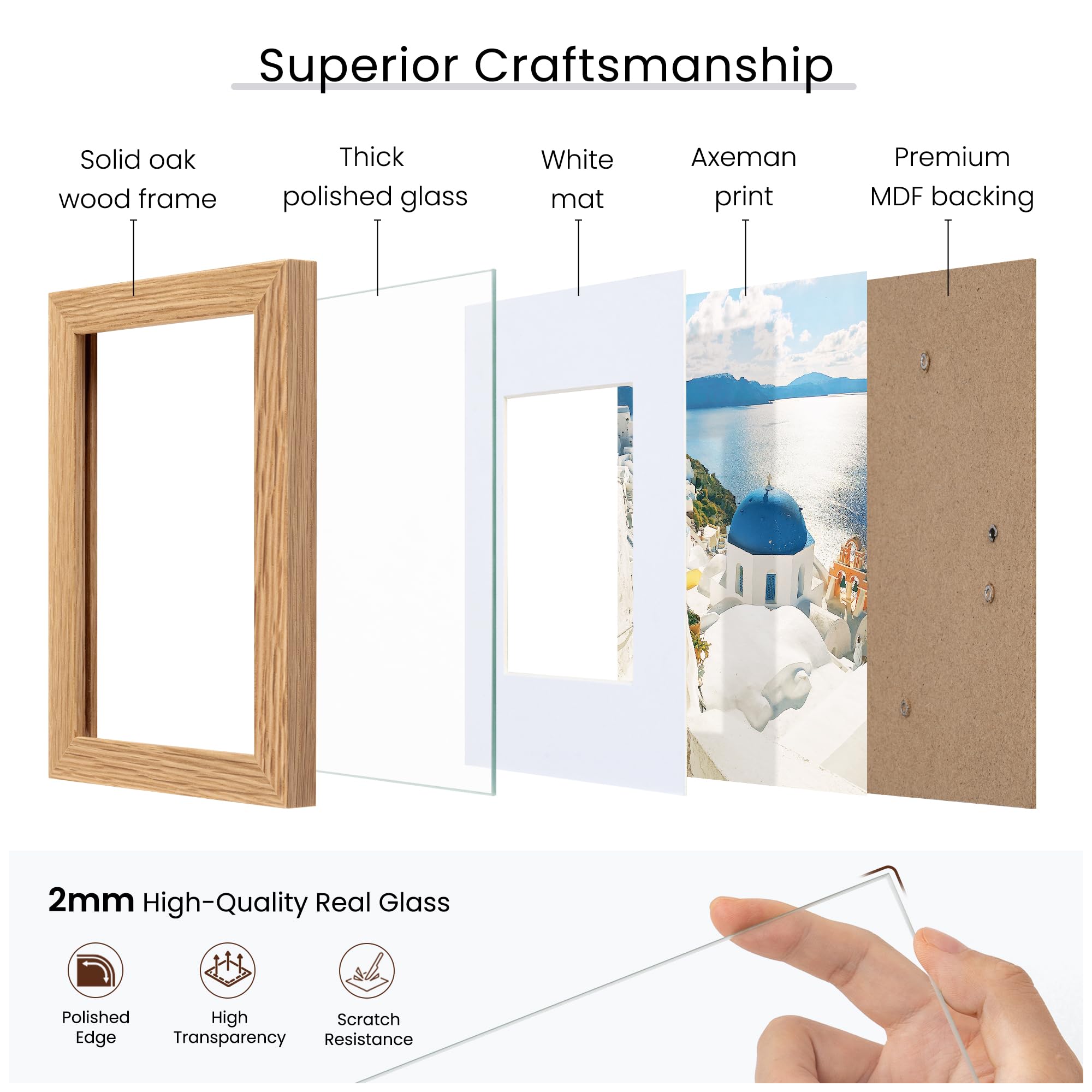 Axeman A5 オーク材木製フォトフレーム、丸みを帯びた角、ほぞ組構造、A6サイズの写真用マット付き(フレーム外寸A5)、強化ガラス、卓上飾り対応