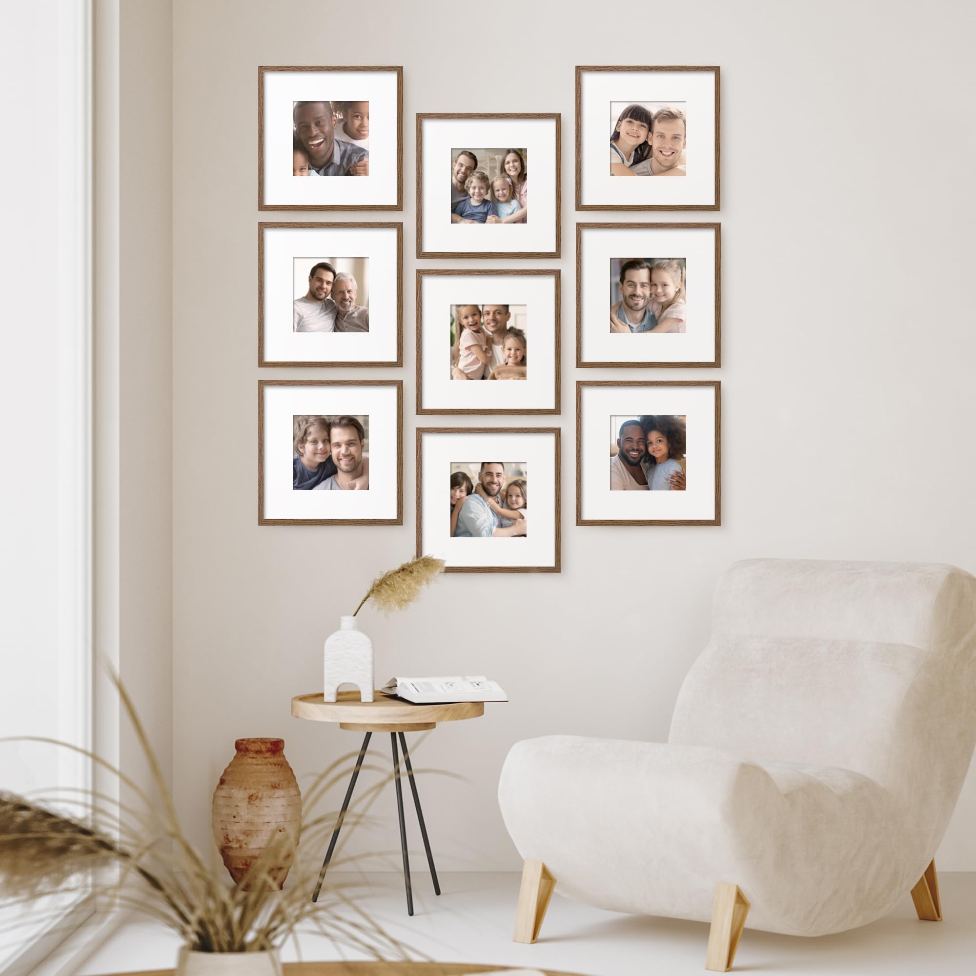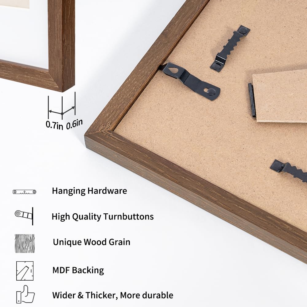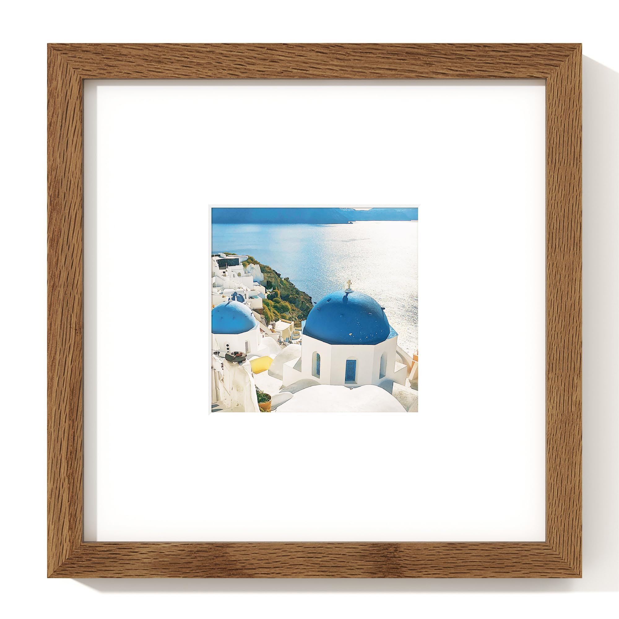 12x12インチ 正方形 オーク無垢材 フォトフレーム 8x8インチ写真用マット・強化ガラス・吊り下げ金具一式付属 ウォールナット (1個)