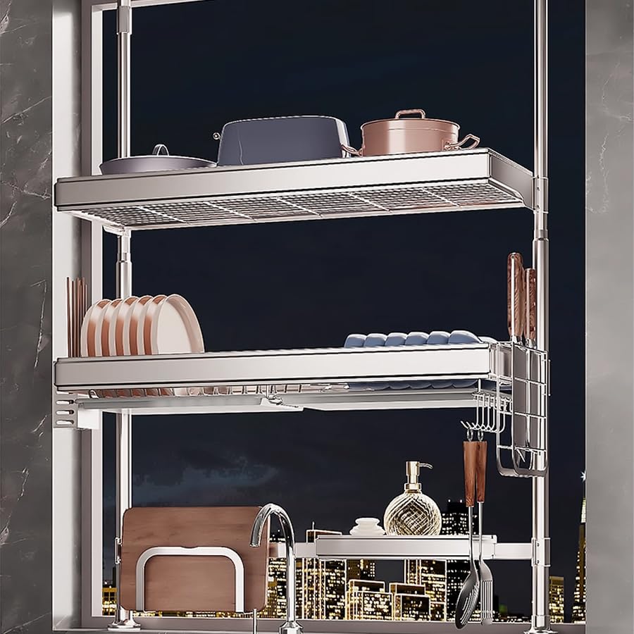 Zilnox 水切りラック シンク上 ステンレス 大容量 突っ張り 食器 水切り かご ラック つっぱり式 キッチン 省スペース 多機能収納 シルバー 2段 幅78x奥行30.5x高66.5-105CM