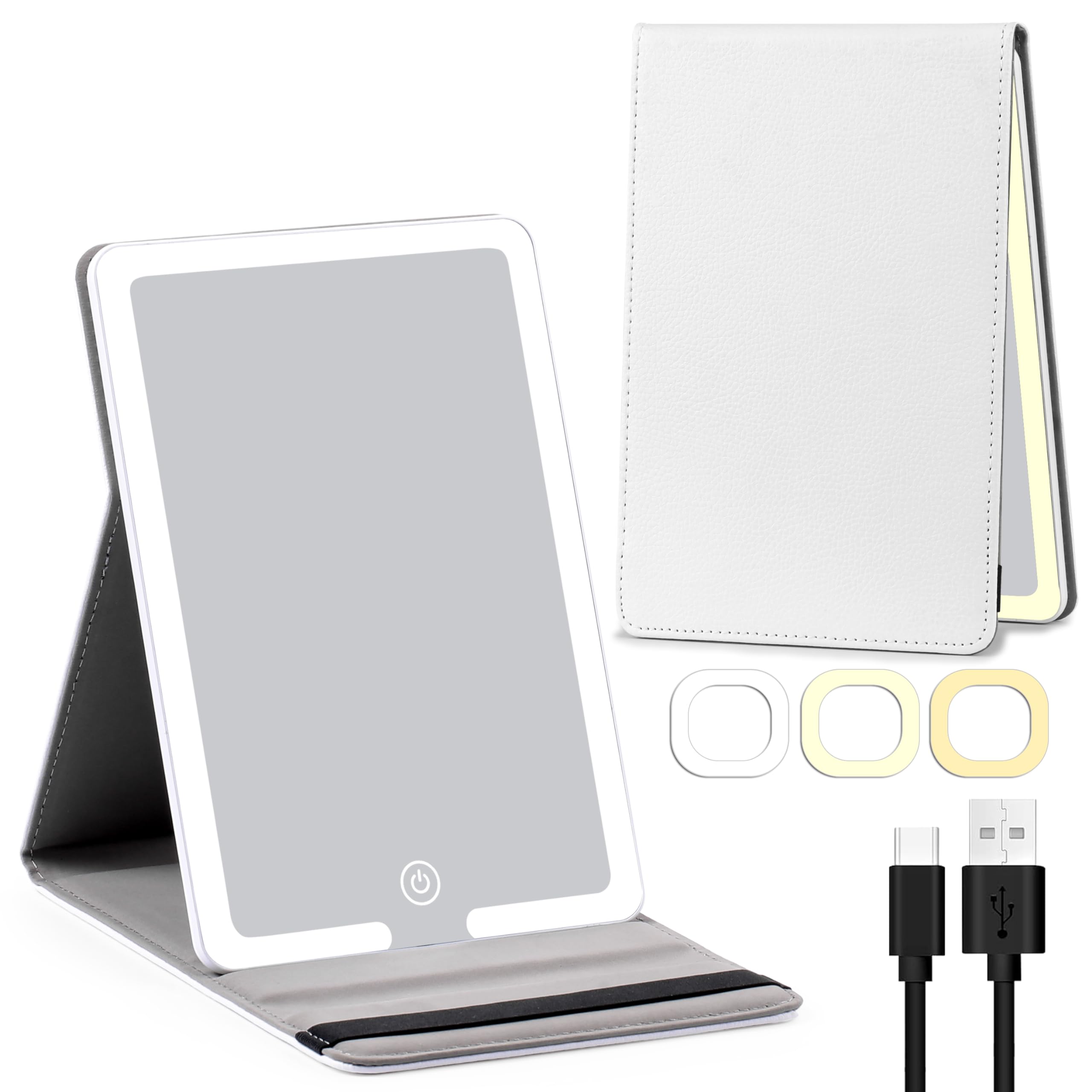 化粧鏡 ライト付きミラー 卓上鏡 バッテリー内蔵 女優ミラー 持ち歩きやすい 鏡 卓上 ライト付き 【3つ光色/無段階調光/角度調節可能/折りたたみ式/PUレザーカバー/充電式】 旅行・日常メイク・オフィスに適用 (ホワイト)