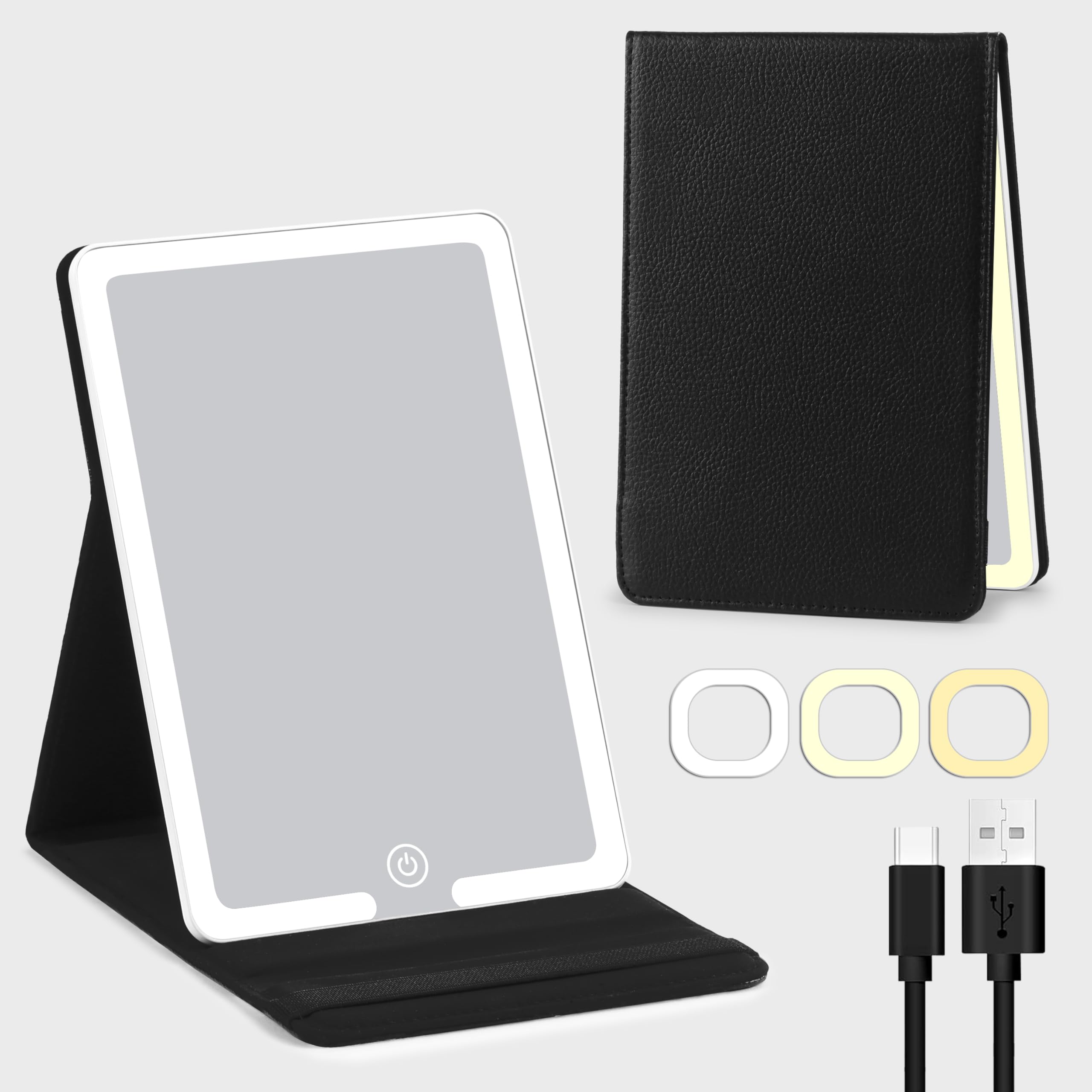 化粧鏡 ライト付きミラー 卓上鏡 バッテリー内蔵 女優ミラー 持ち歩きやすい 鏡 卓上 ライト付き 【3つ光色/無段階調光/角度調節可能/折りたたみ式/PUレザーカバー/充電式】 旅行・日常メイク・オフィスに適用 (ブラック)