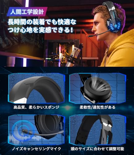 Sヘッドホンは人間工学に基づいて設計され、肌触りの良い素材で作成されているため、柔軟性と通気性に優れています。オーバーイヤー型のカップを採用し、耳に当たる部分も、耳を覆うようにホールド感に優れたクッション材を使用。装着時の圧迫感やベタつきなどの不快感もほとんどありません。耳全体をスッポリと覆う形状で、周囲のノイズをシャットダウンするため、音声がクリアに聴こえます。イヤーカップはレコードの盤面のような模様です。手触りはサラサラしていて光沢素材のように指紋や皮脂が付着しません。質感も非常によく、高級感のある見た目です。360度回転可能マイクにはノイズ防止技術を利用して、高品質の通話体験を与えることができます。耐用材料で制作したマイクは勝手に曲げます。卓越な50mmオーディオドライバを採用して、高品質の3D低音サラウンド音とミックス音効果を顕著に現れる。きれいな音の中でゲームの楽しさを自由に享受してください!