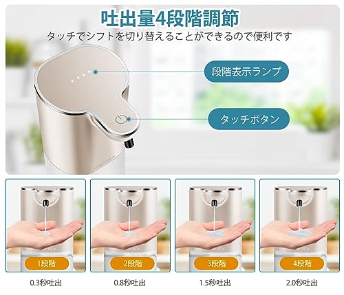 4段階調節機能があり、自分に合った吐出量を選ぶことができる。スイッチを入れてタッチボタンに軽く触れ、ランプの数に応じて何段目かを確認します。