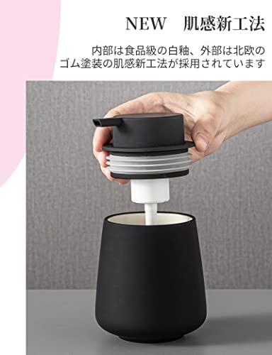 【NEW肌感新工法】本ソープディスペンサーのボトルは高品質のセラミックで作られ、内部は食品級の白釉、外部は北欧のゴム塗装の肌感新工法を採用しています。肌のような質感で肌触りがとても心地よいし、彩度の低い色で、癒しとリラックス感を与えます。また、底部もゴム塗装で覆われています。台に傷つけることがありません。