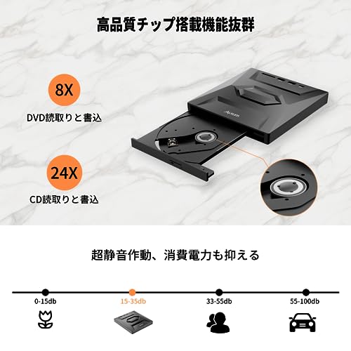 Alxum ラップトップ用外付けCD DVDドライブ、Type-C USB 3.0ポータブルCDバーナーライター、SDスロット&USBポート付き DVD 8倍速 CD 24倍速 超高速 CD/DVDリーダー Window/Mac OS/Linux/Vista用
