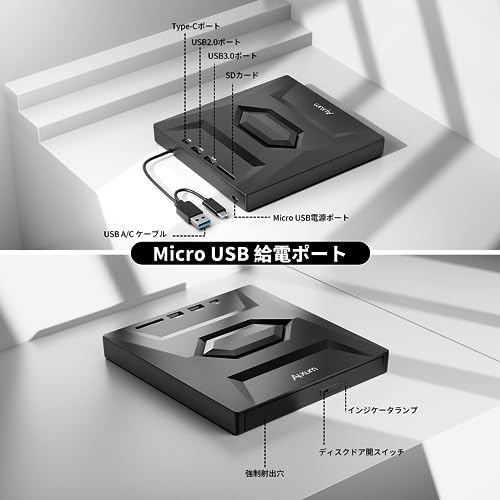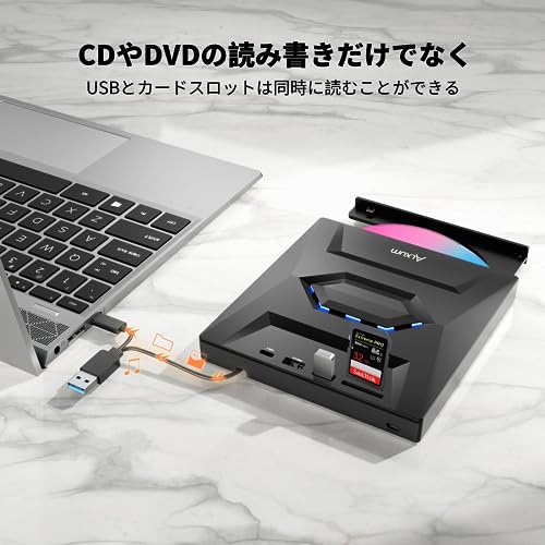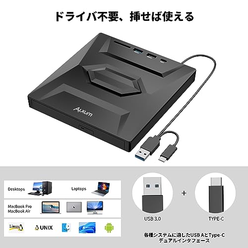 Alxum DVDドライブ 外付け DVD 8X CD 24X 超高速データ入出力USB3.0&Type-C両接続外付けdvdドライブSD/TFスロット&USBポート付き対応 Windows/Desktop/Linux/Vista/Imac/Macbook