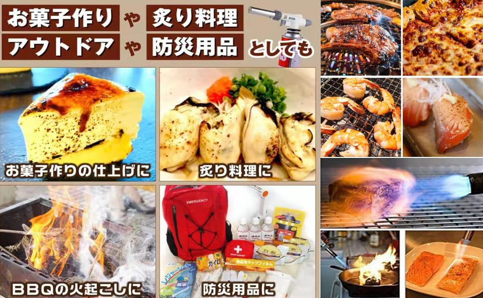 BBQの炭火起こしや、料理の焼き目付けにも、DIY作業での溶接作業にも。炙り料理、アウトドア料理、寿司ネタのあぶり、キャンプクッキング、ロウ付、塩ビパイブ曲げ、グラタンの焦げ目付などに役立ちます。