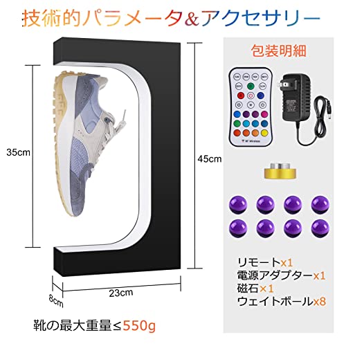 BAOSHISHAN浮揚靴ディスプレイ 磁気スニーカーディスプレイ 磁気浮上ディスプレイスタンド フローティングシューズディスプレイ 靴専用ディスプレイ 360°回転 LEDライトが付き フローティンディスプレイスタンド 吊り下げ式ディスプレイスタンド200-550g調整でき お靴屋の商品展示とプロモーションに適用110V (黒い)