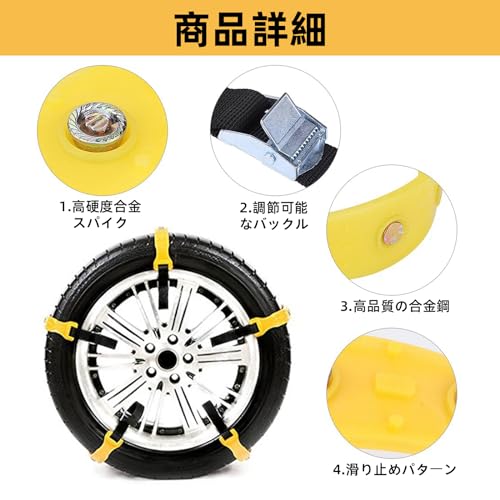 硬いスバイクピンと滑り止めのネットパターンを採用で安定走行を保証し、雪道上にも安心、安全に運転させます。高剛性合金釘で車両の接着力を向上させ、スリップを防止できます。特に、雪道とぬるかみの状態に、タイヤ保護、空回り防止、安定走行に役立ちます。