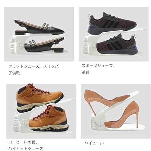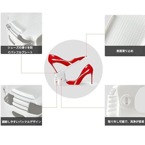 特徴ダブルデッキシューズラックのデザインは、収納容量を50%節約し、靴を順番に収納するのに役立ちます。2.7インチから7.2インチまで4段階の高さ調節が可能で、ほとんどのスポーツシューズ、スリッパ、フラットシューズ、ハイヒールなどに適しています。高級プラスチック製で、丈夫で壊れにくいです。靴が滑り落ちるのを防ぐために、表面上の小さな凹凸と一緒に、後ろと両側にトップフラップ。寝室、ワードローブ、シューズラック、シューズクローゼットなどに非常に適しています。仕様項目名前: 靴スロット オーガナイザー色: 黒、白(任意)材料 プラスチック高さ調節可能: 7cm - 18.5cm / 2.7" - 7.2"ベースサイズ: 25.5cm x 8cm / 10" x 3.1"ご注意異なるディスプレイの設定のための手動測定とわずかな色の変化に起因する1〜3センチメートル(0.4-1.18 ")の違いを許容してください。パッケージに含まれるものパッケージが含まれています:10 *クローゼット用シューズオーガナイザー