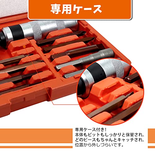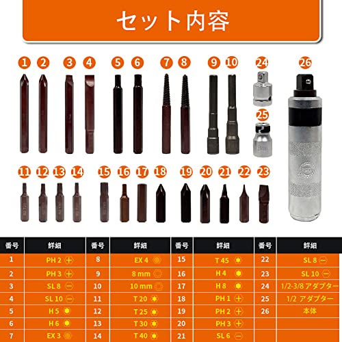 AKMネジとり インパクトドライバーセット ショックドライバー S2合金鋼バイク 車 機械修理 ネジ外し26点セット :AKMインパクトドライバーセットは高材質のS2合金鋼が採用され、衝撃耐性や靭性に優れています。【セット内容】プラスビット:PH1(36mm)・PH2(36mm、80mm)・PH3(36mm80mm)・PH4(36mm)の計6点;マイナスビット:SL5(36mm)・SL6(36mm)・SL8(36mm、80mm)・SL9(36mm)・SL10(36mm、80mm)の計7点;ヘックスビット:H4(36mm)・H5(36mm、80mm)・H6(36mm、80mm)・H8(36mm)の計6点;逆タップ:EX3(76mm)・EX4(76mm)の計2点;ソケット:8mm(80mm)・10mm(80mm)の2点;アダプター:1/2ビットアダプター・1/2→3/8転換アダプターの計点;本体1点;合計26点。このワンセットで様々な場面に対応できます。