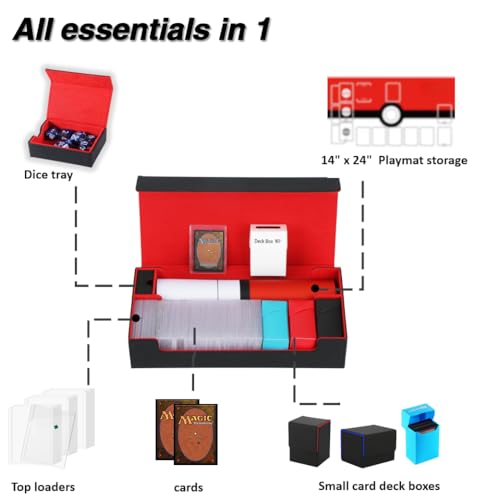 一つでトレーディングカードゲームに必要なプレイマット、サイコロ、ダイス、トークン、ダメージカウンター、マーカー、コイン、そして80+や100+のデッキケースを最大5個まで一括して保管可能。ゲームの準備や後片付けが効率的に。